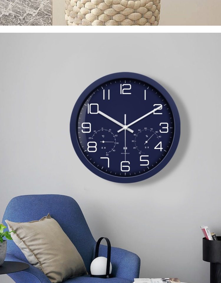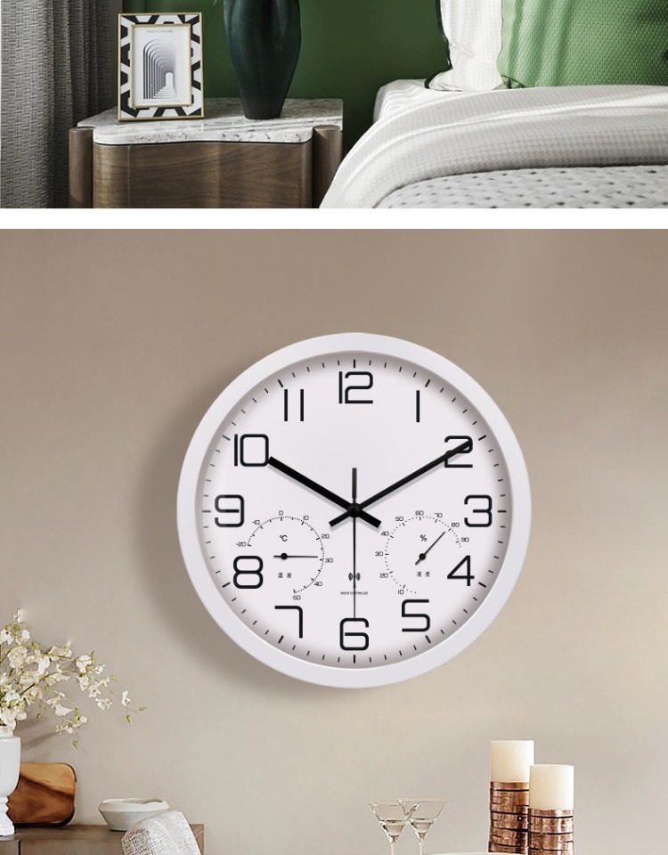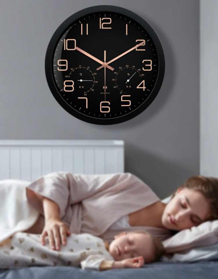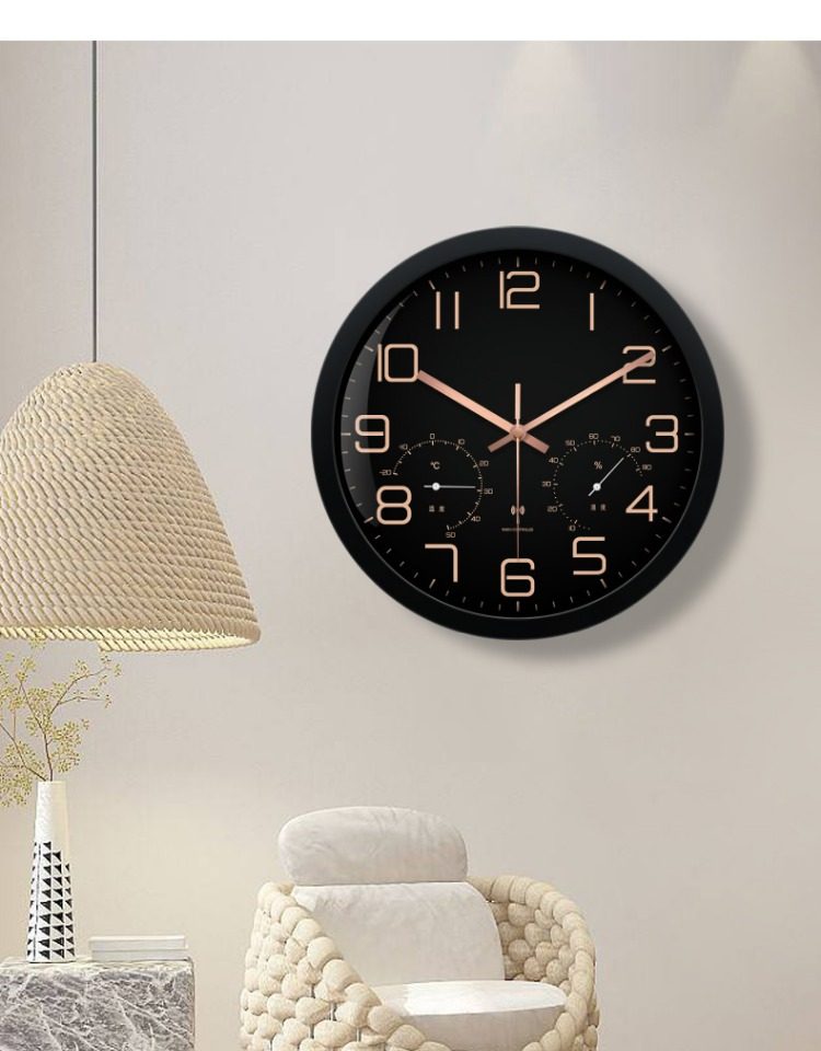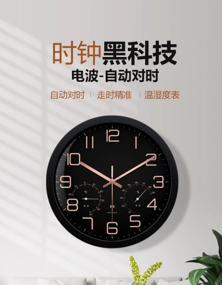 No-Drill Clock Wall Clock for Living Room, Round Temperature and Humidity Automatic Time Adjustment Electronic Clock, Wall-Mounted Quartz Clock