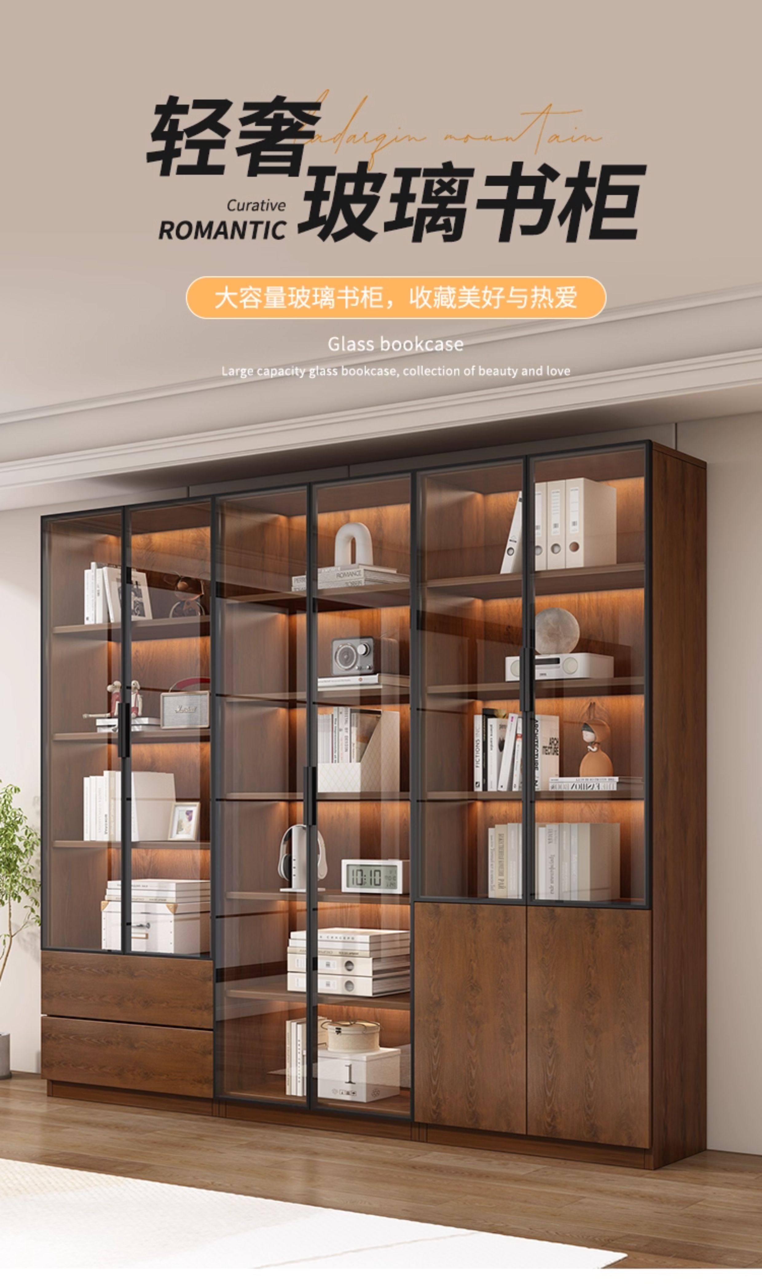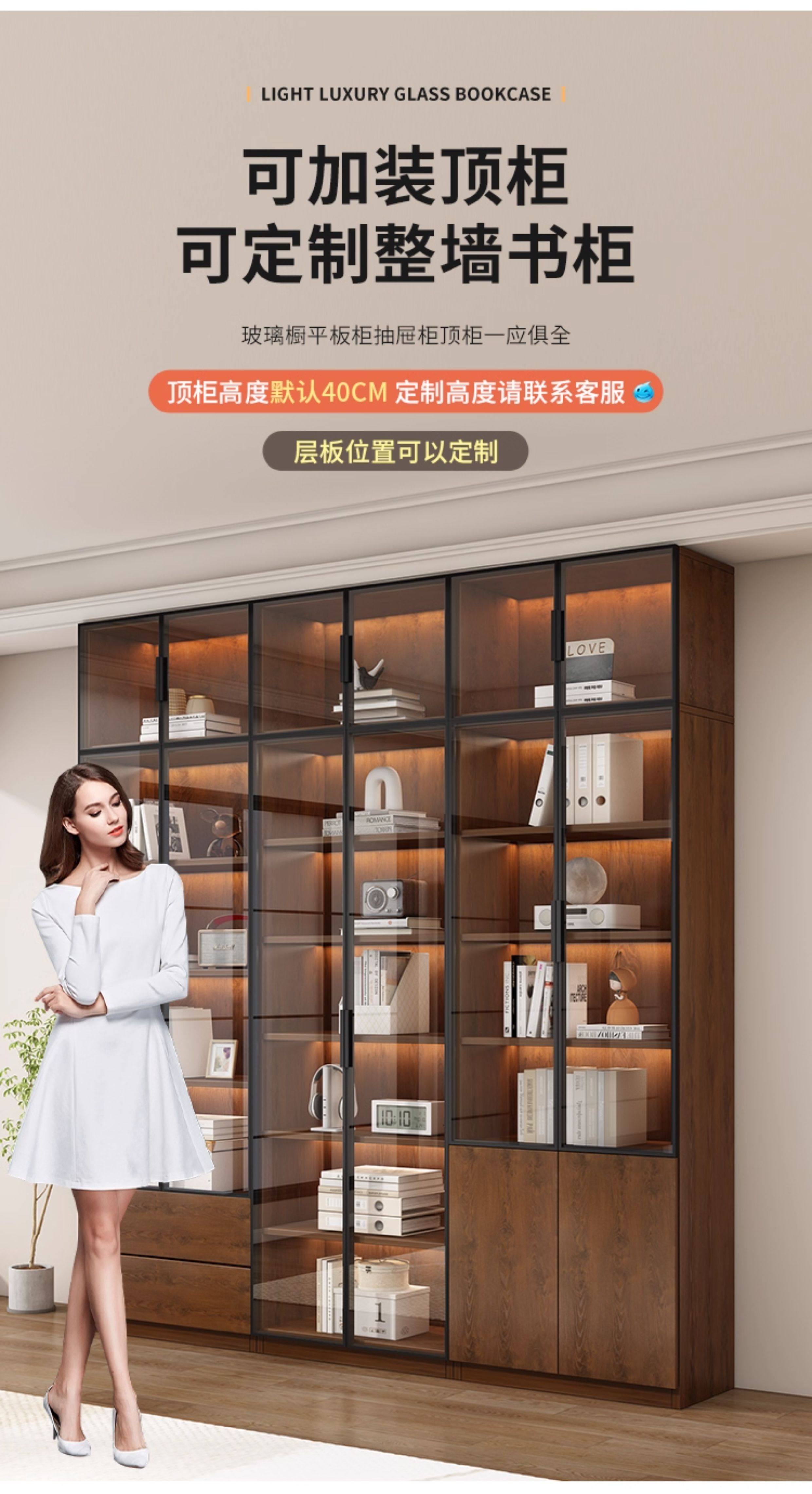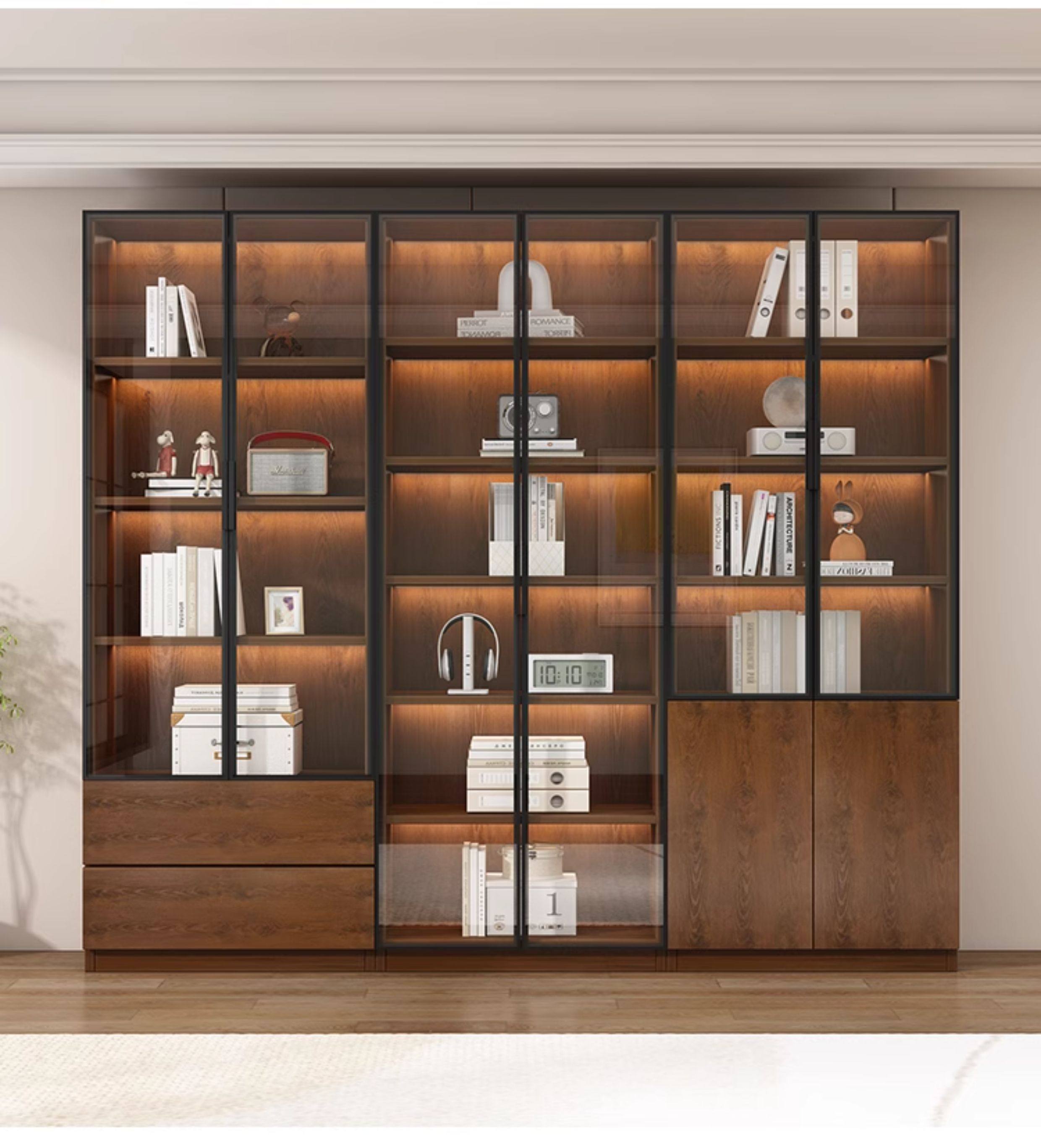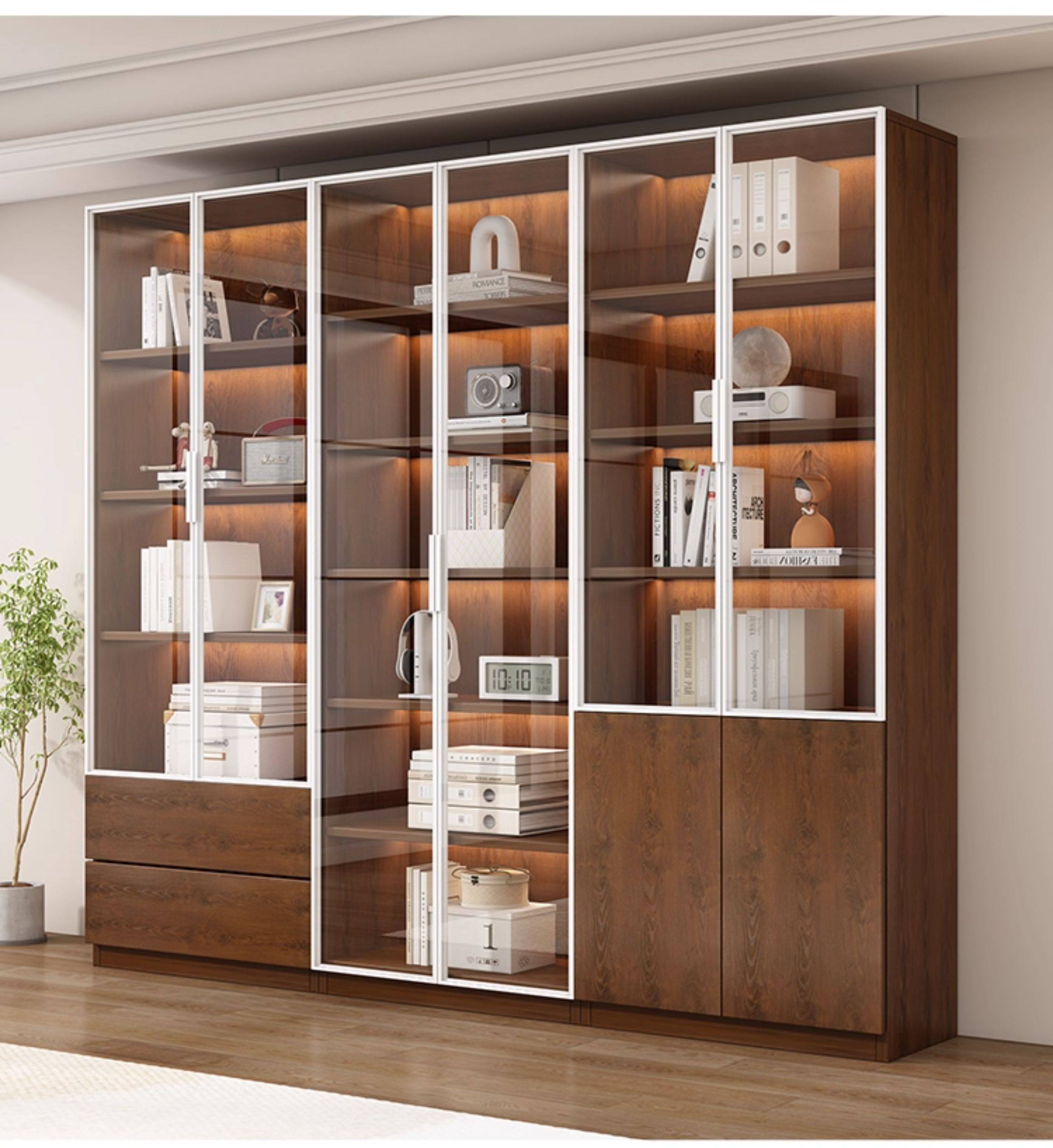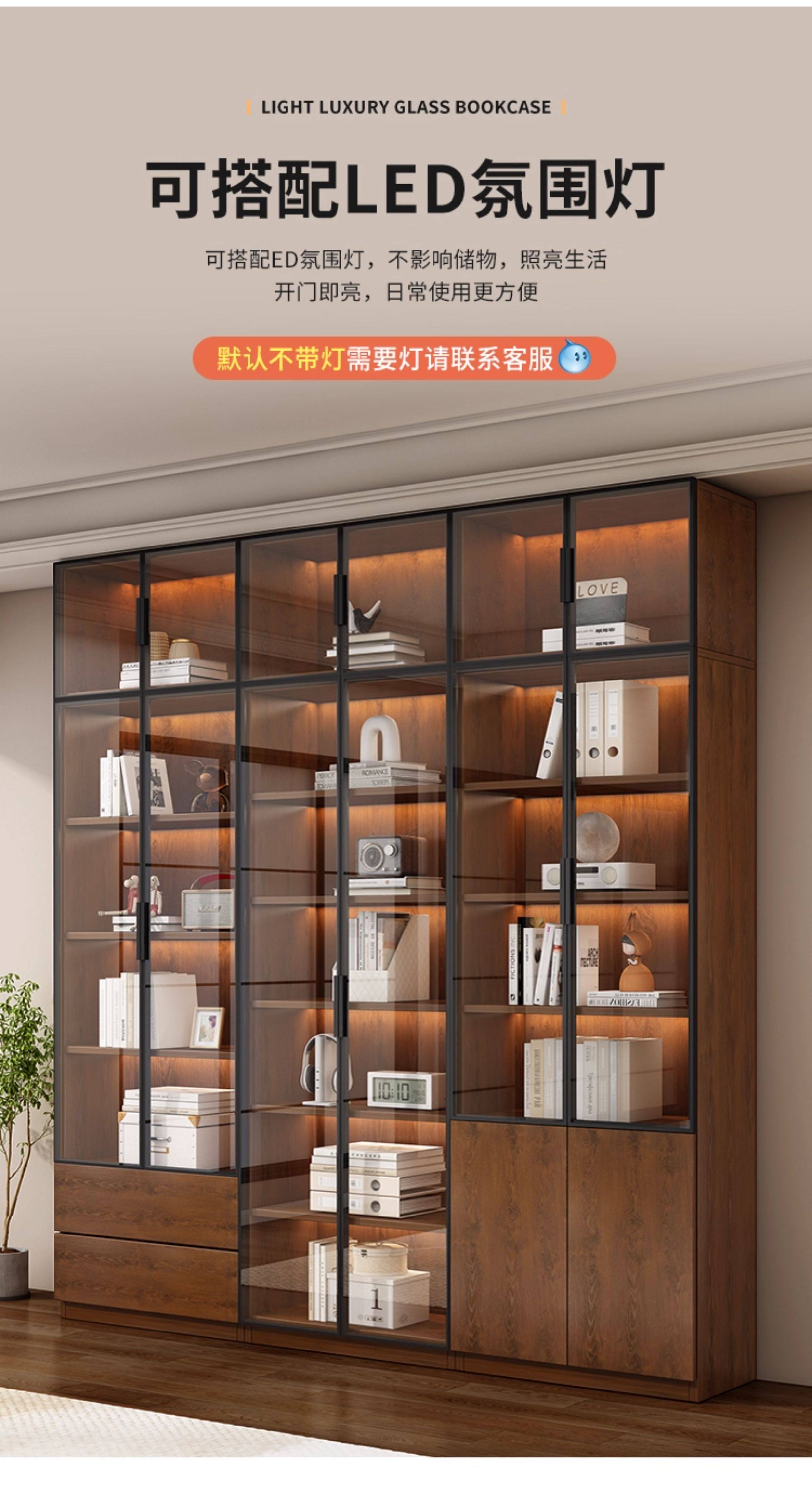 Walnut-Colored Bookcase with Glass Doors, Display Wine Cabinet, Light Luxury Home Living Room Solid Wood Integrated Wall-To-Ceiling Bookshelf