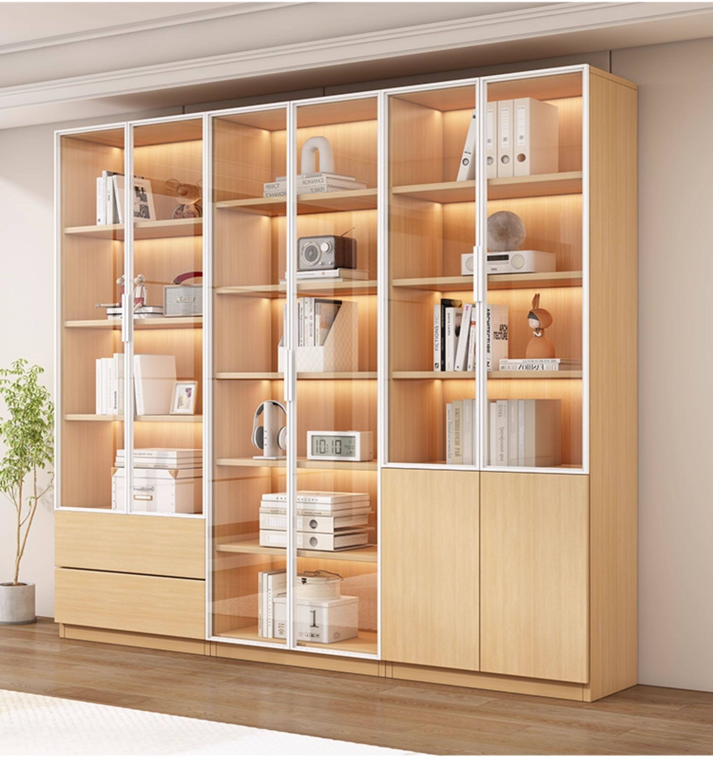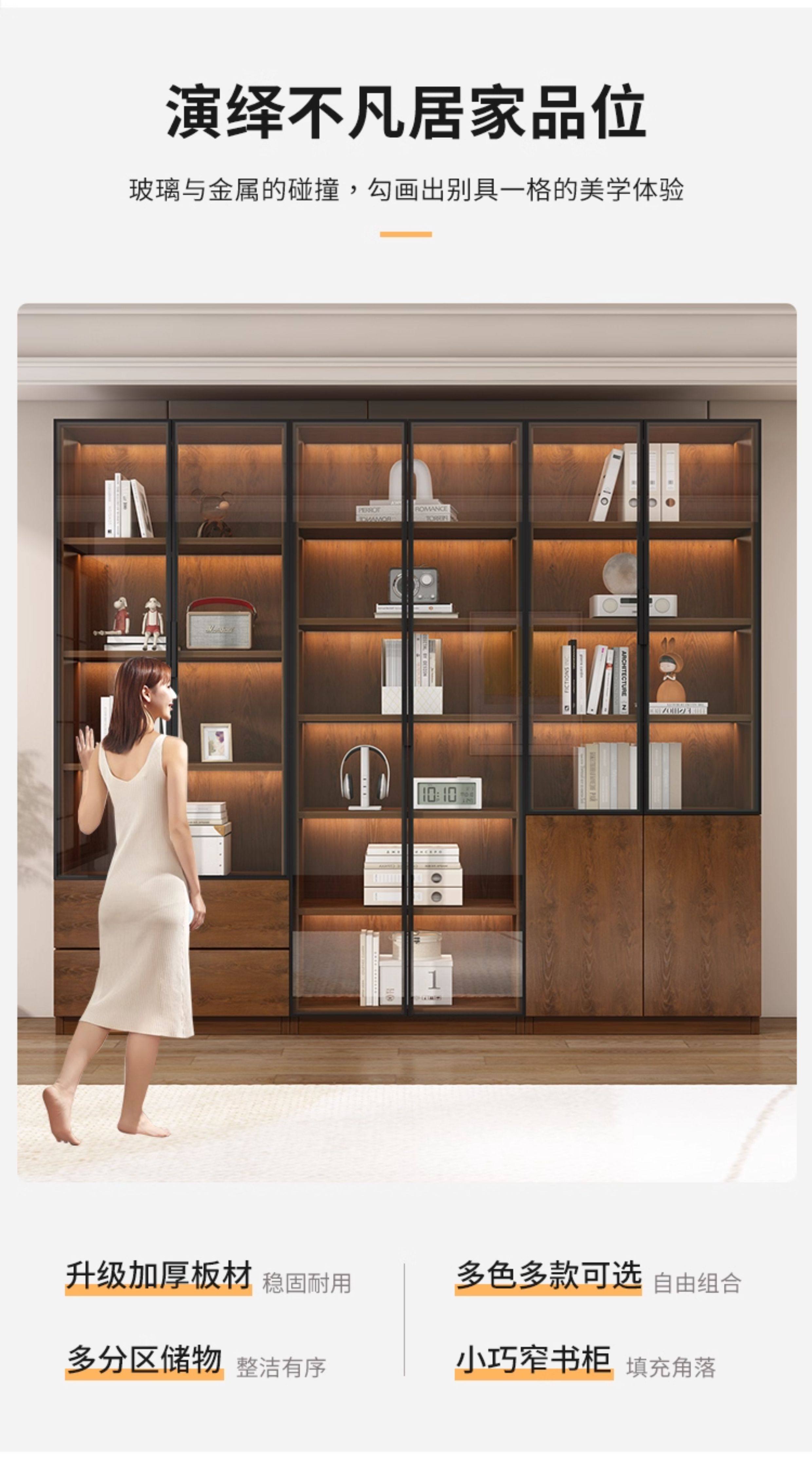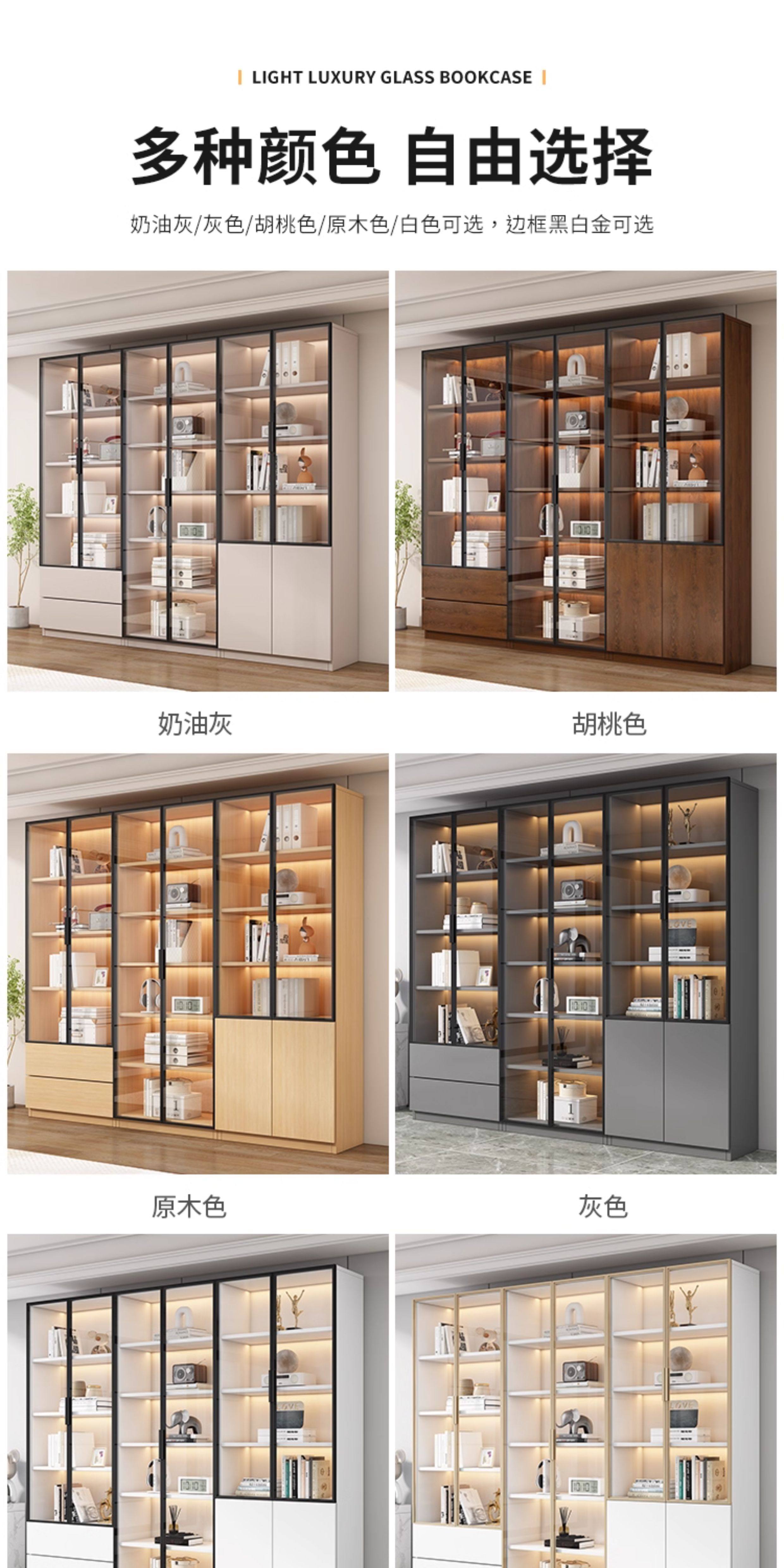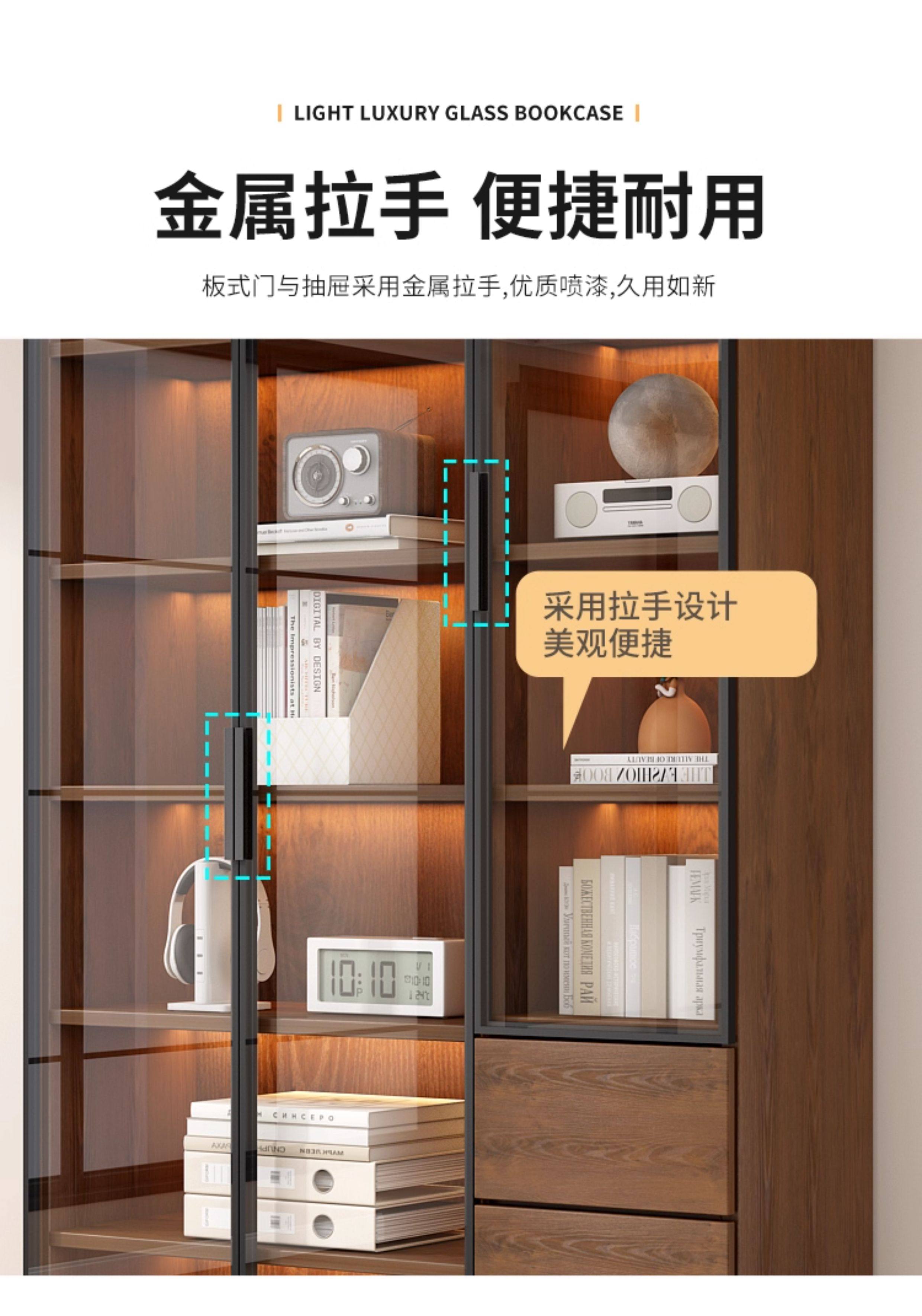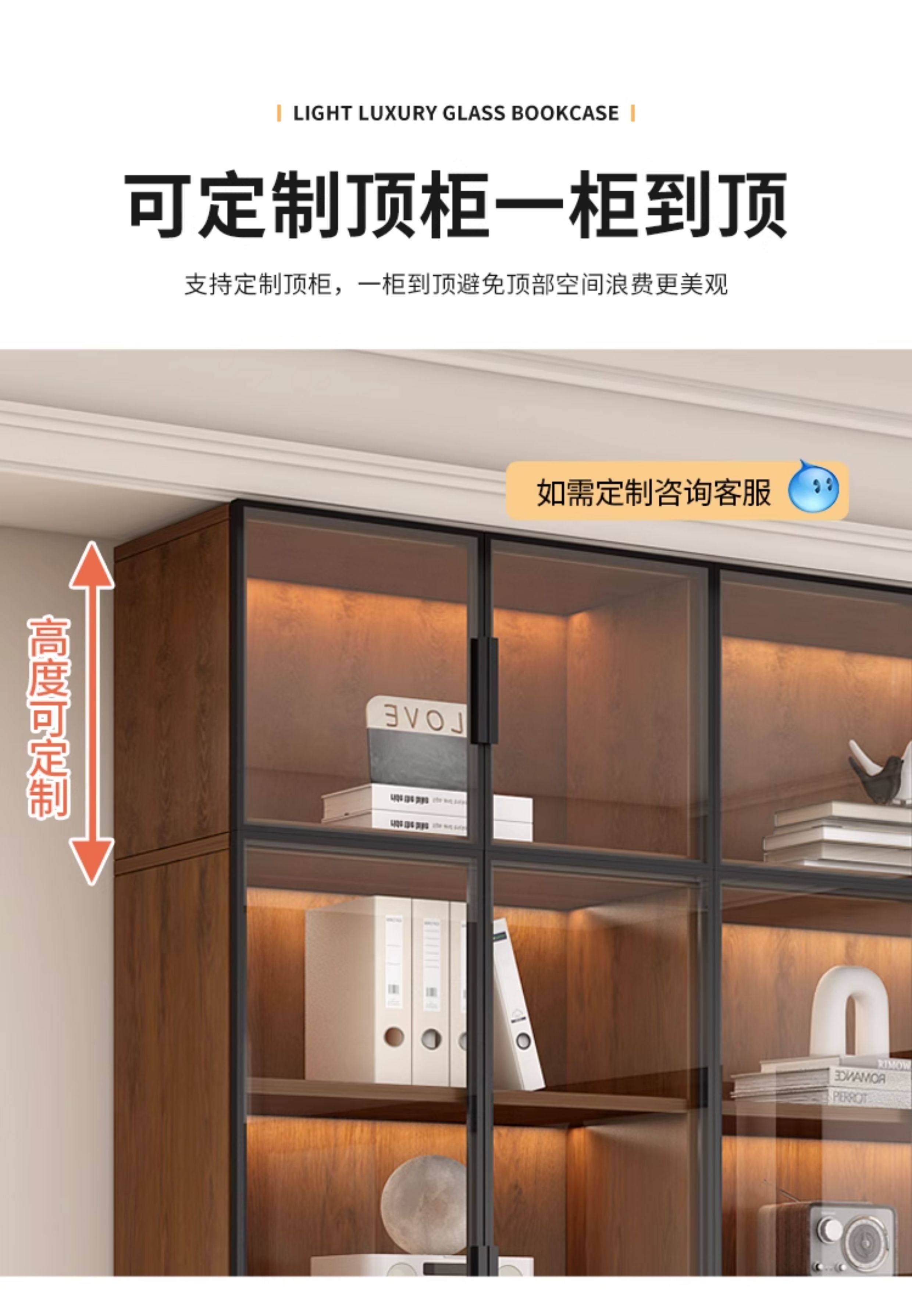 Walnut-Colored Bookcase with Glass Doors, Display Wine Cabinet, Light Luxury Home Living Room Solid Wood Integrated Wall-To-Ceiling Bookshelf