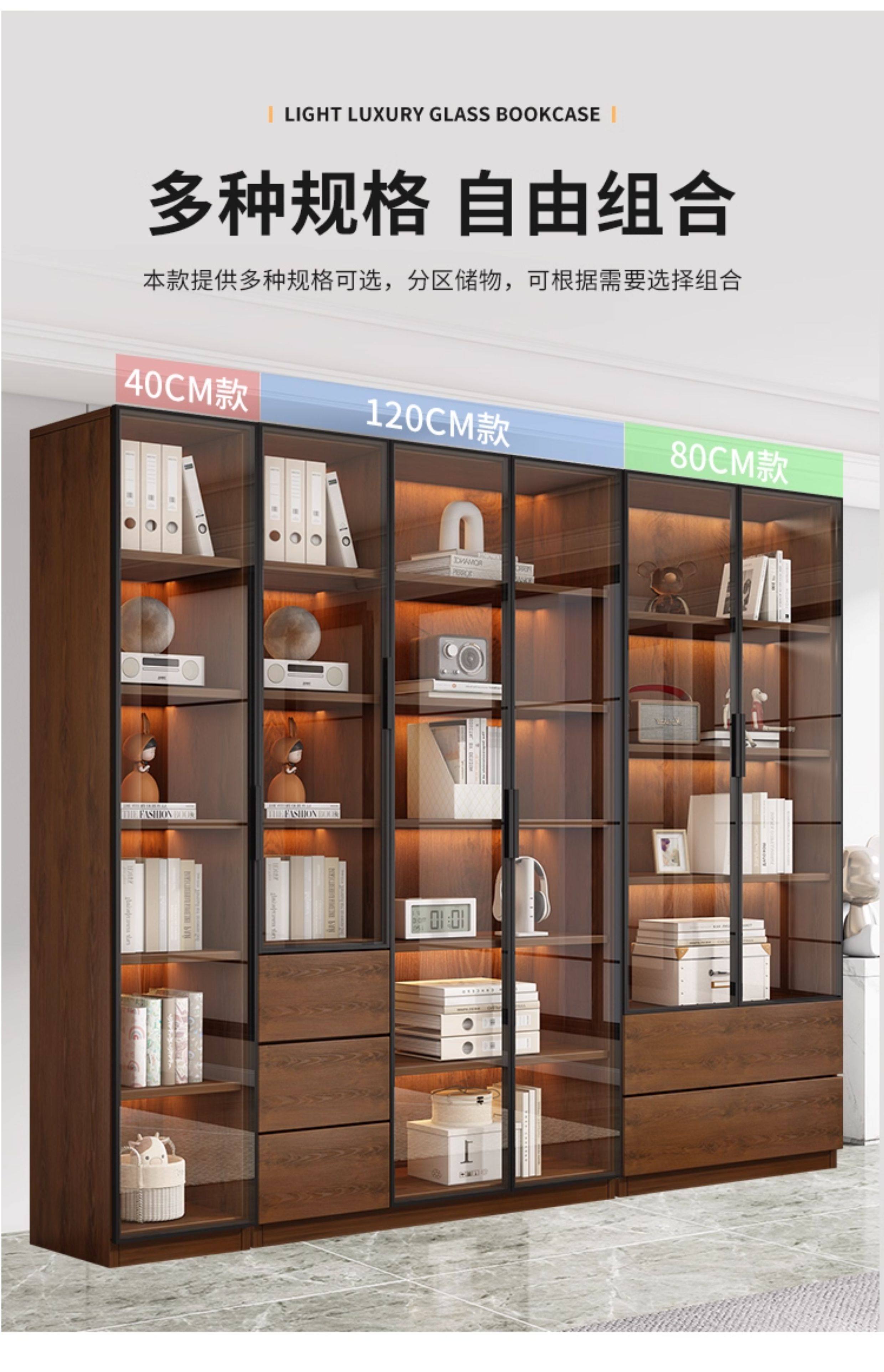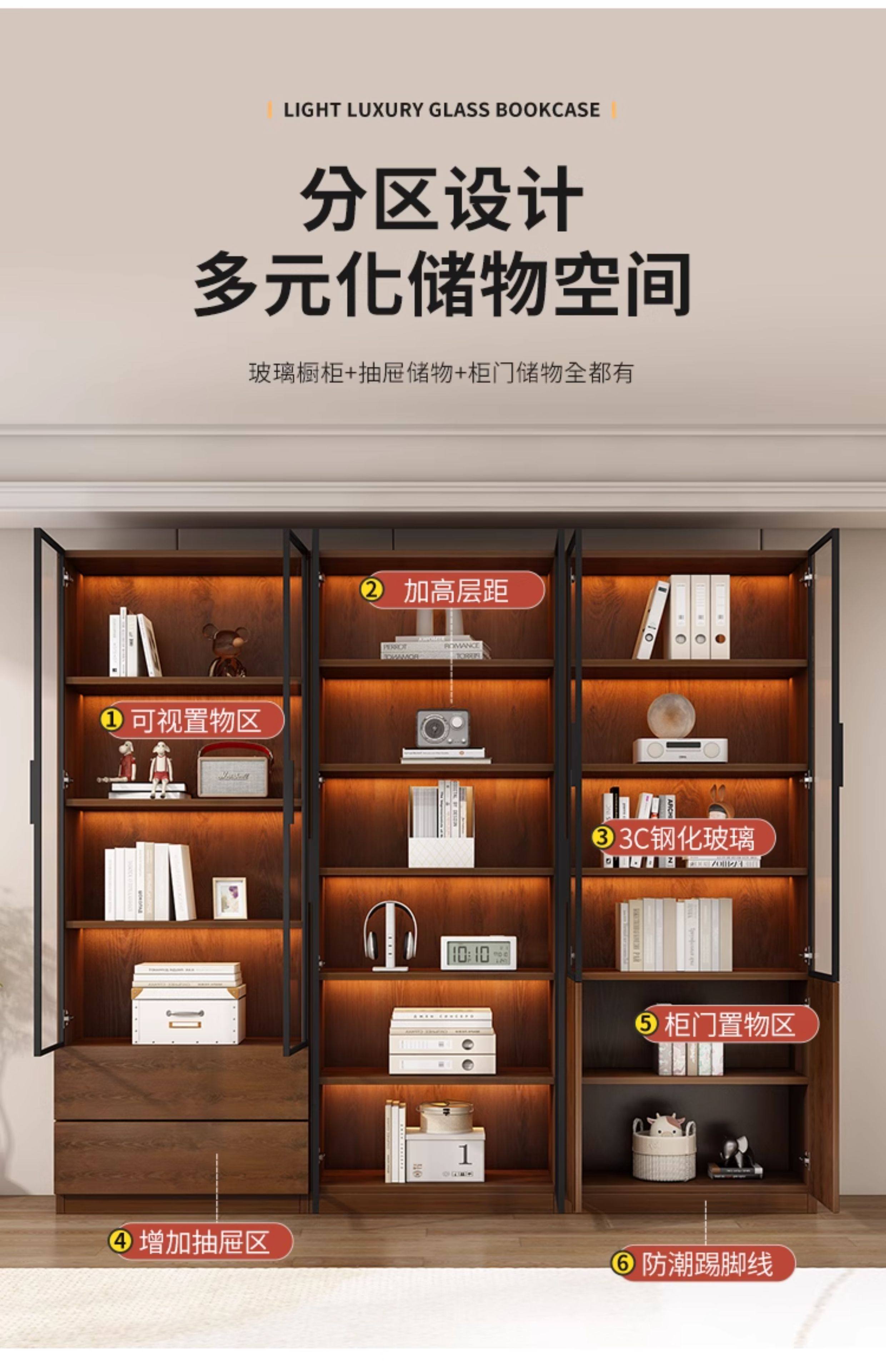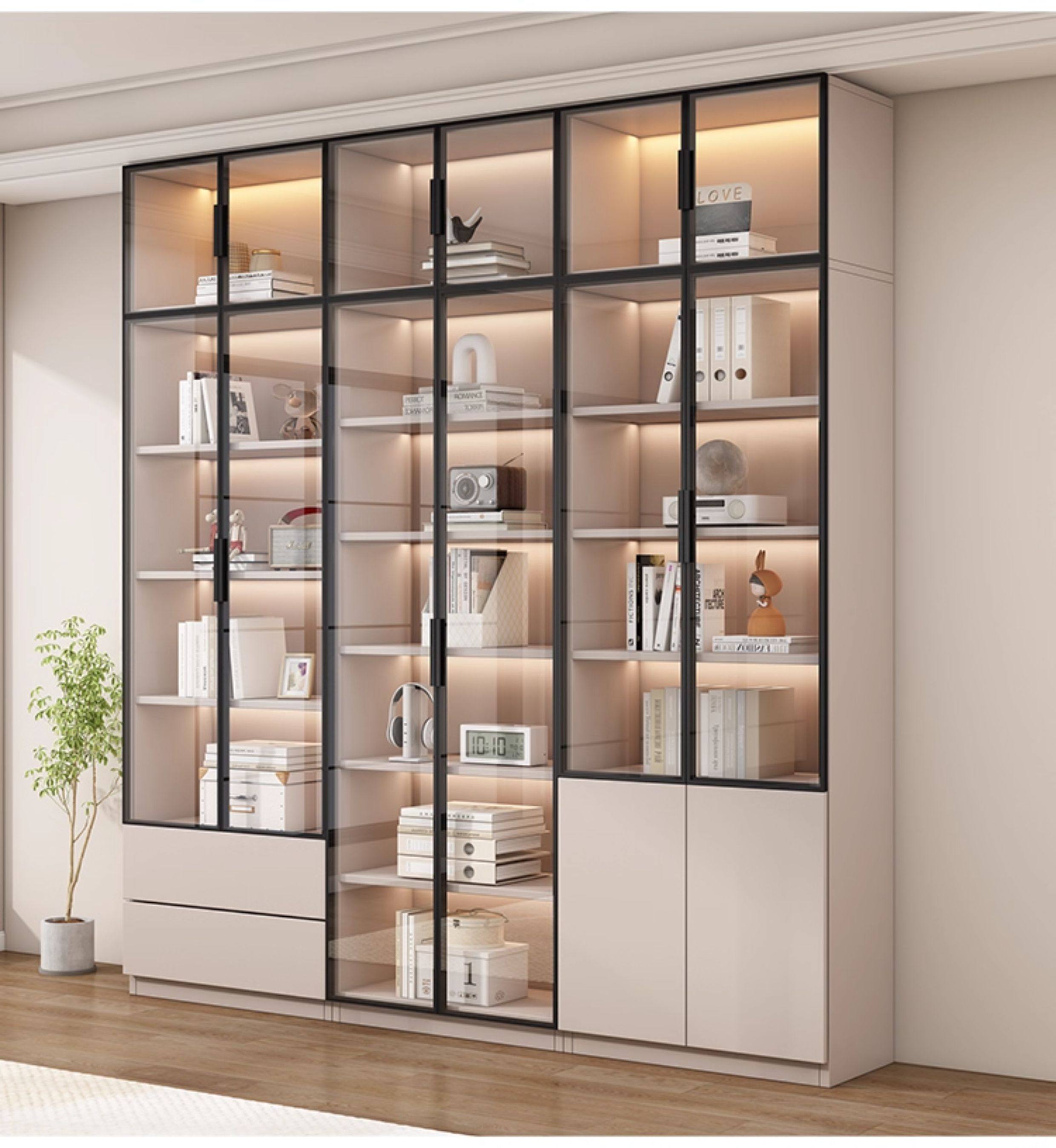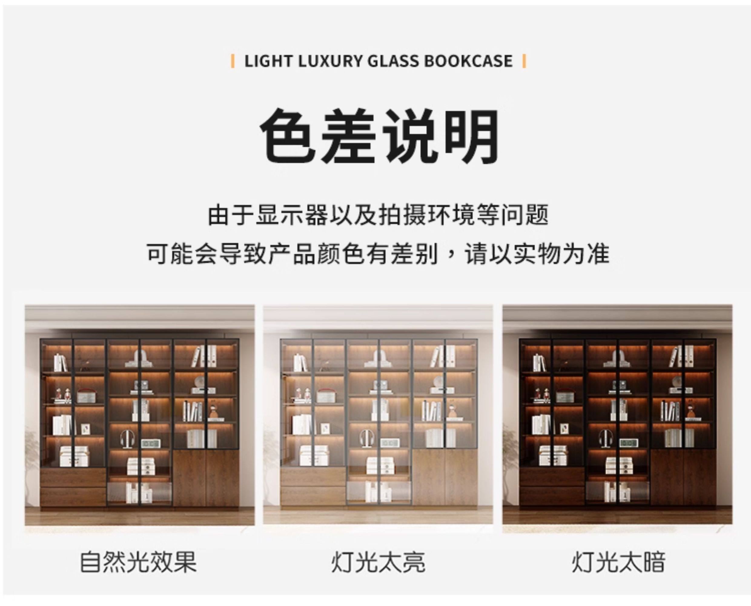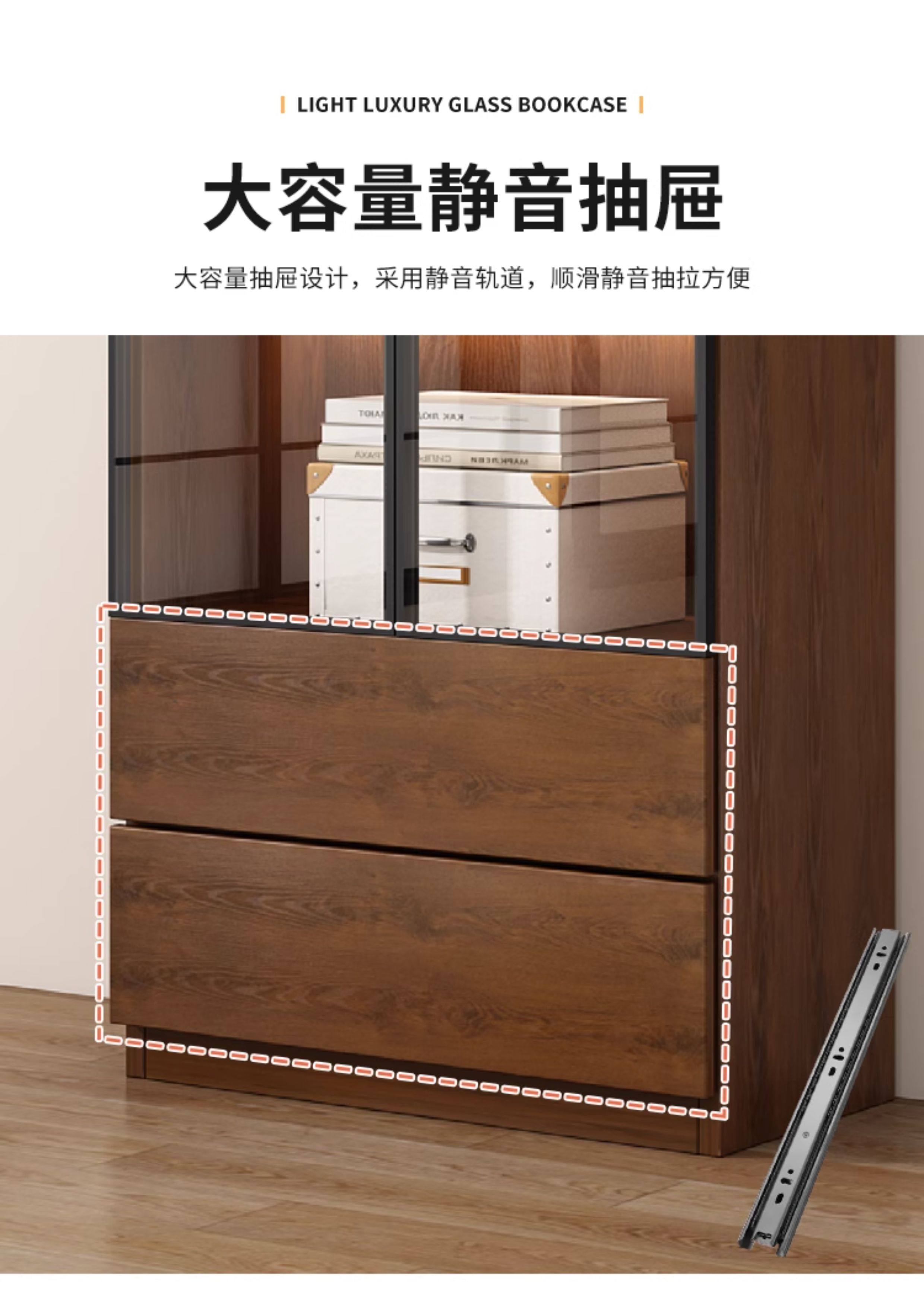 Walnut-Colored Bookcase with Glass Doors, Display Wine Cabinet, Light Luxury Home Living Room Solid Wood Integrated Wall-To-Ceiling Bookshelf