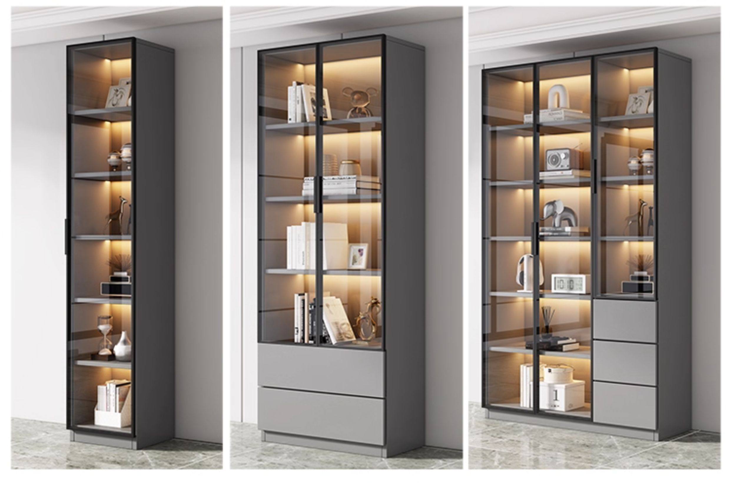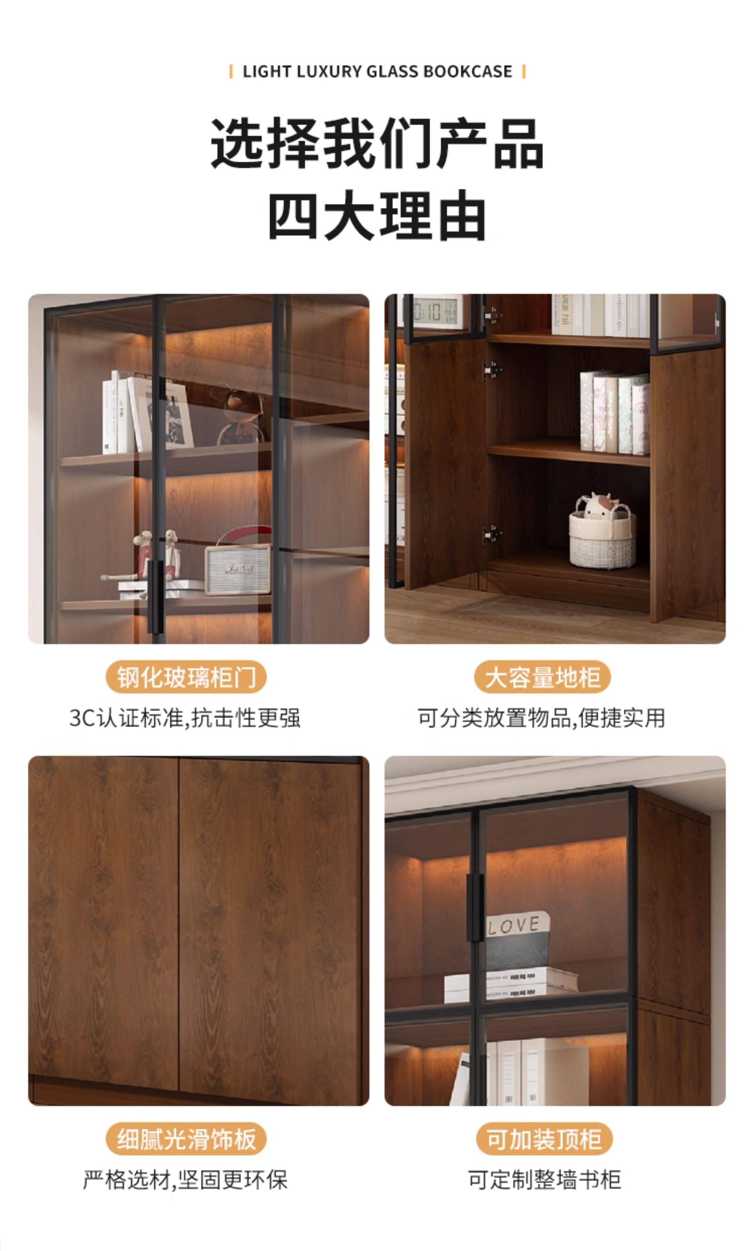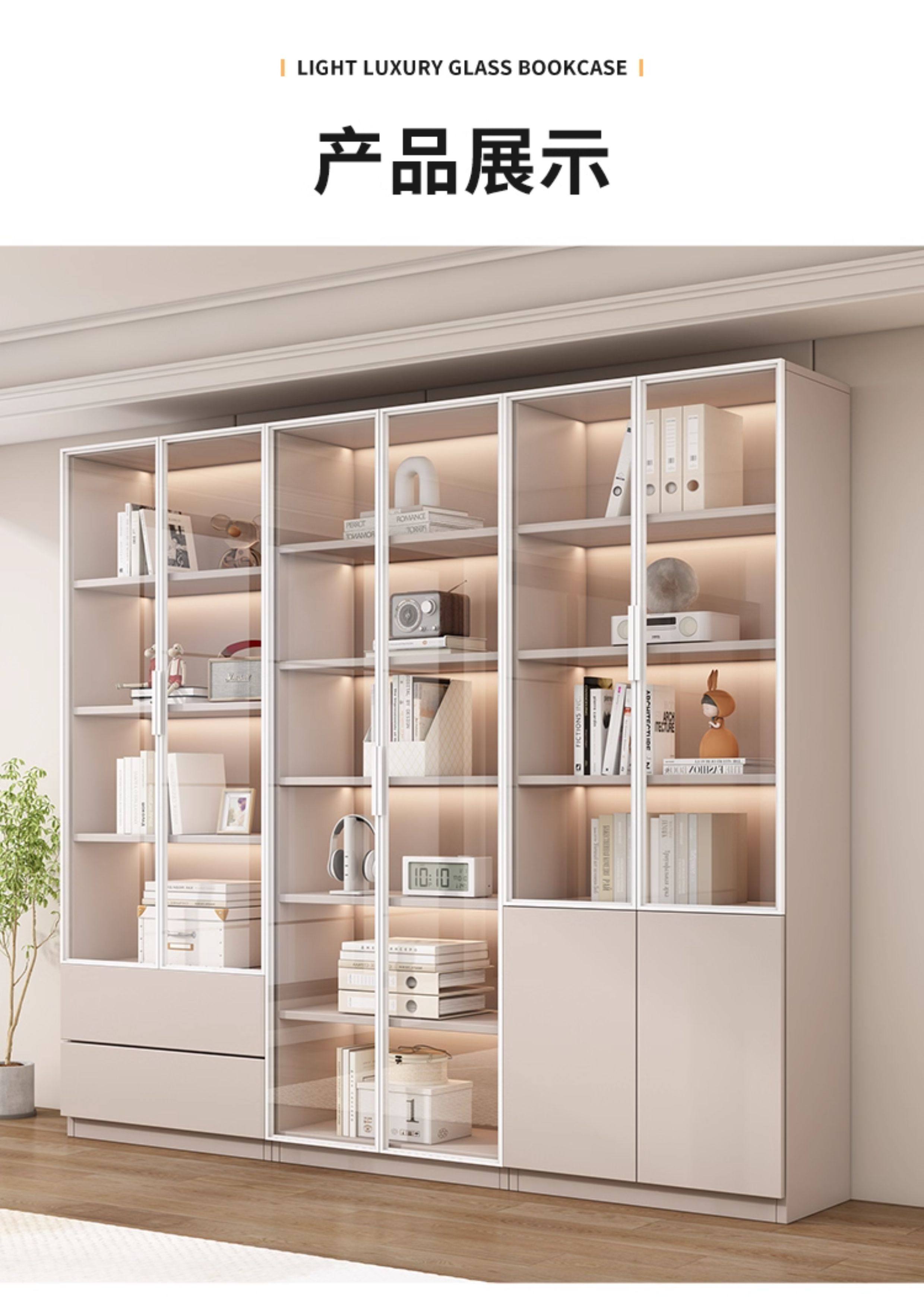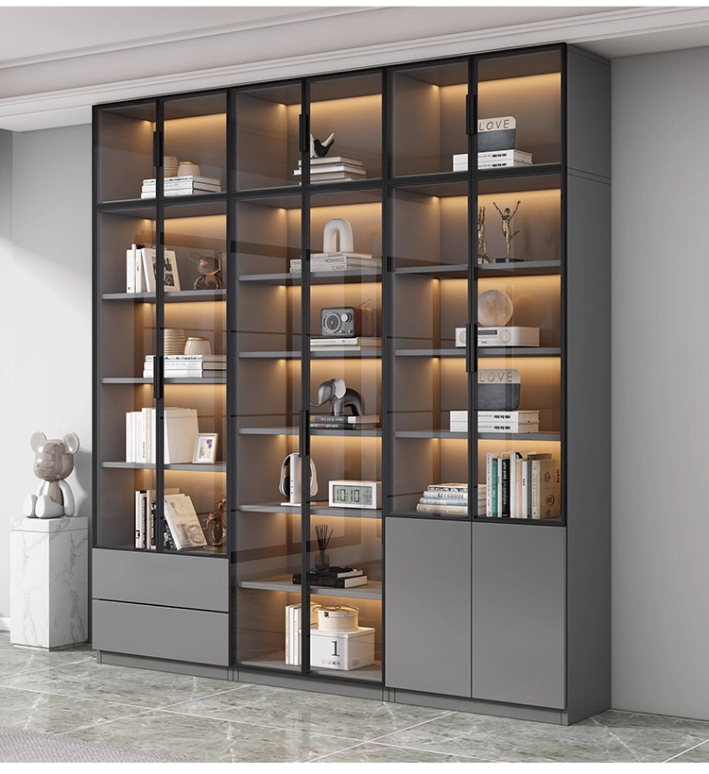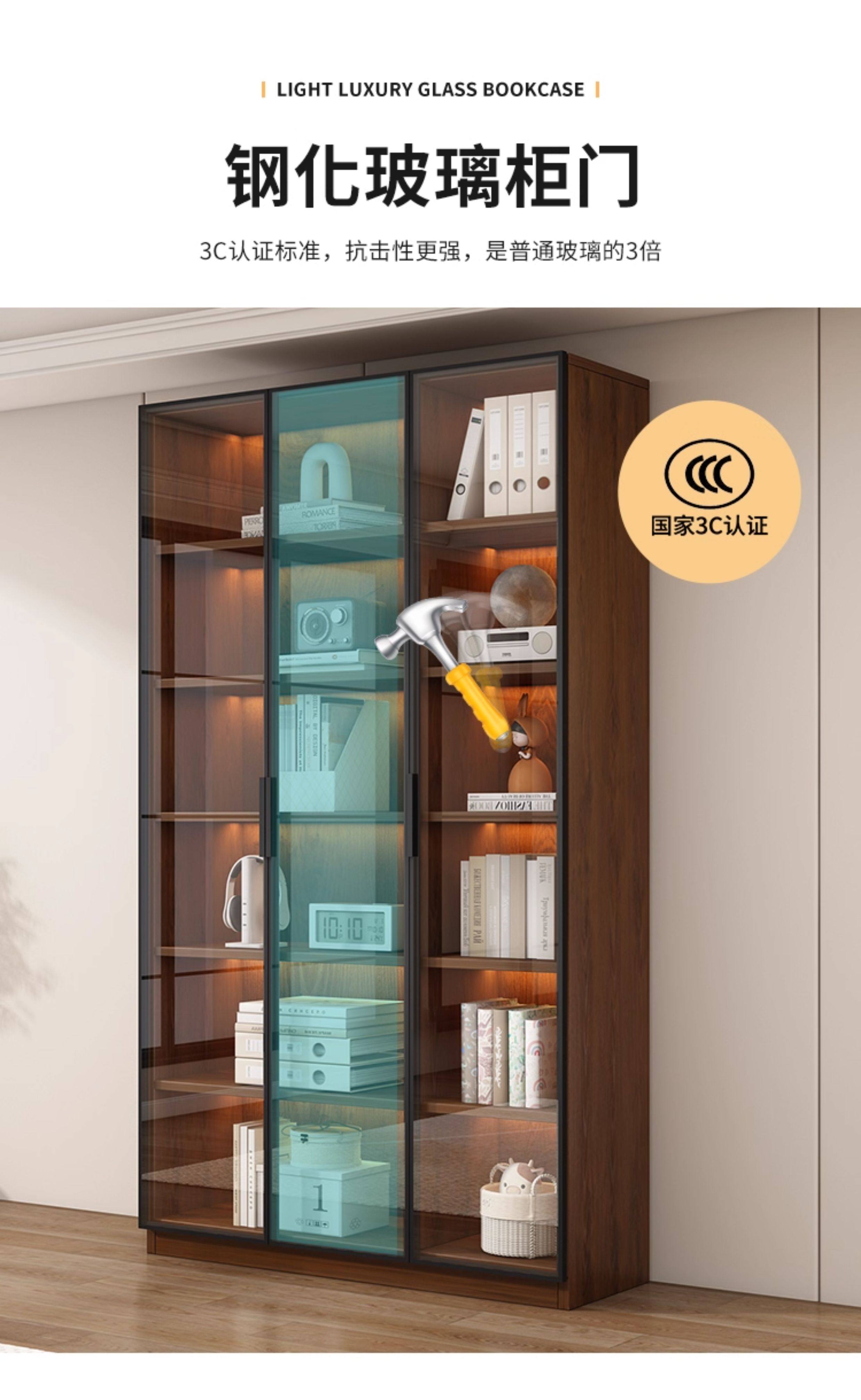 Walnut-Colored Bookcase with Glass Doors, Display Wine Cabinet, Light Luxury Home Living Room Solid Wood Integrated Wall-To-Ceiling Bookshelf