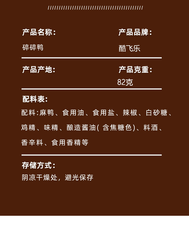 | Taste | Spicy Shredded Duck 82g*1 (Fresh-Packed),Spicy Shredded Duck 82g*1 (Fresh-Packed),Spicy Shredded Duck 82g*2 (Fresh-Packed),Spicy Shredded Duck 82g*2 (Fresh-Packed),Mildly Spicy Shredded Duck 82G*1+Hot Spicy Shredded Duck 82g*1,Spicy Shredded Duck 82g*3 (Fresh-Packed),Spicy Shredded Duck 82g*3 (Fresh-Packed),Spicy Shredded Duck 82g*5 (Fresh-Packed),Spicy Shredded Duck 82g*5 (Fresh-Packed) |