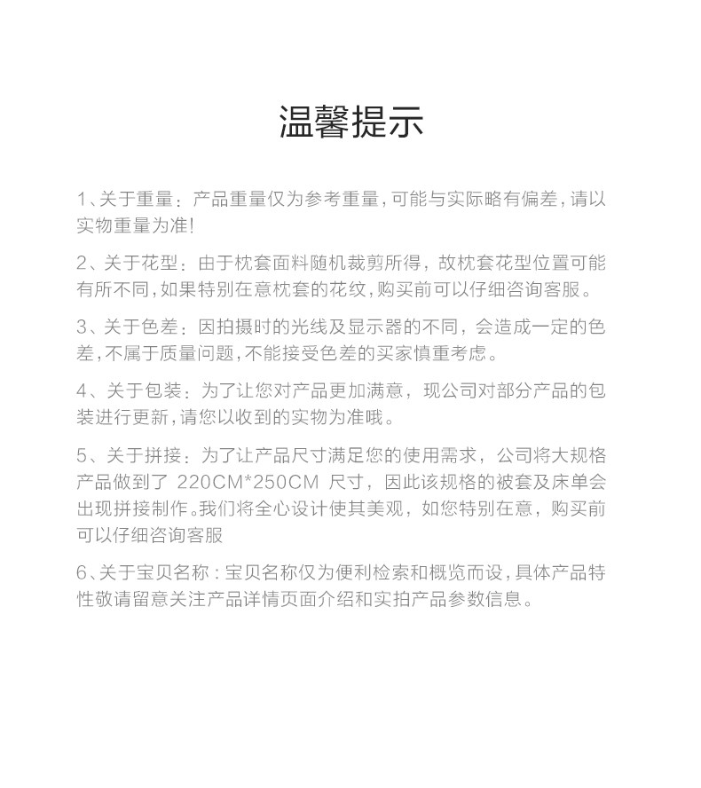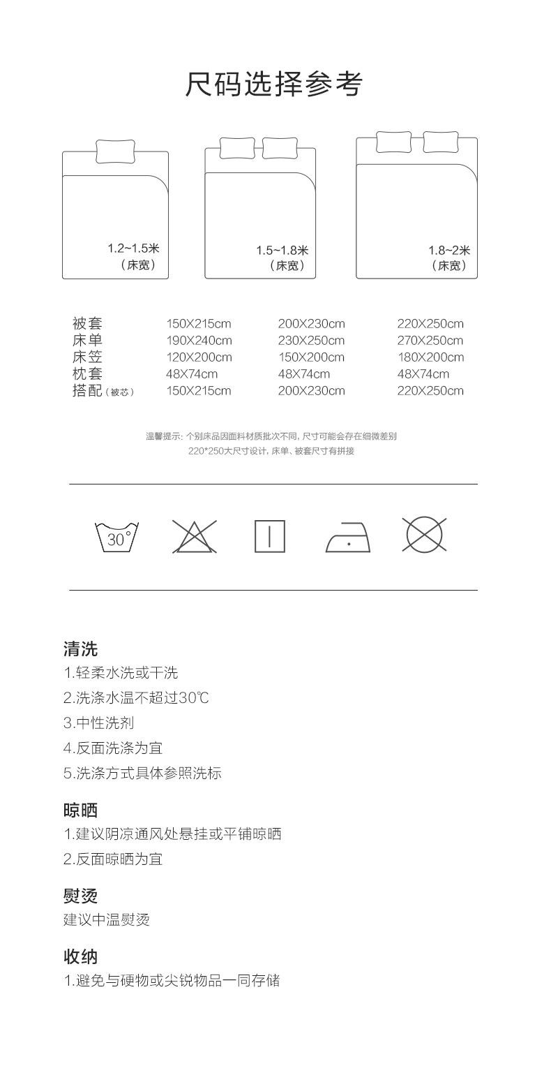 | Applicable Bed Size | 1.5m (5ft) Bed 4-Piece Set, Please Provide 200×230cm Quilt Core,1.8m (6ft) Bed 4-Piece Set, Please Provide 220×250cm Quilt Core |