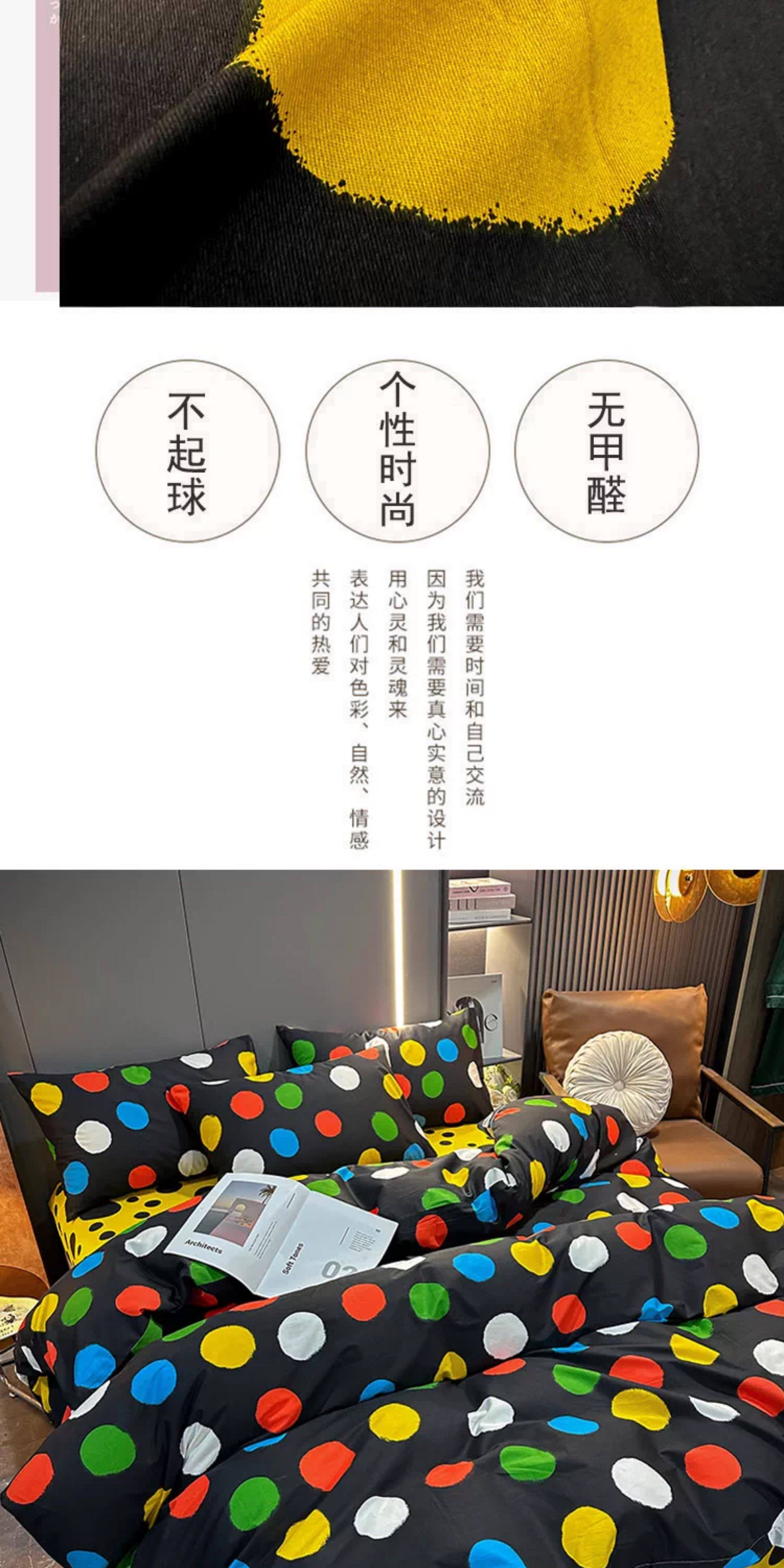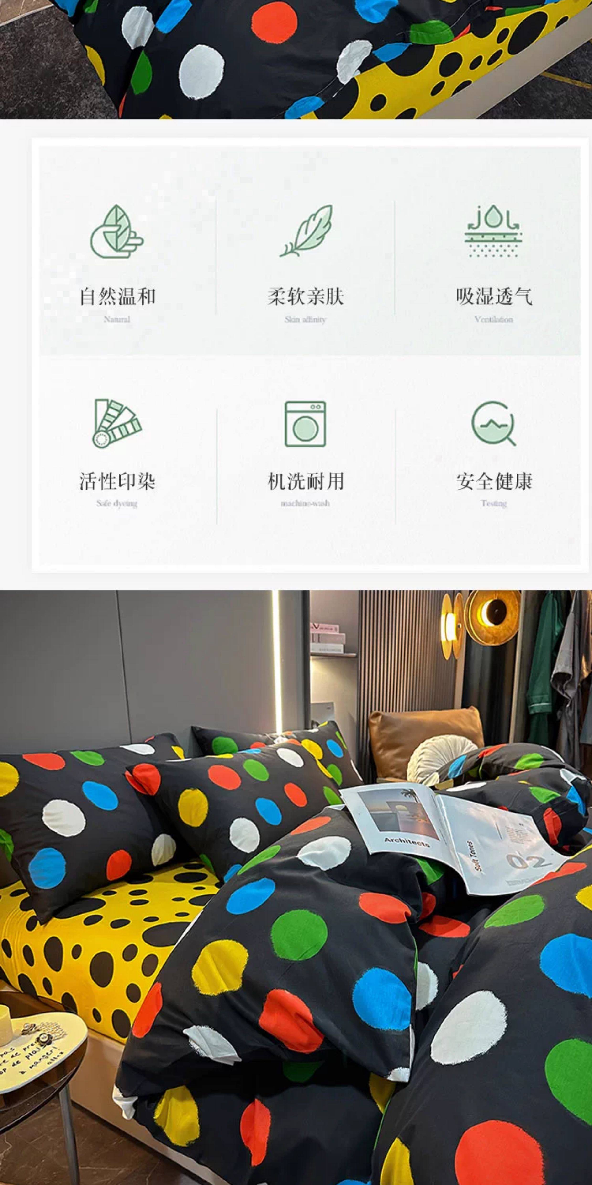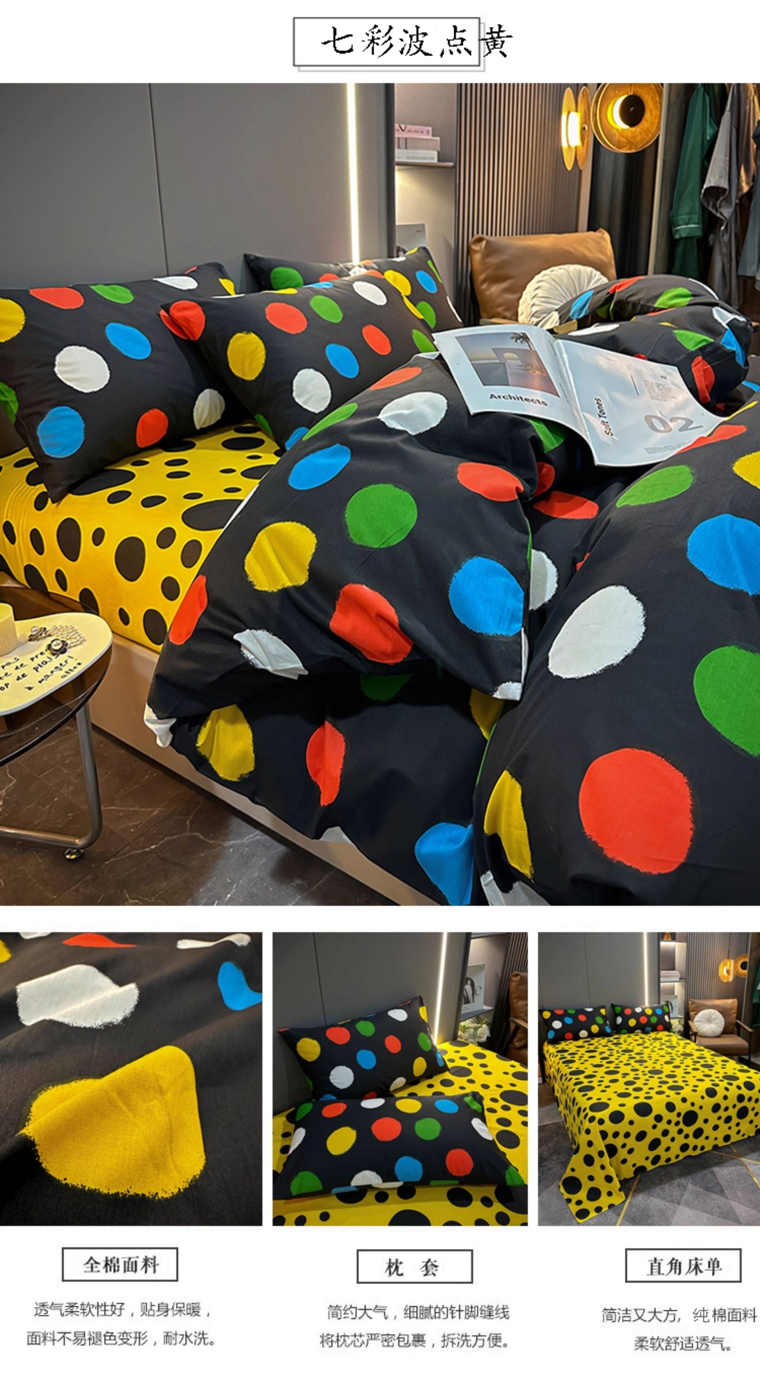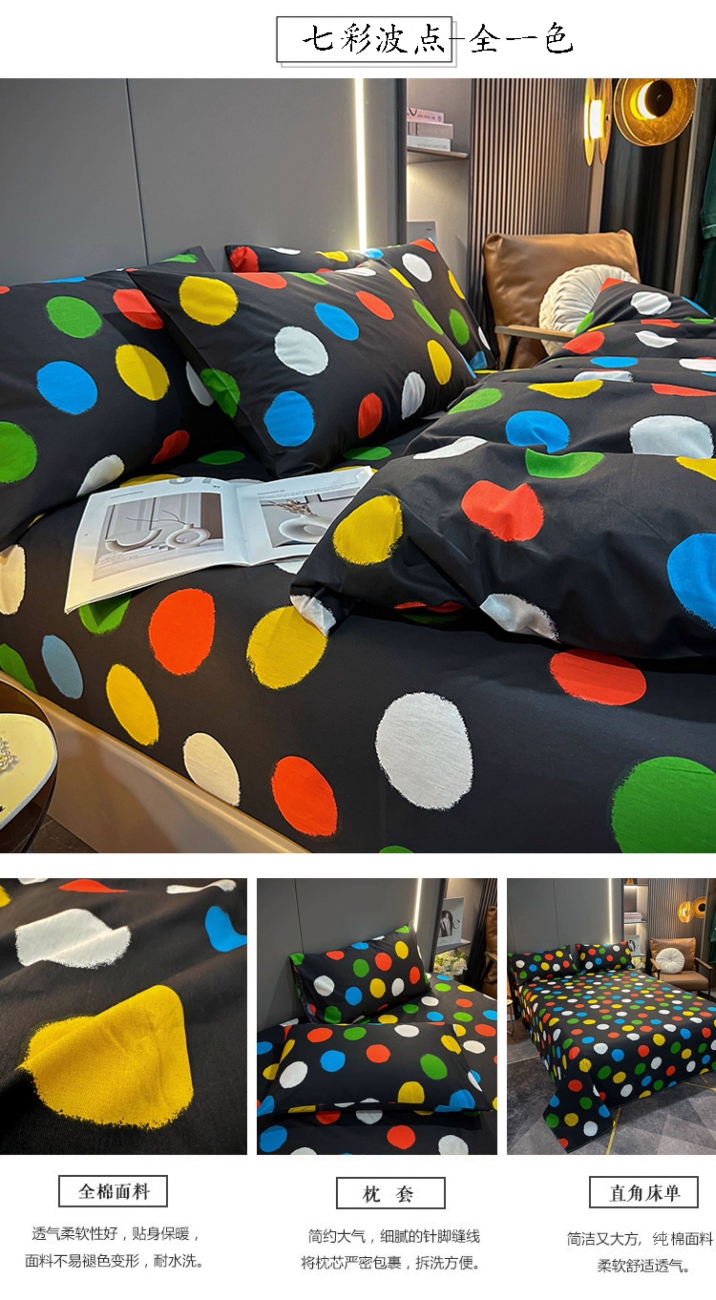 100% Cotton Four-Piece Bedding Set, Pure Cotton Bed Sheet with Large Polka Dots, Nordic Simple Duvet Cover, 1.8m Bed Fitted Sheet, Three or Four-Piece Set