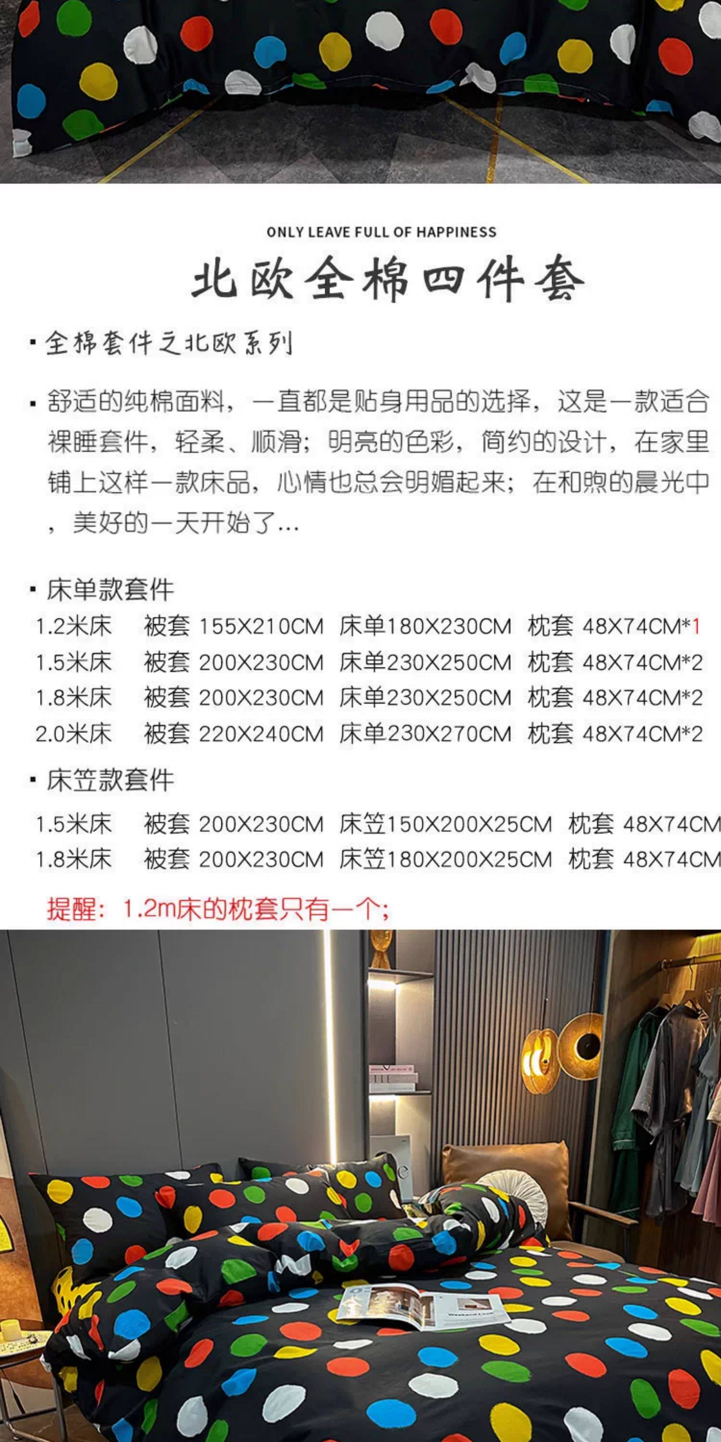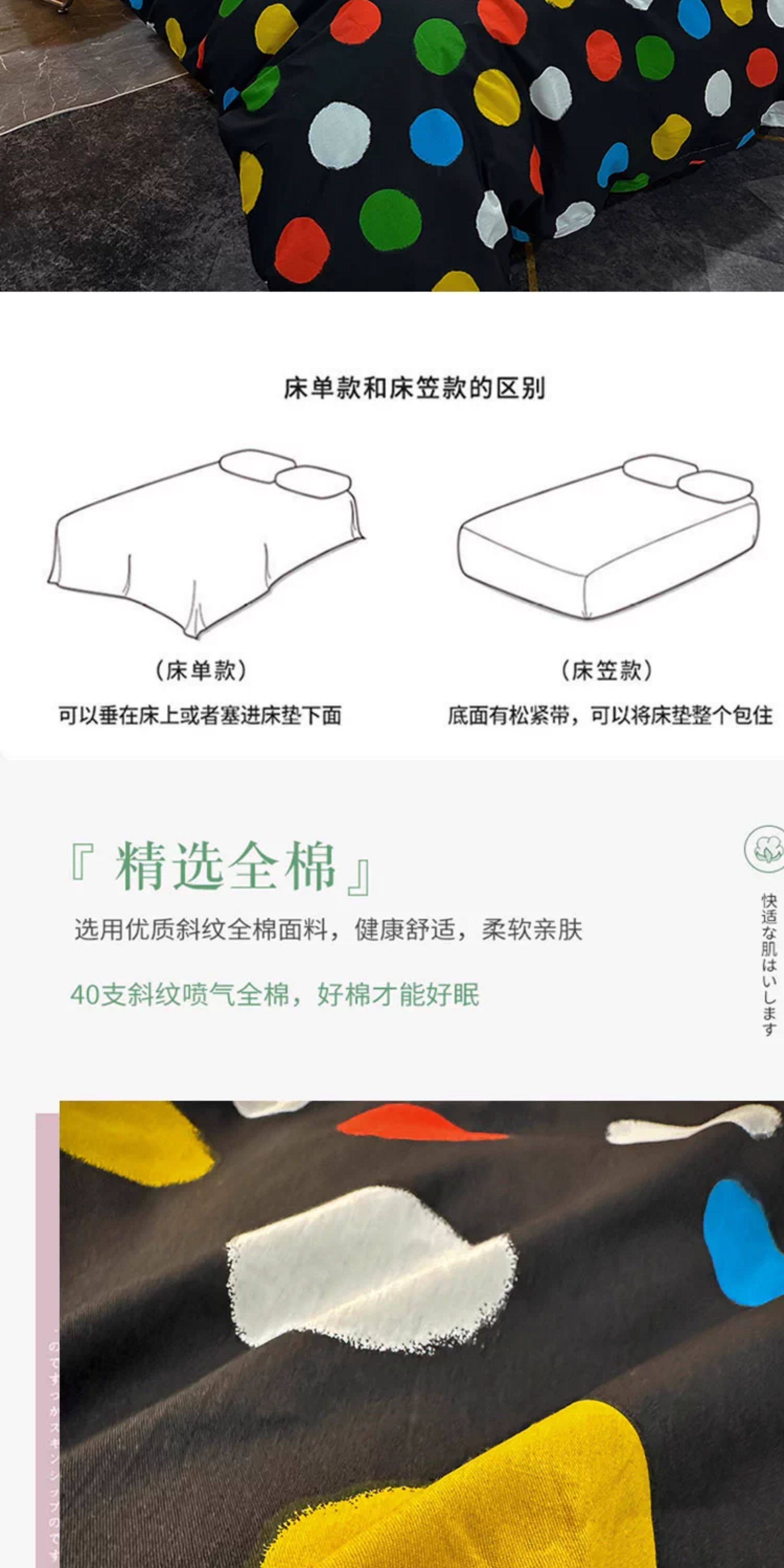| Applicable Bed Size | 1.2m Dormitory Bed Sheet Three-Piece Set (Suitable for Quilt 150*200),1.5m Bed Sheet Four-Piece Set[Suitable for Quilt 200×230],1.8m Bed Sheet Four-Piece Set[Suitable for Quilt 200×230],2.0m Bed Sheet Four-Piece Set[Quilt Cover 220×240cm],1.5m Fitted Sheet Set of Four,1.8m Fitted Sheet Set of Four,[Single Piece Quilt Cover]200×230cm,[Single Piece Quilt Cover]220×240cm |
