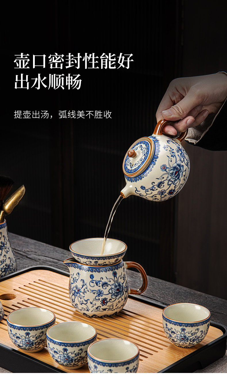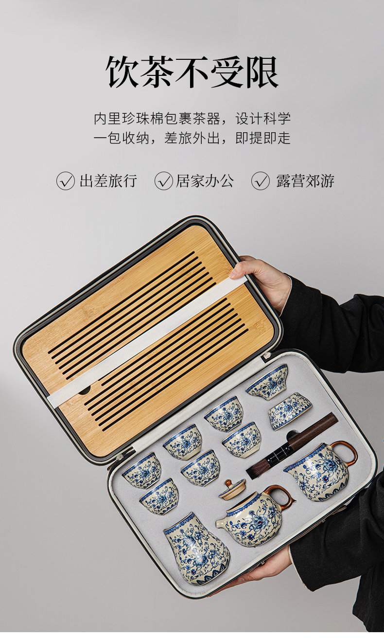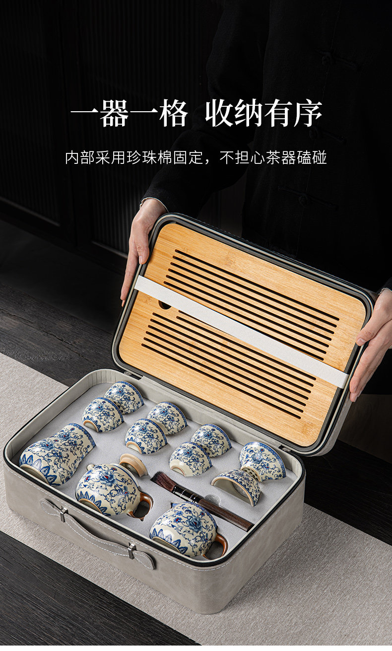 Ru Kiln Blue and White Travel Tea Set, High-End Outdoor Camping Tea Drinking Equipment, Portable Tea Brewing Pot, Kung Fu Tea Cup
