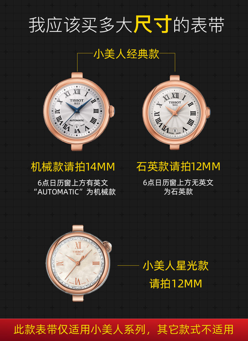 | Size | 14mm (Applicable to T126.207 Little Beauty Mechanical Watch),12mm (Applicable to T126.010 Little Beauty Quartz Watch),Information Description: Mechanical Model 14mm, Quartz Model 12mm |