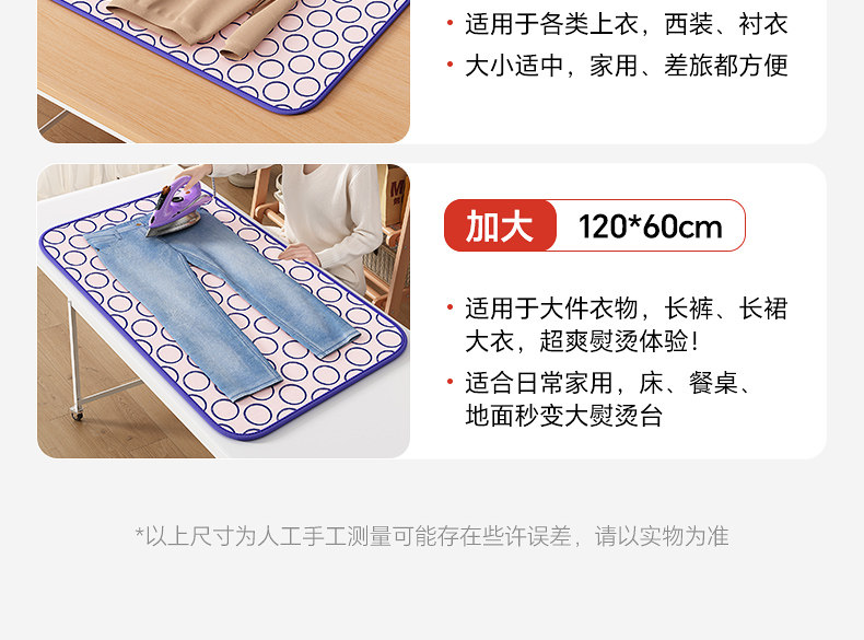 | Color Classification | [Size Recommendation Chart],❤️It Is Recommended That You Iron the Mat before Use~,[Medium Ironing Pad]★ Recommended for Small Items of Clothing,[Large Ironing Pad]★Recommended Ironing Tops,[Enlarge the Ironing Pad]★ Ironing Coats and Trousers,[Two-Piece Set]Medium Ironing Pad + Iron Pad,[Two-Piece Set]Large Ironing Pad + Iron Pad,[Two-Piece Set]Large Ironing Pad + Iron Pad,[Two-Piece Set]Medium Ironing Pad + Handheld Ironing Board,[Two-Piece Set]Large Ironing Pad + Handheld Ironing Board,[Two-Piece Set]Large Ironing Pad + Handheld Ironing Board,[Three-Piece Set]Medium Ironing Pad + Iron Pad + Handheld Ironing Board,[Three-Piece Set]Large Ironing Pad + Iron Pad + Handheld Ironing Board,[Three-Piece Set]Large Ironing Pad + Iron Pad + Handheld Ironing Board |