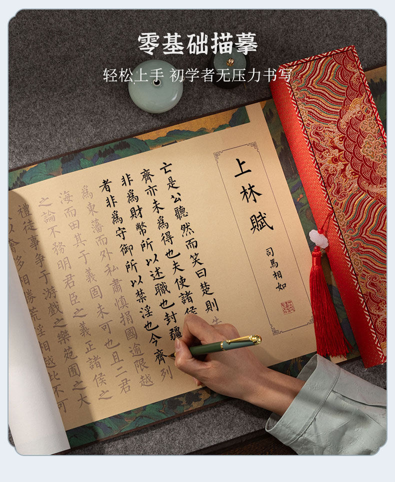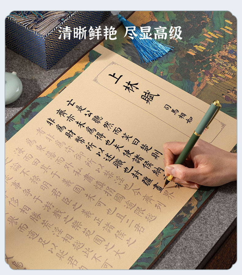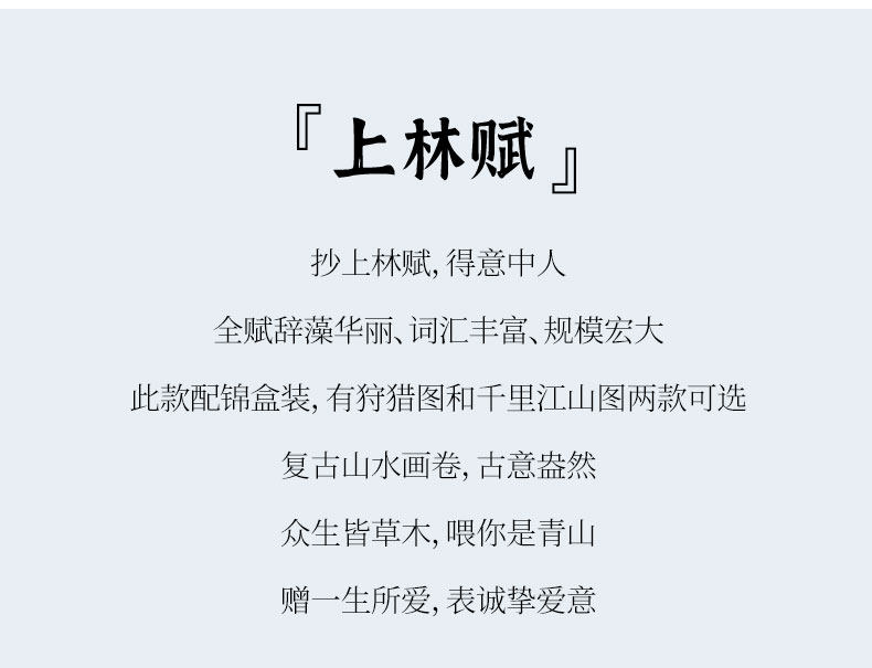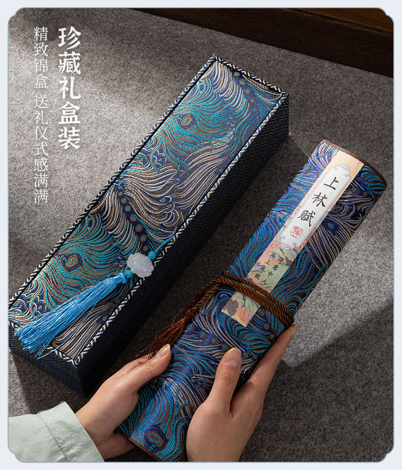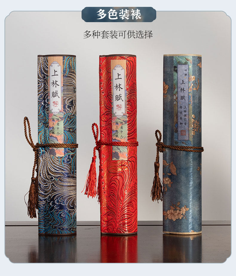 | Paper Format | [Beginner & Zero Basics Easily Mastered]Hand Scroll + Pen Brush + 20 Ink Bags + Felt,[Calligraphy Atmosphere Set]Hand Scroll + Wolf Hair Small Regular Script + 100g Ink + Ceramic Ink Dish + Felt,[Single Copybook]Shanglin Fu Scroll |