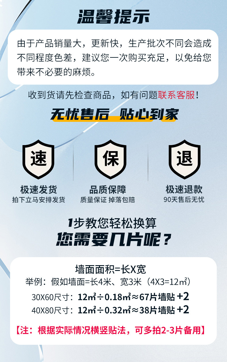 | Color Classification | ☏Large Square Grid 30×60cm [10 Pieces ≈ 1.8 Square Meters] Best-Selling Recommendation,☏Large Square Grid 30×60cm [20 Pieces ≈ 3.6 Square Meters] Best-Selling Recommendation,☏Large Square Grid 30×60cm [30 Pieces ≈ 5.4 Square Meters] Best-Selling Recommendation,☏Large Square Grid 30×60cm [40 Pieces ≈ 7.2 Square Meters] Best-Selling Recommendation,☏Large Square Grid 30×60cm [50 Pieces ≈ 9 Square Meters] Best-Selling Recommendation,☏Large Square Grid 30×60cm [60 Pieces ≈ 10.8 Square Meters] Best-Selling Recommendation,☏Large Square Grid 30×60cm [80 Pieces ≈ 14.4 Square Meters] Best-Selling Recommendation,☏Large Square Grid 30×60cm [100 Pieces ≈ 18 Square Meters] Best-Selling Recommendation,❥Small Square 30×60cm [10 Pieces ≈ 1.8 Square Meters] Match as You Like,❥Small Square 30×60cm [Pack of 20 Pieces ≈ 3.6 Square Meters] Match as You Like,❥Small Square 30×60cm [Pack of 30 Pieces ≈ 5.4 Square Meters] Match as You Like,❥Small Square 30×60cm [40 Pieces ≈ 7.2 Square Meters] Match as You Like,❥Small Square 30×60cm [Pack of 50 Pieces ≈ 9 Square Meters] Match as You Like,❥Small Square 30×60cm [60 Pieces ≈ 10.8 Square Meters] Match as You Like,❥Small Square 30×60cm [80 Pieces ≈ 14.4 Square Meters] Match as You Like,❥Small Square 30×60cm [100 Pieces ≈ 18 Square Meters] Match as You Like,☻Bright White 30×60cm [10 Pieces ≈ 1.8 Square Meters] Waterproof and Oil-Proof,☻Bright White 30×60cm [20 Pieces ≈ 3.6 Square Meters] Waterproof and Oil-Proof,☻Bright White 30×60cm [30 Pieces ≈ 5.4 Square Meters] Waterproof and Oil-Proof,☻Bright White 30×60cm [40 Pieces ≈ 7.2 Square Meters] Waterproof and Oil-Proof,☻Bright White 30×60cm [50 Pieces ≈ 9 Square Meters] Waterproof and Oil-Proof,☻Bright White 30×60cm [60 Pieces ≈ 10.8 Square Meters] Waterproof and Oil-Proof,☻Bright White 30×60cm [80 Pieces ≈ 14.4 Square Meters] Waterproof and Oil-Proof,☻Bright White 30×60cm [100 Pieces ≈ 18 Square Meters] Waterproof and Oil-Proof,▼Chas Gray 30×60cm [10 Pieces ≈ 1.8 Square Meters] Easy to Take Care of,▼Chas Gray 30×60cm [20 Pieces ≈ 3.6 Square Meters] Easy to Take Care of,▼Chas Gray 30×60cm [30 Pieces ≈ 5.4 Square Meters] Easy to Take Care of,▼Chas Gray 30×60cm [40 Pieces ≈ 7.2 Square Meters] Easy to Take Care of,▼Chas Gray 30×60cm [50 Pieces ≈ 9 Square Meters] Easy to Take Care of,▼Chas Gray 30×60cm [60 Pieces ≈ 10.8 Square Meters] Easy to Take Care of,▼Chas Gray 30×60cm [80 Pieces ≈ 14.4 Square Meters] Easy to Take Care of,▼Chas Gray 30×60cm [100 Pieces ≈ 18 Square Meters] Easy to Take Care of,◊Fish Belly White 30×60cm [10 Pieces ≈ 1.8 Square Meters] Millions of Choices,◊Fish Belly White 30×60cm [20 Pieces ≈ 3.6 Square Meters] Millions of Choices,◊Fish Belly White 30×60cm [30 Pieces ≈ 5.4 Square Meters] Millions of Choices,◊Fish Belly White 30×60cm [40 Pieces ≈ 7.2 Square Meters] Millions of Choices,◊Fish Belly White 30×60cm [50 Pieces ≈ 9 Square Meters] Millions of Choices,◊Fish Belly White 30×60cm [60 Pieces ≈ 10.8 Square Meters] Millions of Choices,◊Fish Belly White 30×60cm [80 Pieces ≈ 14.4 Square Meters] Millions of Choices,◊Fish Belly White 30×60cm [100 Pieces ≈ 18 Square Meters] Millions of Choices,Ω Jazz White 30×60cm [10 Pieces ≈ 1.8 Square Meters] More Resistant to High Temperatures,Ω Jazz White 30×60cm [20 Pieces ≈ 3.6 Square Meters] More Resistant to High Temperatures,Ω Jazz White 30×60cm [30 Pieces ≈ 5.4 Square Meters] More Resistant to High Temperatures,Ω Jazz White 30×60cm [40 Pieces ≈ 7.2 Square Meters] More Resistant to High Temperatures,Ω Jazz White 30×60cm [50 Pieces ≈ 9 Square Meters] More Resistant to High Temperatures,Ω Jazz White 30×60cm [60 Pieces ≈ 10.8 Square Meters] More Resistant to High Temperatures,Ω Jazz White 30×60cm [80 Pieces ≈ 14.4 Square Meters] More Resistant to High Temperatures,Ω Jazz White 30×60cm [100 Pieces ≈ 18 Square Meters] More Resistant to High Temperatures,☼Monet Gray 30*60cm [10 Pieces ≈ 1.8 Square Meters] Firmly Adhered,☼Monet Gray 30*60cm [20 Pieces ≈ 3.6 Square Meters] Firmly Adhered,☼Monet Gray 30*60cm [30 Pieces ≈ 5.4 Square Meters] Firmly Adhered,☼Monet Gray 30*60cm [40 Pieces ≈ 7.2 Square Meters] Firmly Adhered,☼Monet Gray 30*60cm [50 Pieces ≈ 9 Square Meters] Firmly Adhered,☼Monet Gray 30*60cm [60 Pieces ≈ 10.8 Square Meters] Firmly Adhered,☼Monet Gray 30*60cm [80 Pieces ≈ 14.4 Square Meters] Firmly Adhered,☼Monet Gray 30*60cm [100 Pieces ≈ 18 Square Meters] Firmly Adhered,⊕Lightning Gray 30×60cm [10 Pieces ≈ 1.8 Square Meters] Free Cutting,⊕Lightning Gray 30×60cm [20 Pieces ≈ 3.6 Square Meters] Free Cutting,⊕Lightning Gray 30×60cm [30 Pieces ≈ 5.4 Square Meters] Free Cutting,⊕Lightning Gray 30×60cm [40 Pieces ≈ 7.2 Square Meters] Free Cutting,⊕Lightning Gray 30×60cm [50 Pieces ≈ 9 Square Meters] Free Cutting,⊕Lightning Gray 30×60cm [60 Pieces ≈ 10.8 Square Meters] Free Cutting,⊕Lightning Gray 30×60cm [80 Pieces ≈ 14.4 Square Meters] Free Cutting,⊕Lightning Gray 30×60cm [100 Pieces ≈ 18 Square Meters] Free Cutting,Space Gray 30X60Cm [10-Piece Pack ≈ 1.8 Square Meters] - Self-Adhesive Backing,Space Gray 30X60Cm [20 Pieces ≈ 3.6 Square Meters] Self-Adhesive Backing,Space Gray 30X60Cm [30-Piece Pack ≈ 5.4 Square Meters] Self-Adhesive Backing,Space Gray 30X60Cm [40-Piece Pack ≈ 7.2 Square Meters] Self-Adhesive Backing,§Space Gray 30×60cm [50 Pieces ≈ 9 Square Meters] Comes with Adhesive Backing,Space Gray 30X60Cm [60-Piece Pack ≈ 10.8 Square Meters] Self-Adhesive Backing,§Space Gray 30×60cm [80 Pieces ≈ 14.4 Square Meters] Comes with Adhesive Backing,§Space Gray 30×60cm [100 Pieces ≈ 18 Square Meters] Comes with Adhesive Backing,◈Yashi White 30×60cm [10 Pieces ≈ 1.8 Square Meters] Classic Choice,◈Yashi White 30×60cm [