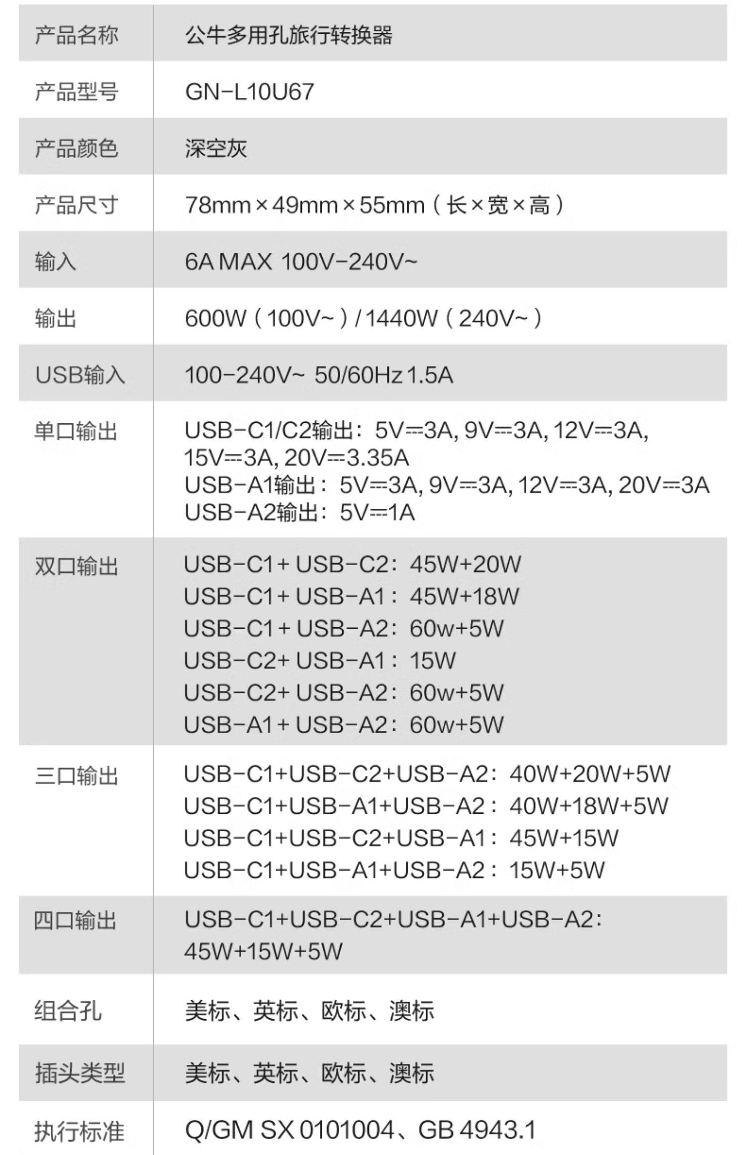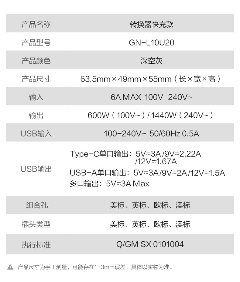 | Color Classification | German Standard One to One[901G]For Overseas Use,German Standard One to Two[L01G]For Overseas Use,European Standard Universal Model[GN-L12]For Overseas Use,National Standard to British Standard[L01CE]For Domestic Use,British Standard One to One[901E]For Overseas Use,British Standard One to Two[L01E]For Overseas Use,British Standard One to Three[GN-M10EW] White,British Standard One to Three with USB[GN-M120EW] White,Multi-Country Converter[GN-L10U-15W] Marshmallow Powder,Multi-Country Converter[GN-L10U-15W] Space Gray,National Standard One to One[901]For Domestic Use,National Standard One to Two[L01]For Domestic Use,National Standard Universal Model[GN-L11]For Domestic Use,National Standard to American Standard[L01CA]For Domestic Use,American Standard One to Three[GN-M10AW]White,American Standard One to One[901A]For Overseas Use,American Standard One to Two[L01A]For Overseas Use |