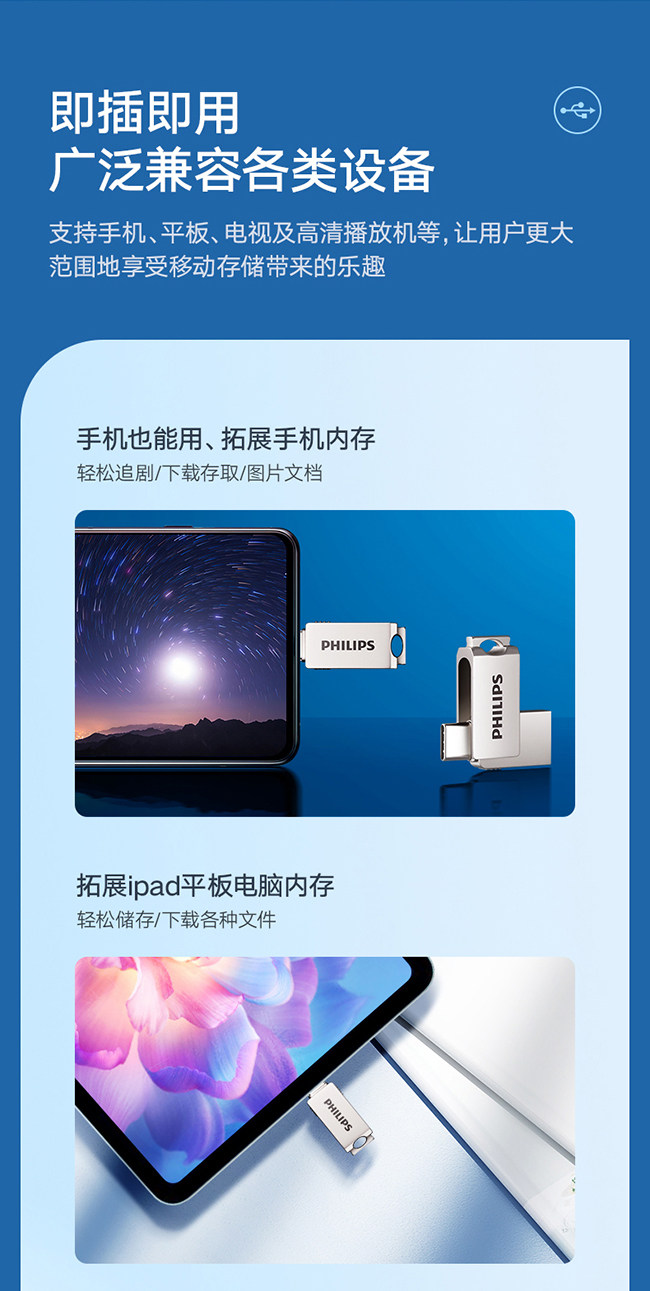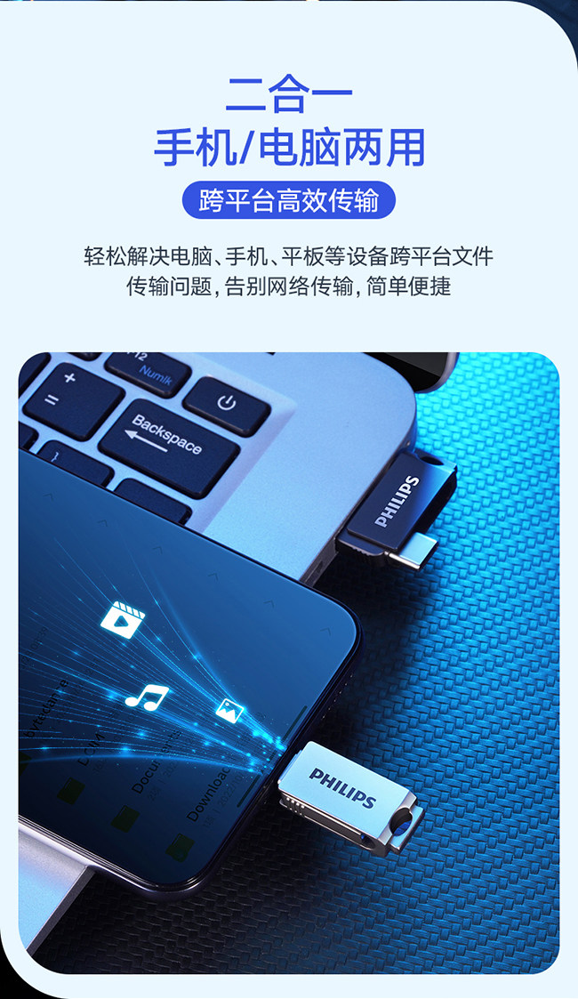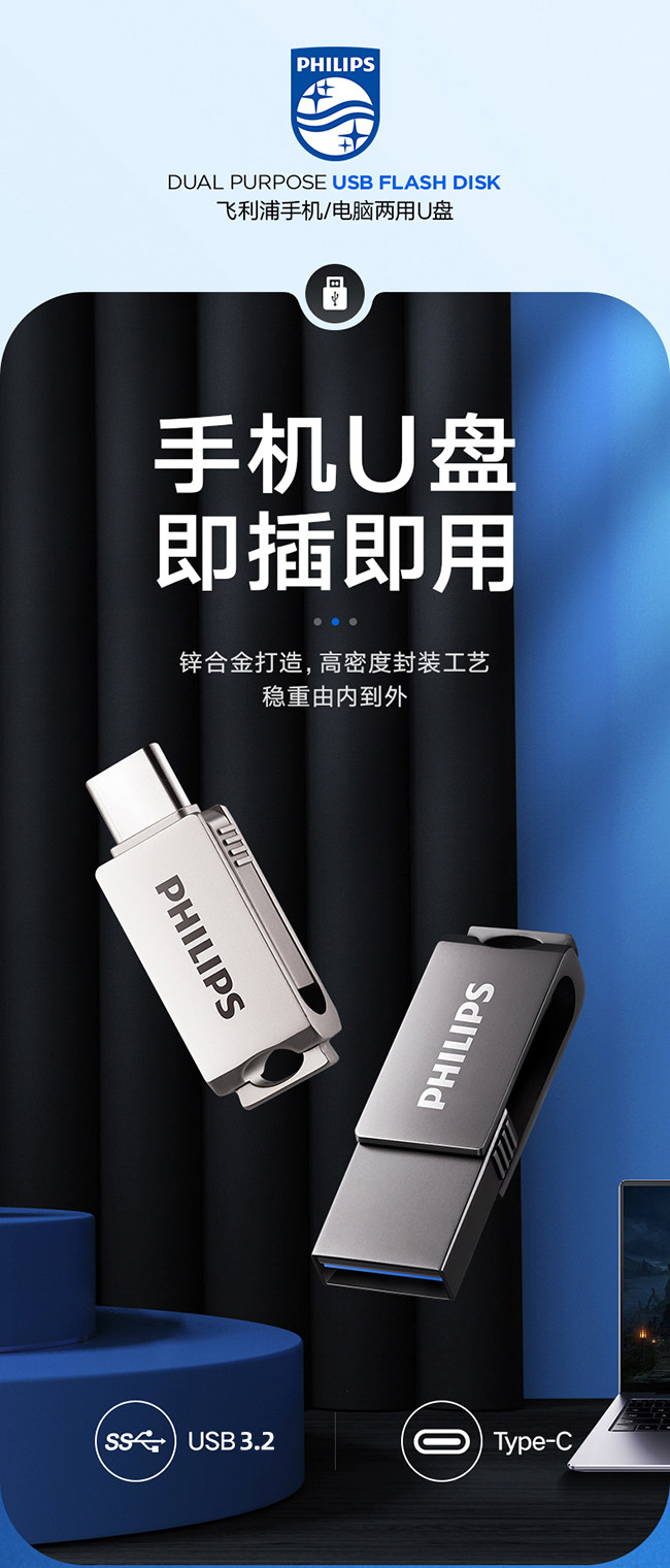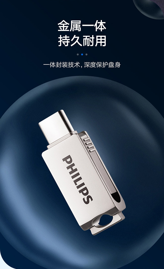 Philips USB Flash Drive Official Genuine Product 128g Large Capacity Typec Dual Interface Dual-Use Mini USB Flash Drive for Mobile Phones and Computers