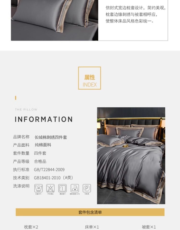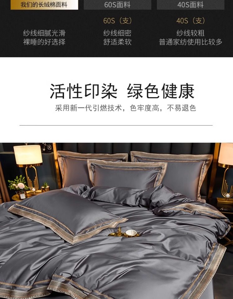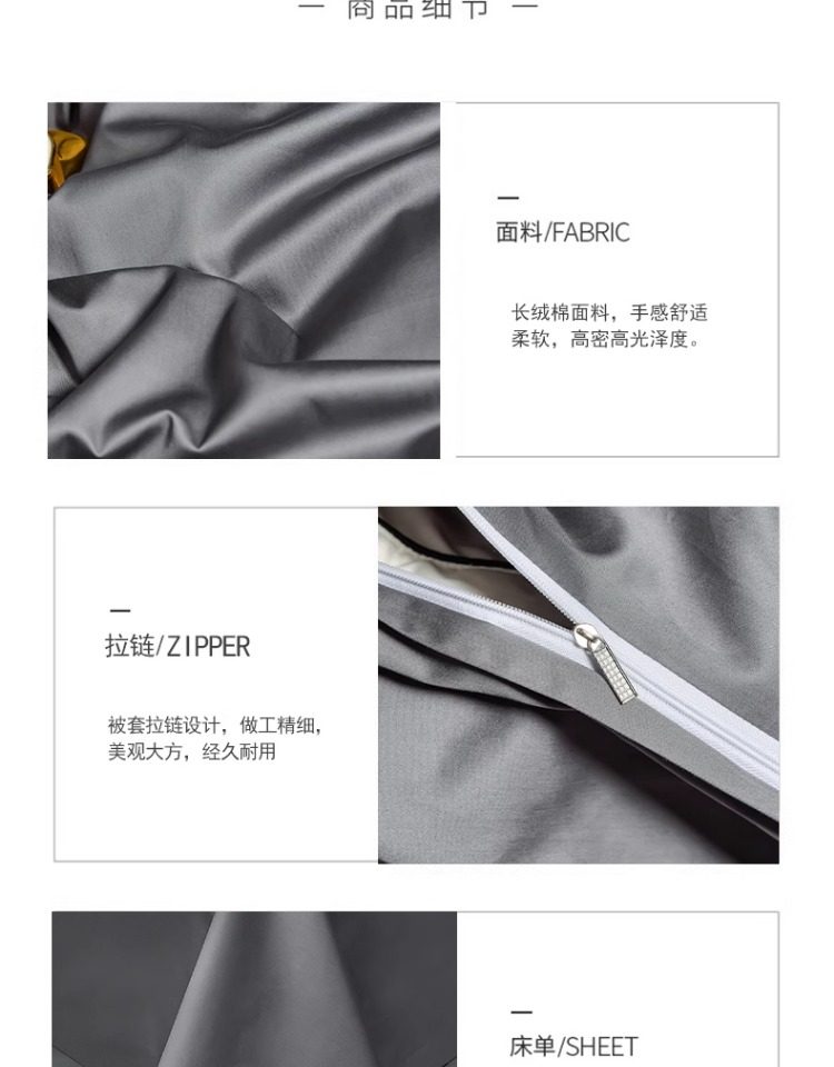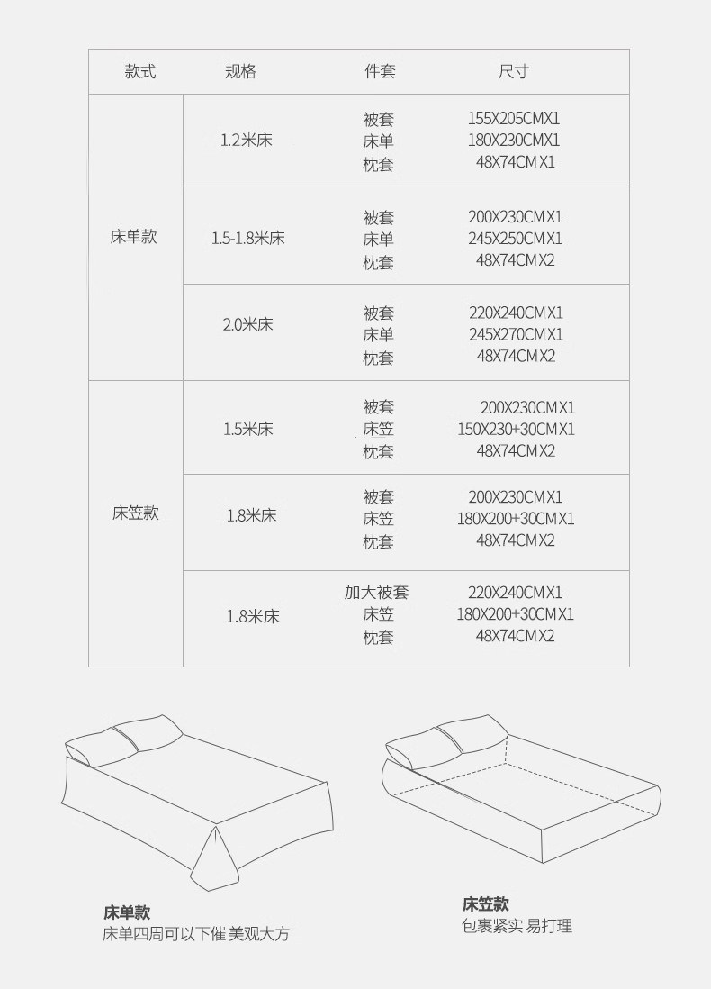 | Applicable Bed Size | 1.2m Three-Piece Bed Sheet Set [Quilt Cover*1+Sheet*1+Pillowcase*1],1.5m Bed Sheet Four-Piece Set [Quilt Cover*1+Sheet*1+Pillowcase*2],1.8m Bed Sheet Four-Piece Set [Quilt Cover*1+Sheet*1+Pillowcase*2],2.0m Bed Sheet Four-Piece Set [Quilt Cover*1+Sheet*1+Pillowcase*2],1.5m Fitted Sheet Set of Four [Quilt Cover*1+Fitted Sheet*1+Pillowcase*2],1.8m Fitted Sheet Set of Four [Quilt Cover*1+ Fitted Sheet*1+ Pillowcase*2],1.8m Fitted Sheet Style King Size Four-Piece Bedding Set [Duvet Cover *1 + Fitted Sheet *1 + Pillowcases *2] |