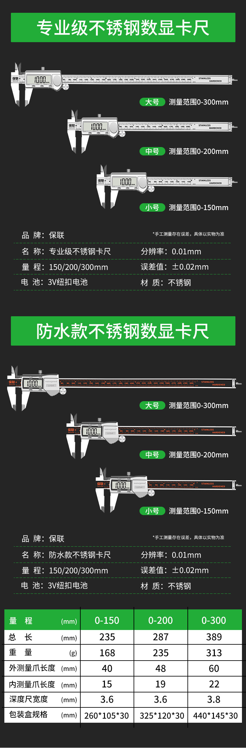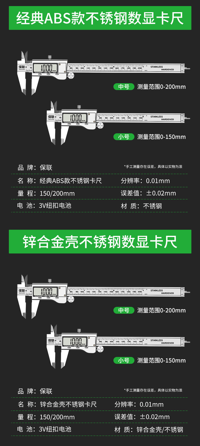 | Color Classification | [Classic Abs Shell] 0-150mm Stainless Steel Digital Caliper,[Classic Abs Shell] 0-200mm Stainless Steel Digital Caliper,[Upgraded Zinc Alloy Shell] 0-150mm Stainless Steel Digital Caliper,[Upgraded Zinc Alloy Shell] 0-200mm Stainless Steel Digital Caliper,[Excellent Professional Grade] 0-150mm Stainless Steel Digital Caliper,[Excellent Professional Grade] 0-200mm Stainless Steel Digital Caliper,[Excellent Professional Grade] 0-300mm Stainless Steel Digital Caliper,[Ip54 Waterproof and Dustproof] 0-150mm Stainless Steel Digital Caliper,[Ip54 Waterproof and Dustproof] 0-200mm Stainless Steel Digital Caliper,[Ip54 Waterproof and Dustproof] 0-300mm Stainless Steel Digital Caliper,[Full Digital Display Large Screen] 0-150mm Stainless Steel Digital Caliper |