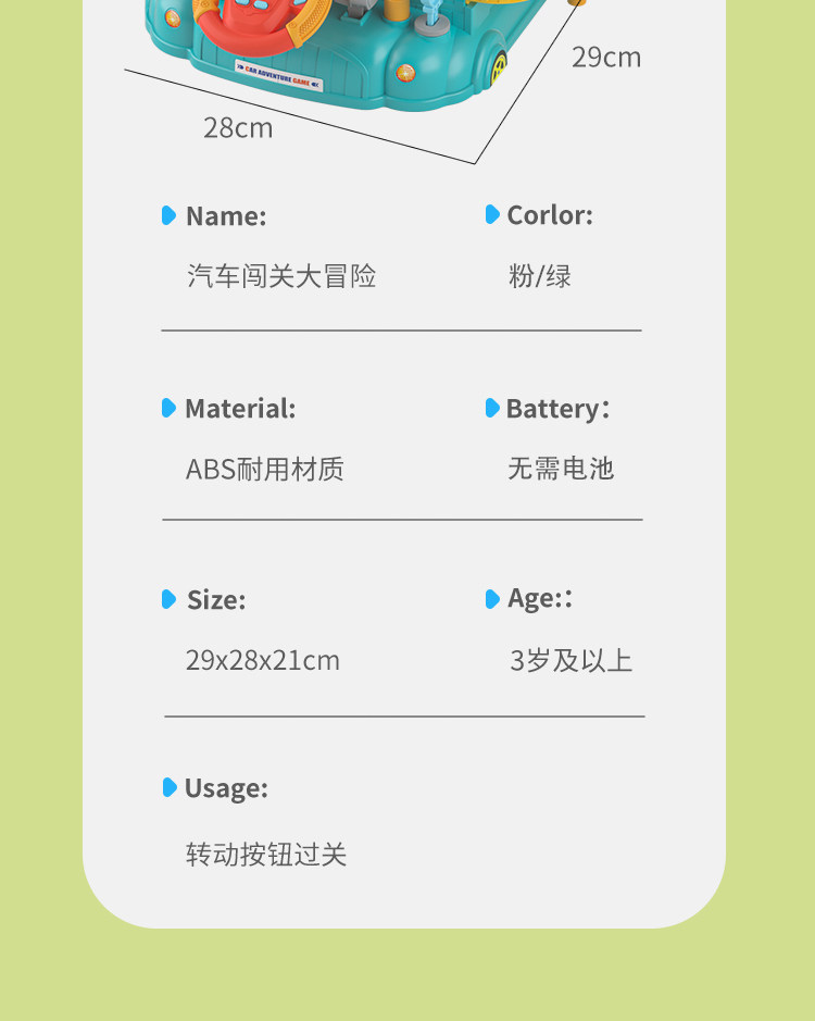 | Color Classification | Car Adventure[Green],Car Adventure[Pink],Car Adventure[Green]With Sound and Light,Car Adventure[Pink]With Sound and Light |