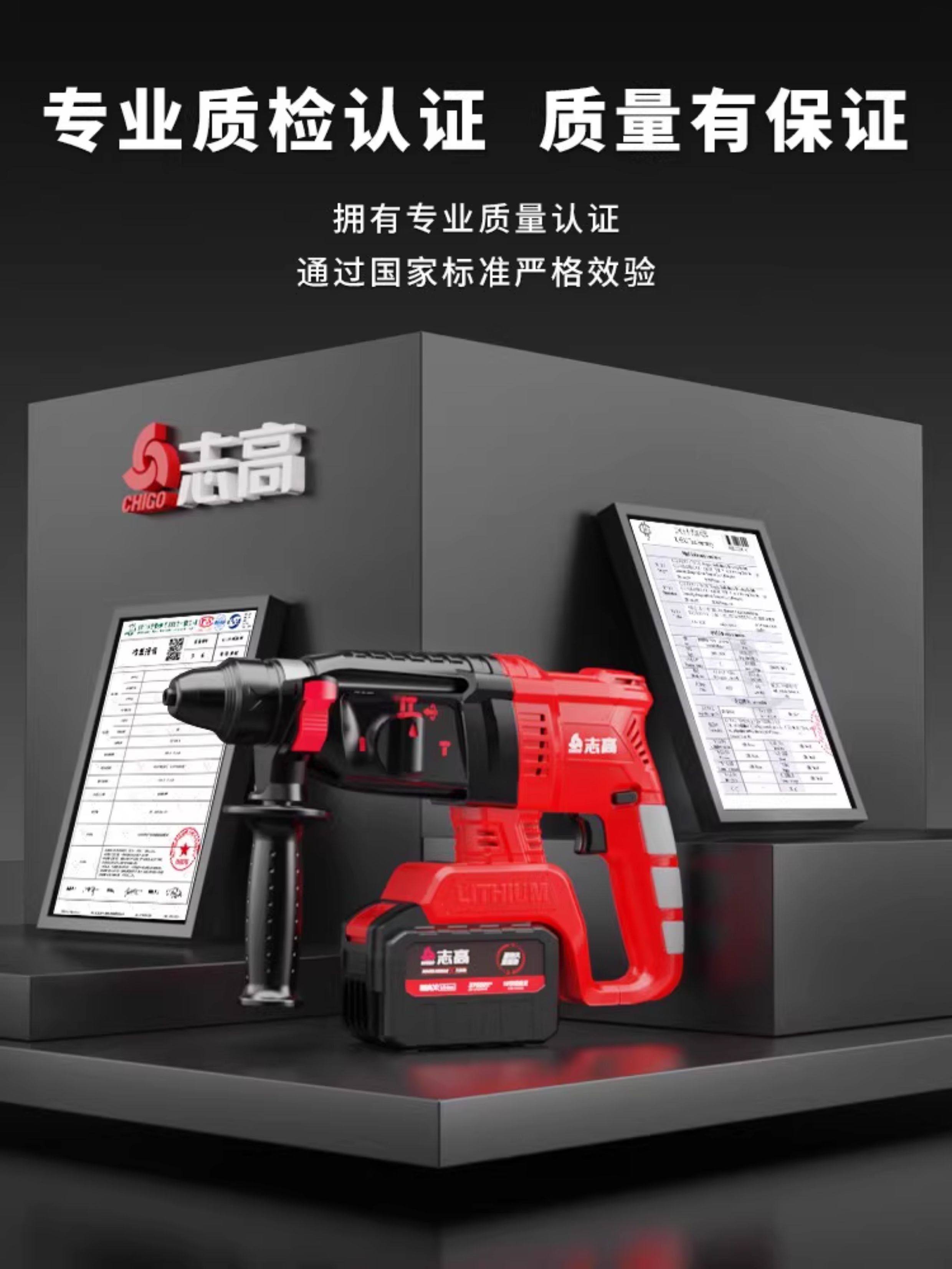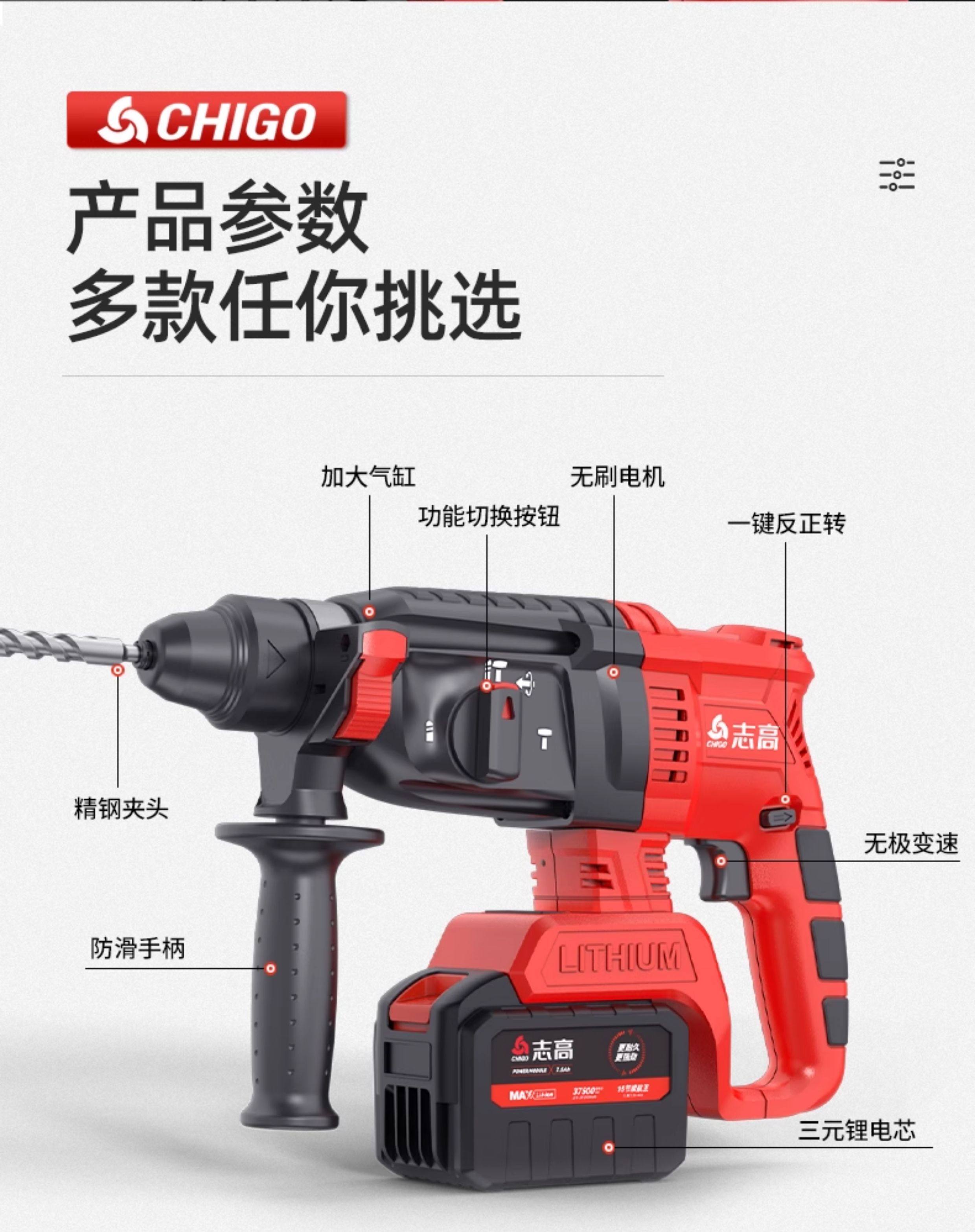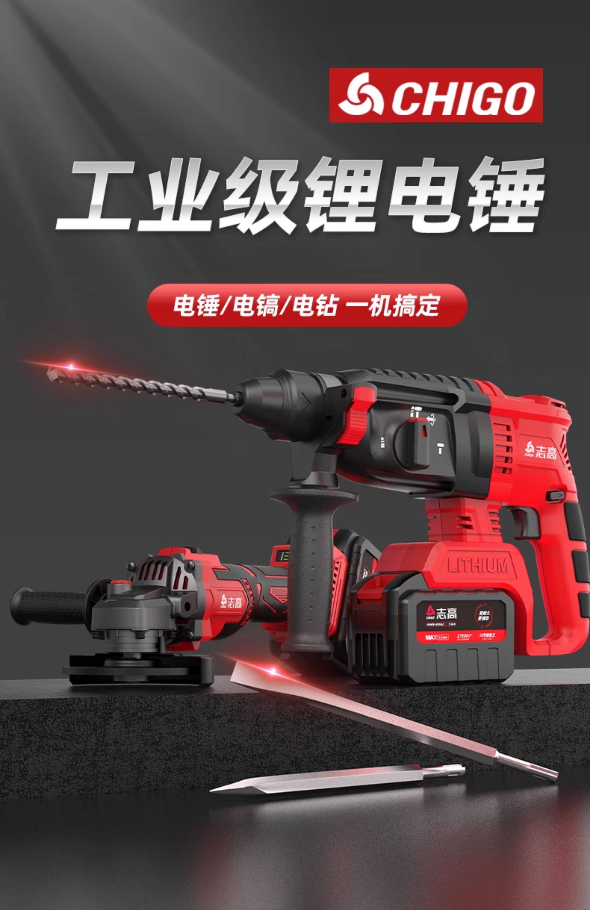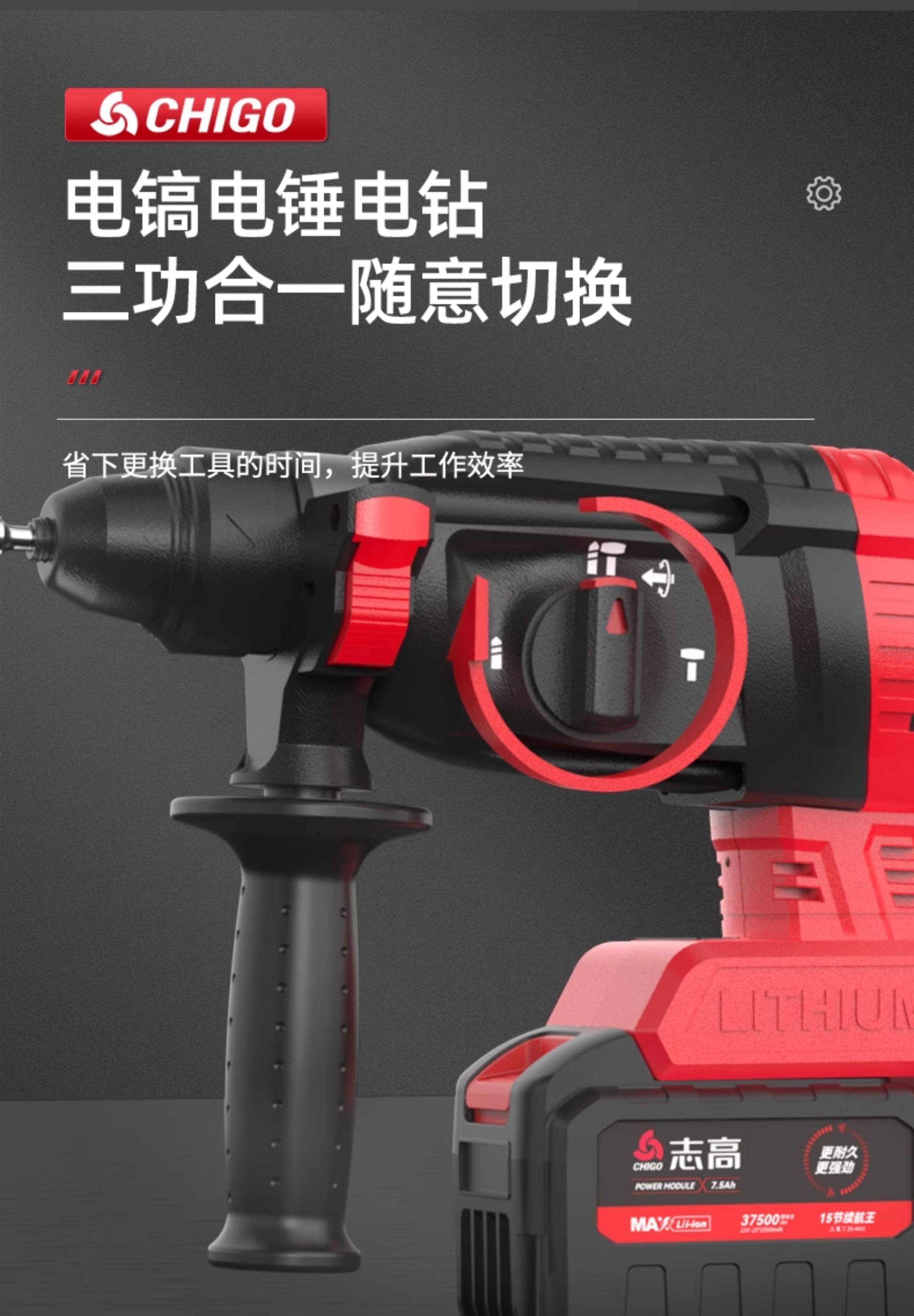 Chigo Brushless Rechargeable Electric Hammer, Electric Pick, Three-Purpose High-Power Concrete Tool, Lithium Battery Wireless Impact Drill