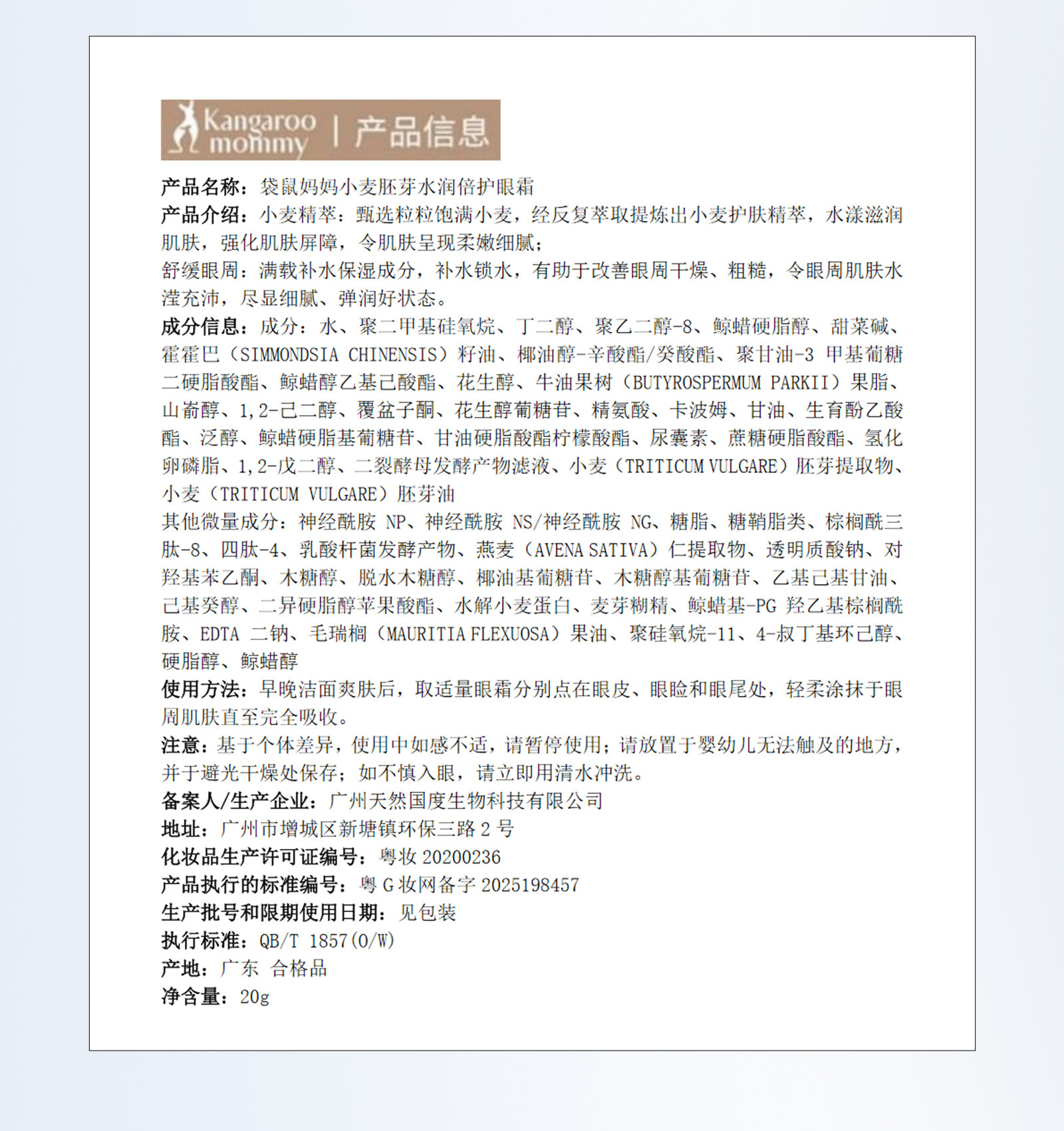 | Product Name | Kangaroo Mom Wheat Germ Hydrating Eye Cream |