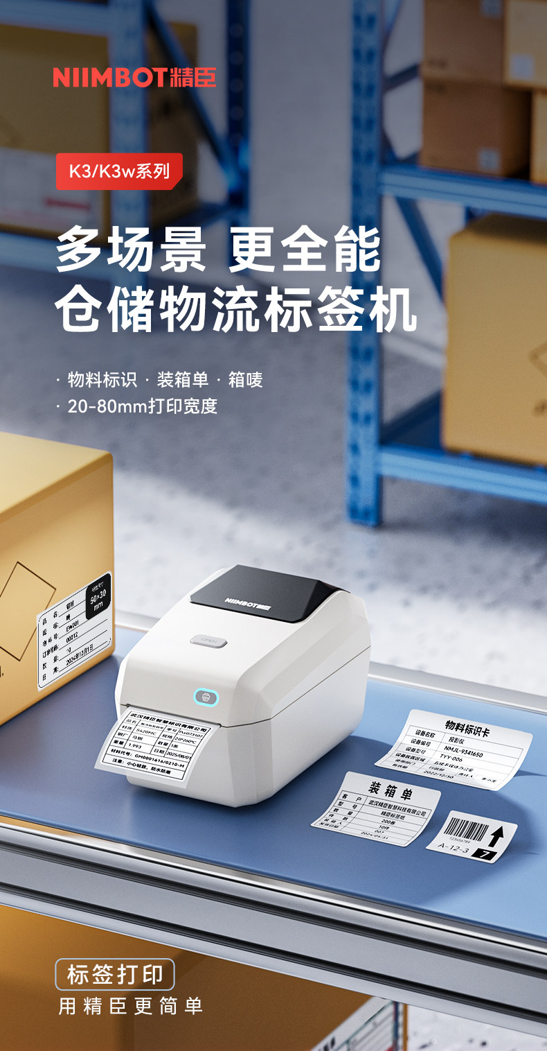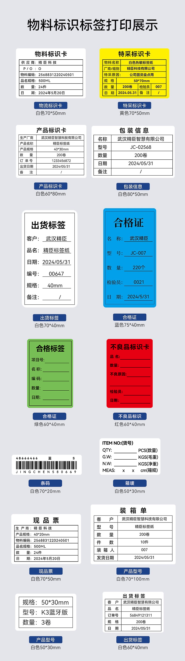 Jingchen K3 Warehouse Material Identification Card Label Printer Factory Shelf Product Inbound/Outbound Shipment Express Waybill Thermal Adhesive Packing List Outer Box Label Barcode Storage Location Code Certificate of Conformity
