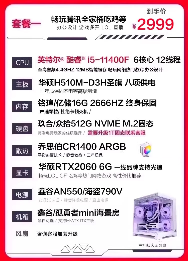 | Package Type | Bundle Deal 1 (Asus I5 11400F Rtx2060 6g - Tencent All-In-One Bundle - Limited to 10 Units for Anniversary Sale),Bundle 2 (I5 13400Ef, Asus Rtx 3060 12Gb) - Recommended for Livestreaming, Video Editing, and Gaming (E.G., Pubg, Battlefield),Bundle Deal 3 (I5 13490F, Asus Rx7650Gre 8g "Great White Shark" Triple-Fan Graphics Card) - Limited Edition of Only 10 Units! Manager's Pick.,Bundle Four (New 13Th Gen I5-13490F Rtx 5060 8Gb) - Recommended for Live Streaming and Gaming,Bundle 5: (Upgrade to 50 Series) Wi-Fi & Bluetooth 13Th Gen I5 13490F Rtx5060 8Gb - Recommended for Delta Region, Ideal for Gaming Like Tile-Breaking and Pubg.,Package Six (Recommended for Video Editing: I5 12600Kf + 5060 8g - Recommended Configuration for Designers, Gaming, and Live Streaming),Bundle 7 (Asus I5 14600Kf 5060 8g) - Recommended Configuration for Designers: Video Editing & Live Streaming,Package Eight (Asus 50 Series New Product Upgrade 1t Solid State I5 14600Kf 5060 8g) High-End Live Broadcast Configuration,Bundle Nine: Water-Cooled 50 Series New Product Upgrade - 1Tb Ssd, I5 14600Kf, 5060Ti, D5 Platform, 3A Large-Scale Game Streaming Support, Wifi, Bluetooth. |