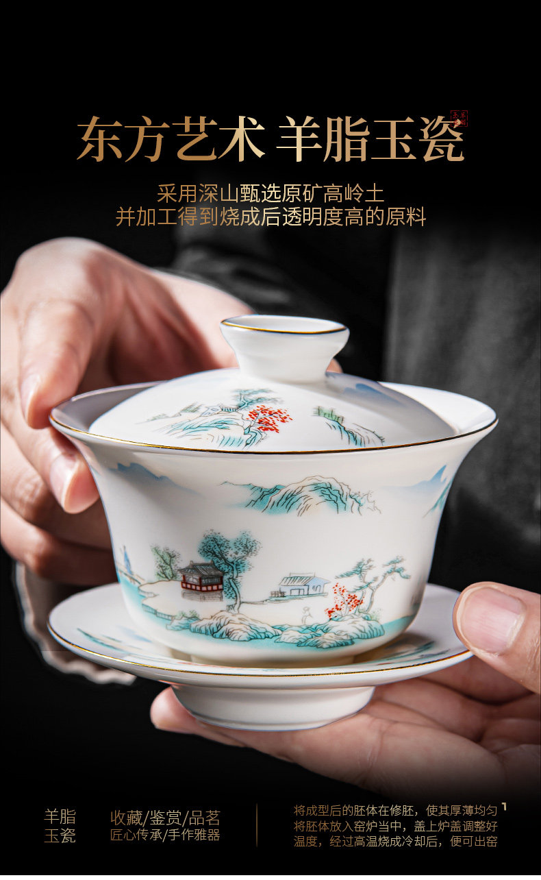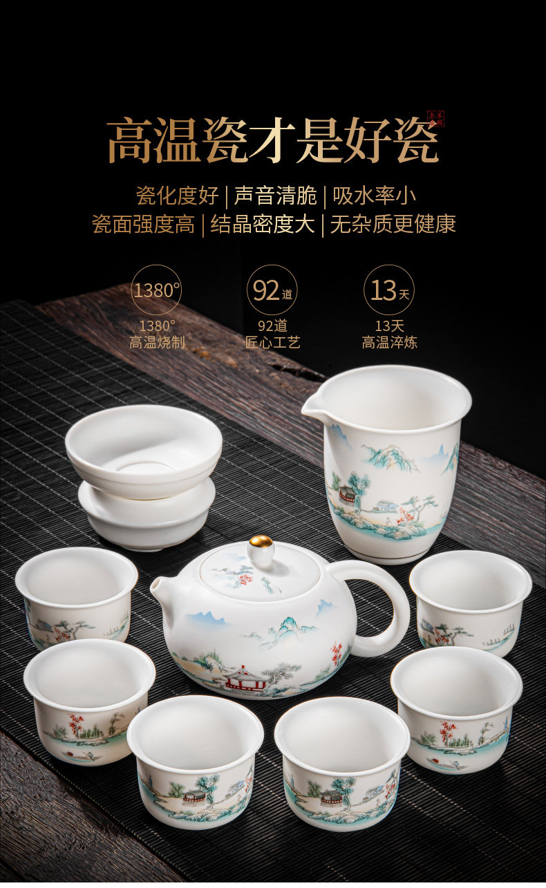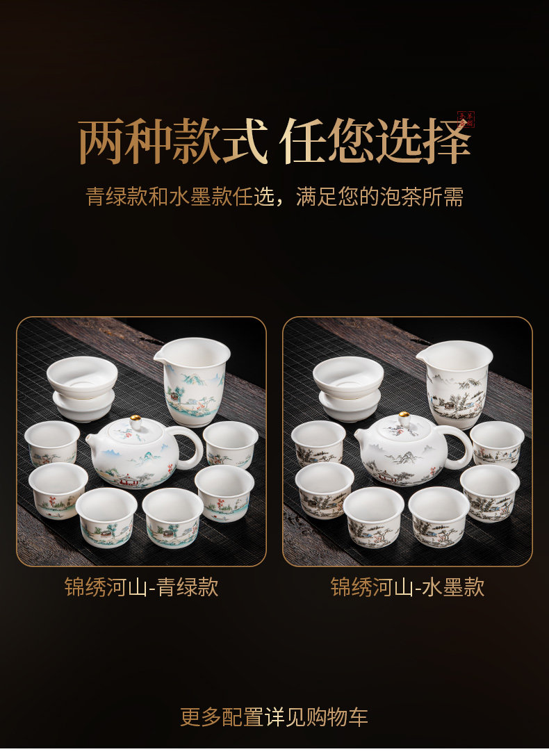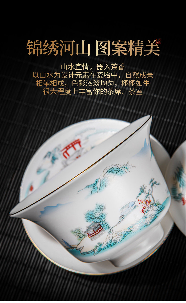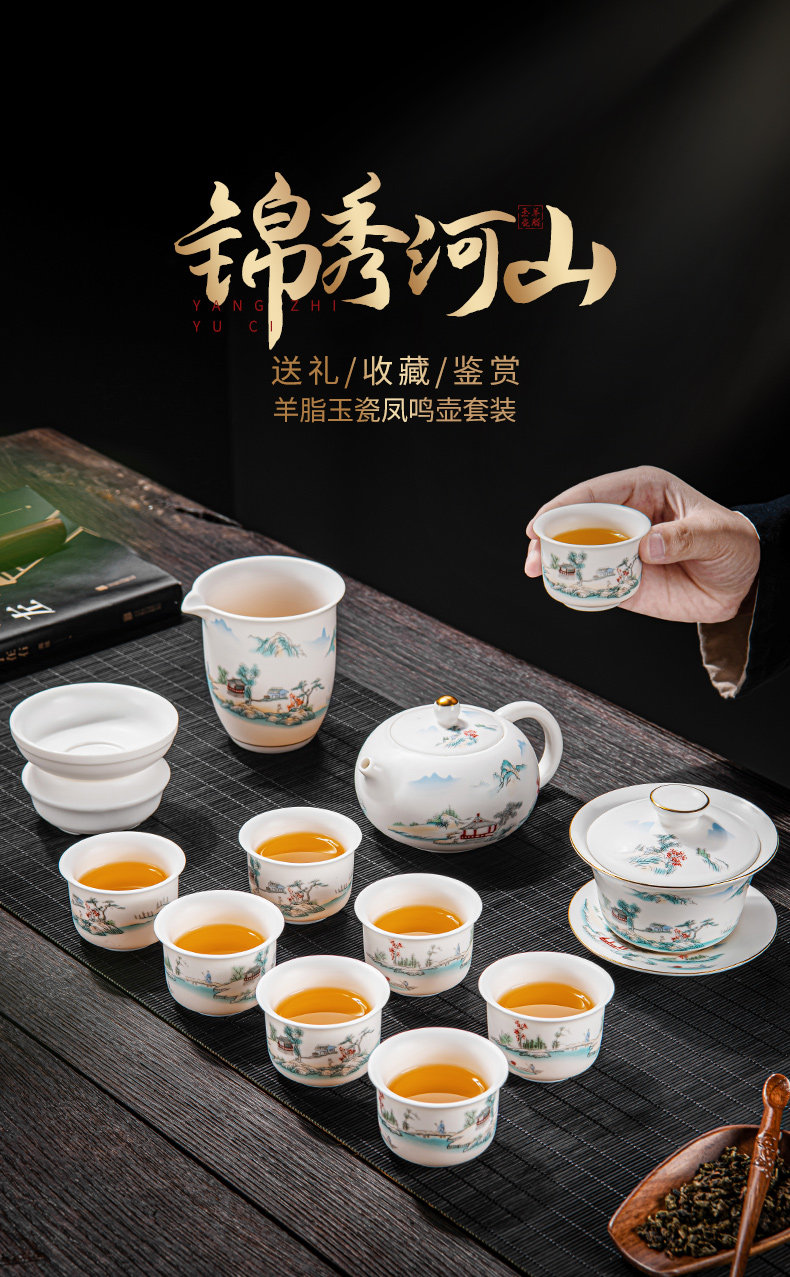 | Color Classification | Mutton Fat Jade Porcelain Splendid Rivers and Mountains Tureen with Six Cups 9-Piece Set (Green Model),Mutton Fat Jade Porcelain Splendid Rivers and Mountains Fengming Pot Six Cups 9-Piece Set (Green Style),Mutton Fat Jade Porcelain Splendid Rivers and Mountains Fengming Teapot Lid Bowl Eight Cups 12-Piece Set (Green Model),Mutton Fat Jade Porcelain Splendid River West River Shih Pot Lid Bowl Eight Cups 12-Piece Set (Green Style) + Chinese Bai Fengming Jiutian Gift Box,Mutton Fat Jade Porcelain Splendid River West River Shih Pot Lid Bowl Eight Cups 12-Piece Set (Ink Style) + Chinese Bai Fengming Jiutian Gift Box |