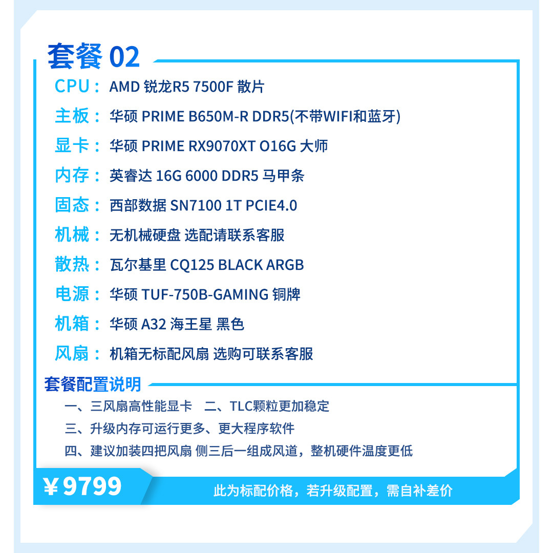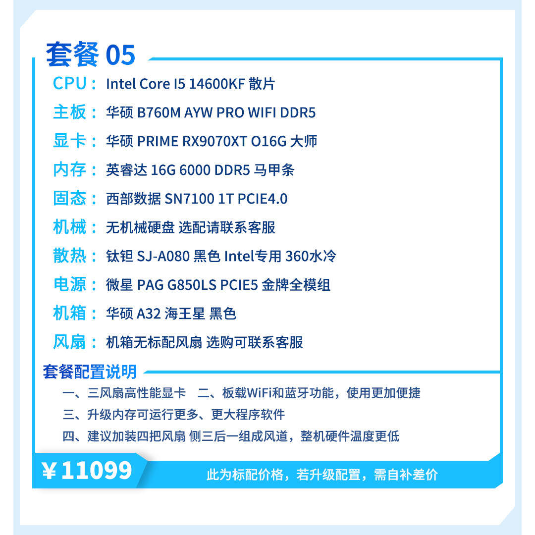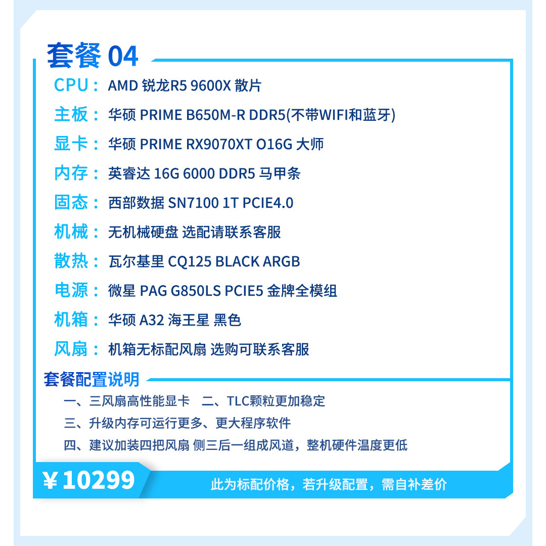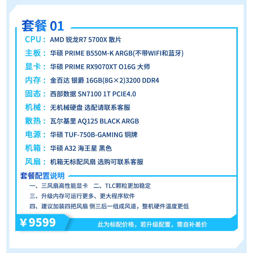 | Package Type | Package 1 (R7 5700X+Rx9070Xt),Package 2 (R5 7500F+Rx9070Xt),Package Three (I5 12600Kf+Rx9070Xt),Package 4 (R5 9600X+Rx9070Xt),Package 5 (I5 14600Kf+Rx9070Xt),Package 6 (R7 9700X+Rx9070Xt),Package 7 (R7 7800X3D+Rx9070Xt),Package 8 (Ultra7 265Kf+Rx9070Xt),Package Nine (R7 9800X3D+Rx9070Xt) |