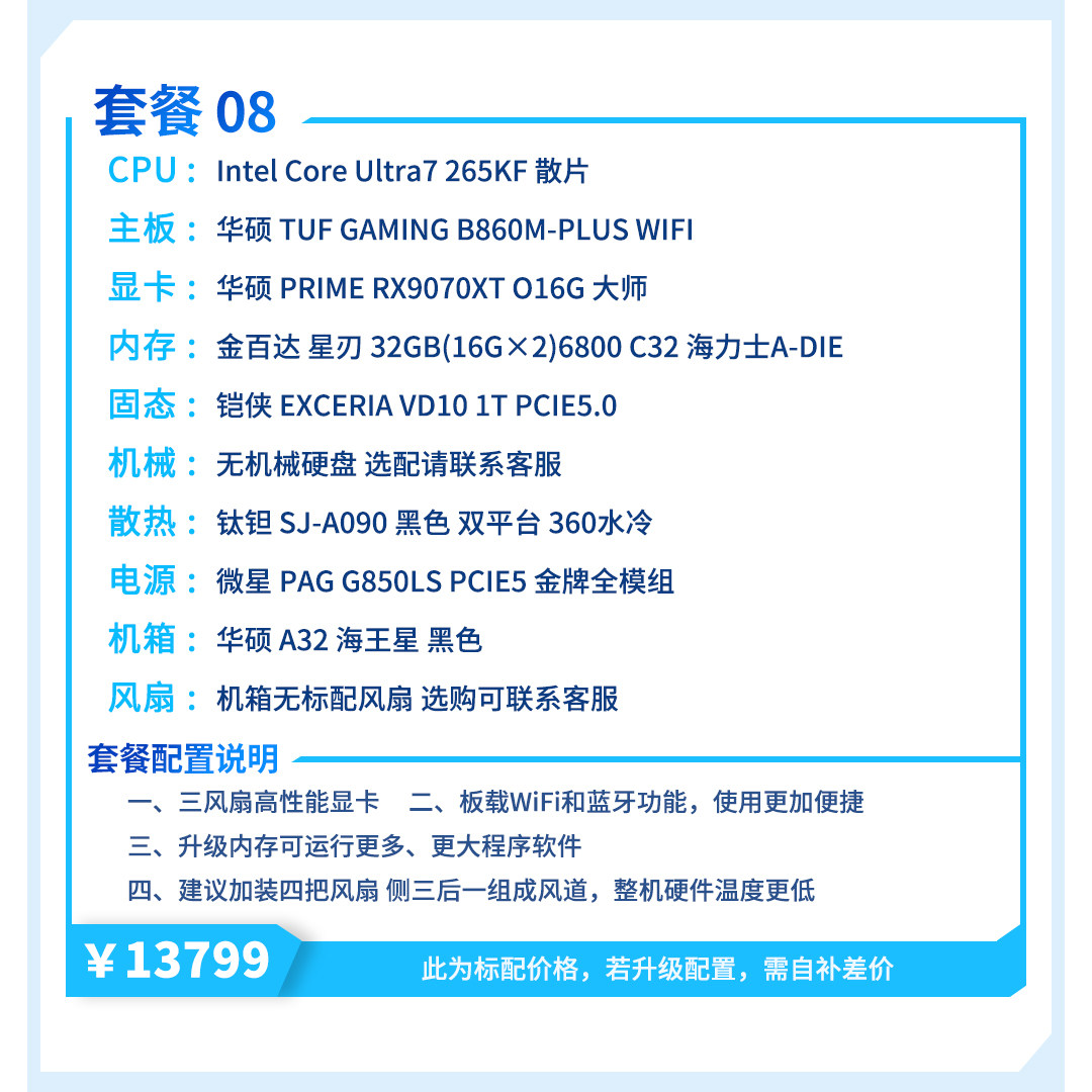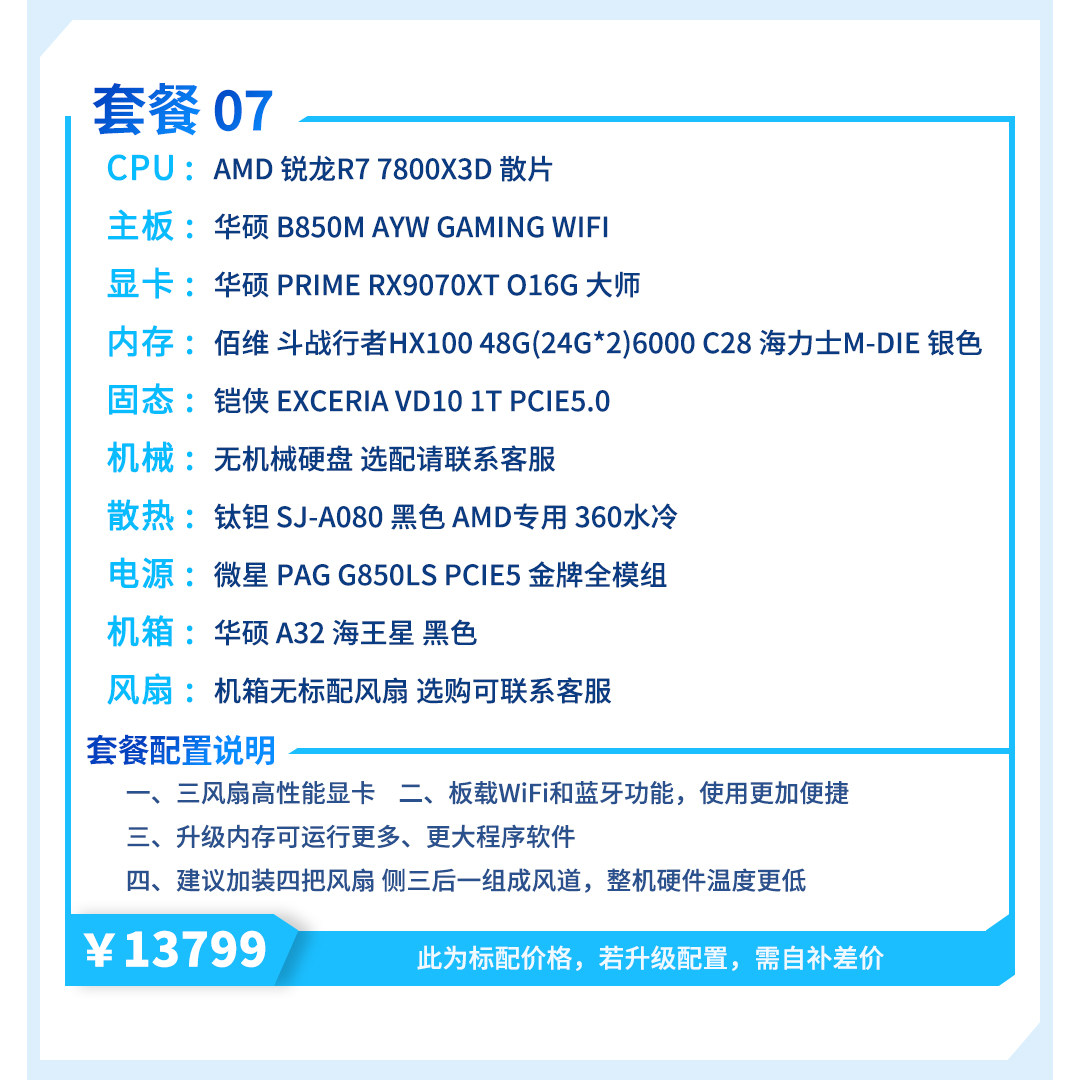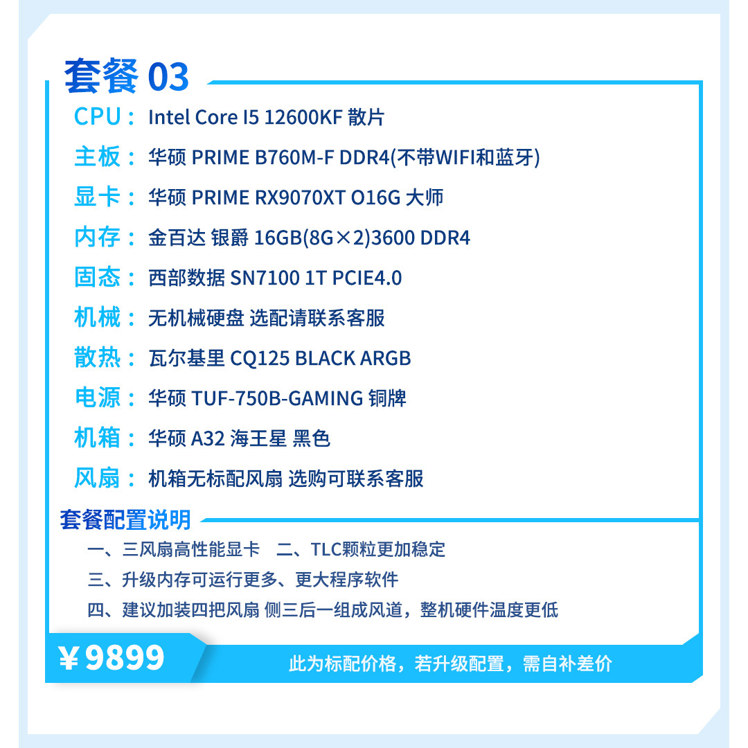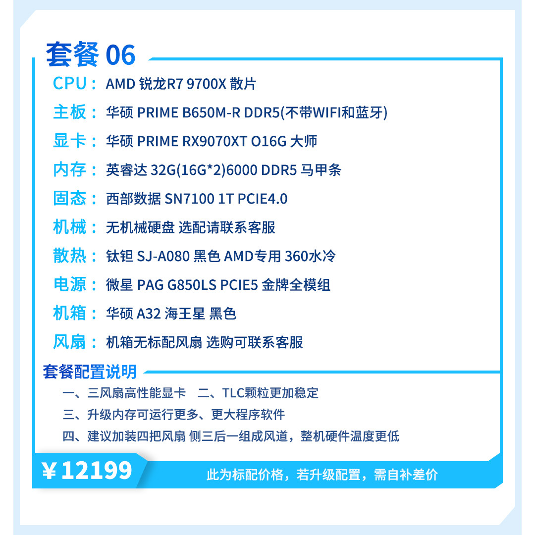 | Package Type | Package 1 (R7 5700X+Rx9070Xt),Package 2 (R5 7500F+Rx9070Xt),Package Three (I5 12600Kf+Rx9070Xt),Package 4 (R5 9600X+Rx9070Xt),Package 5 (I5 14600Kf+Rx9070Xt),Package 6 (R7 9700X+Rx9070Xt),Package 7 (R7 7800X3D+Rx9070Xt),Package 8 (Ultra7 265Kf+Rx9070Xt),Package Nine (R7 9800X3D+Rx9070Xt) |
