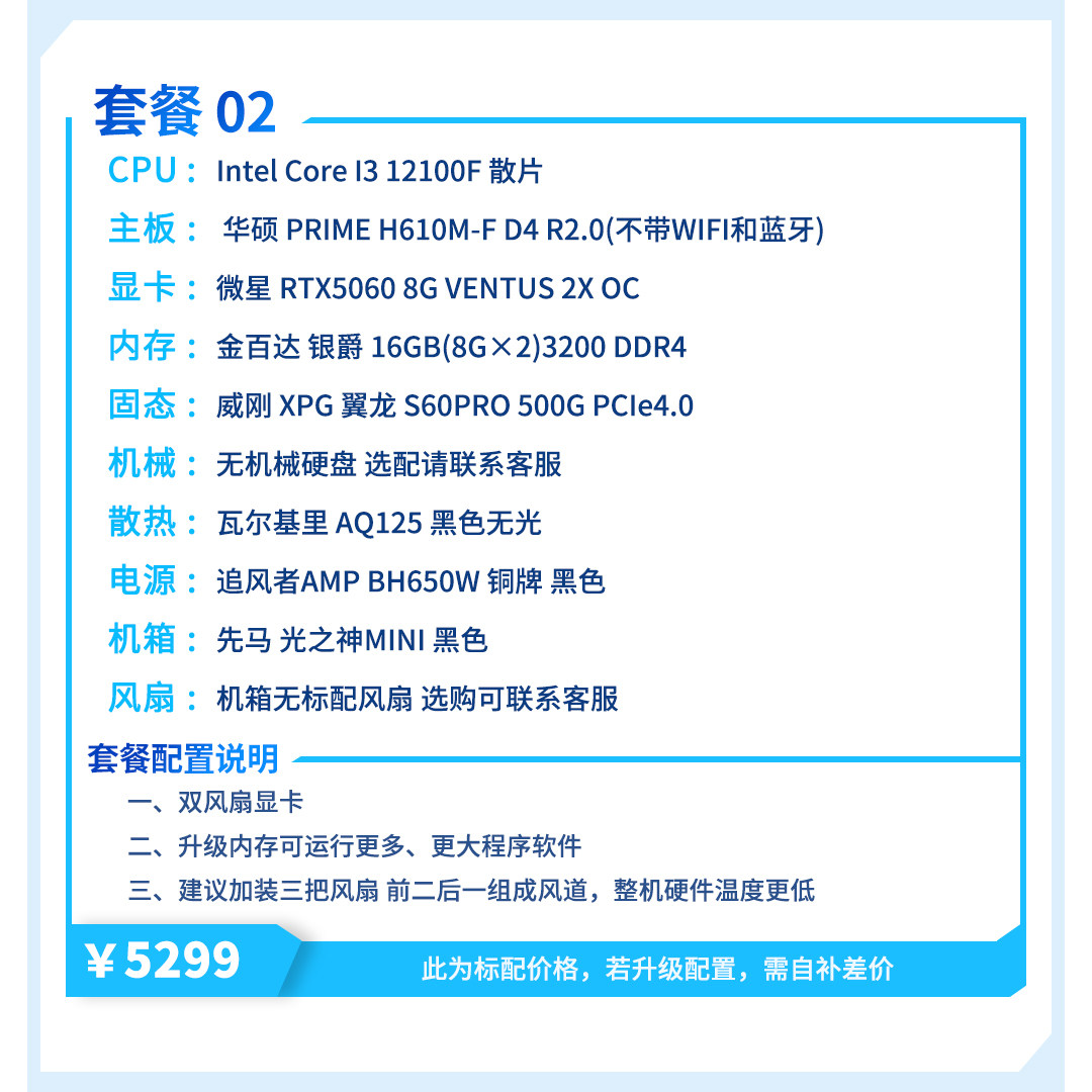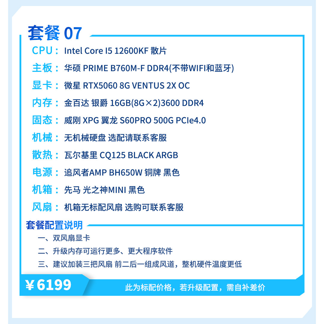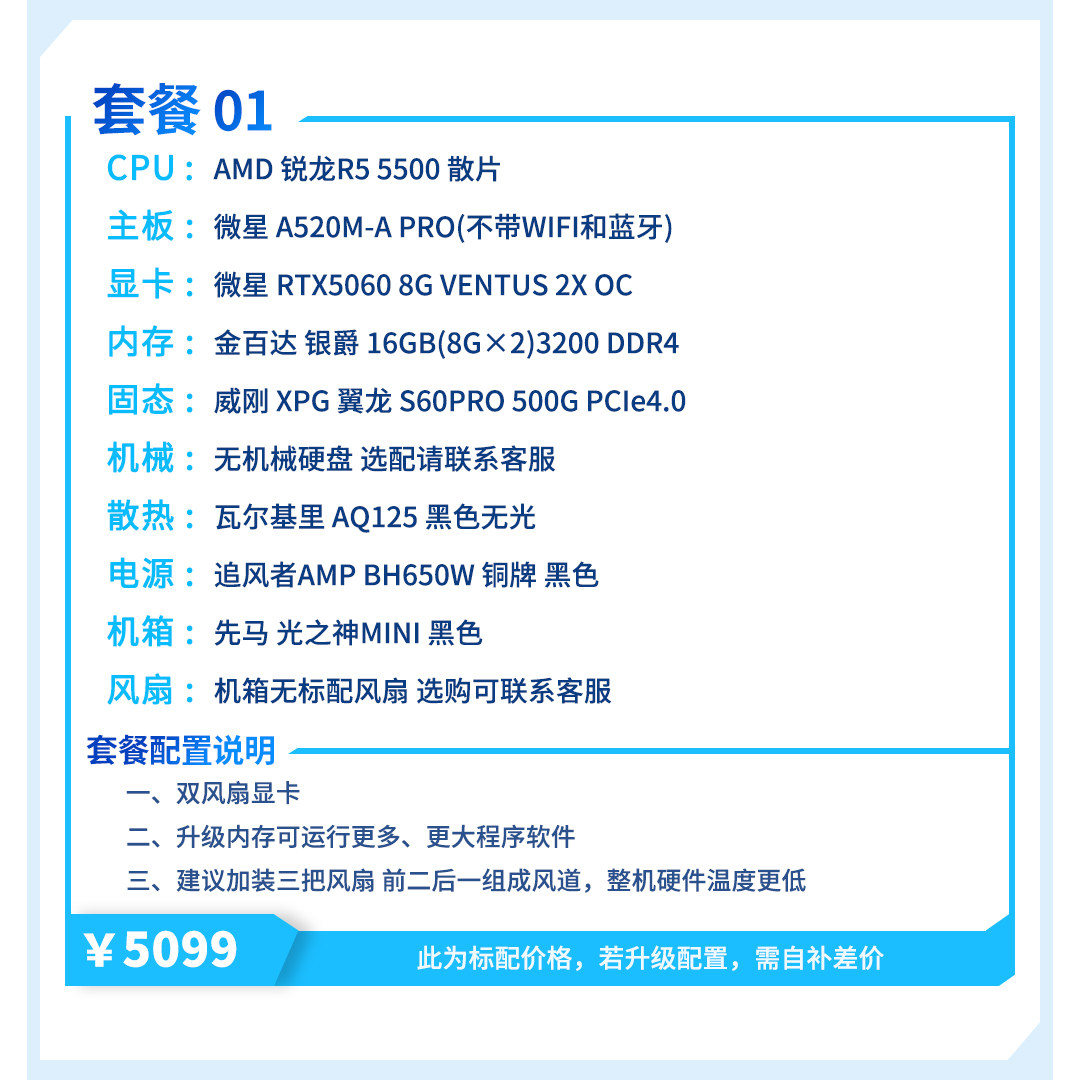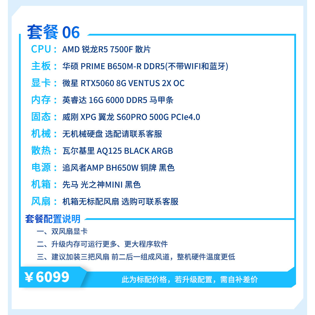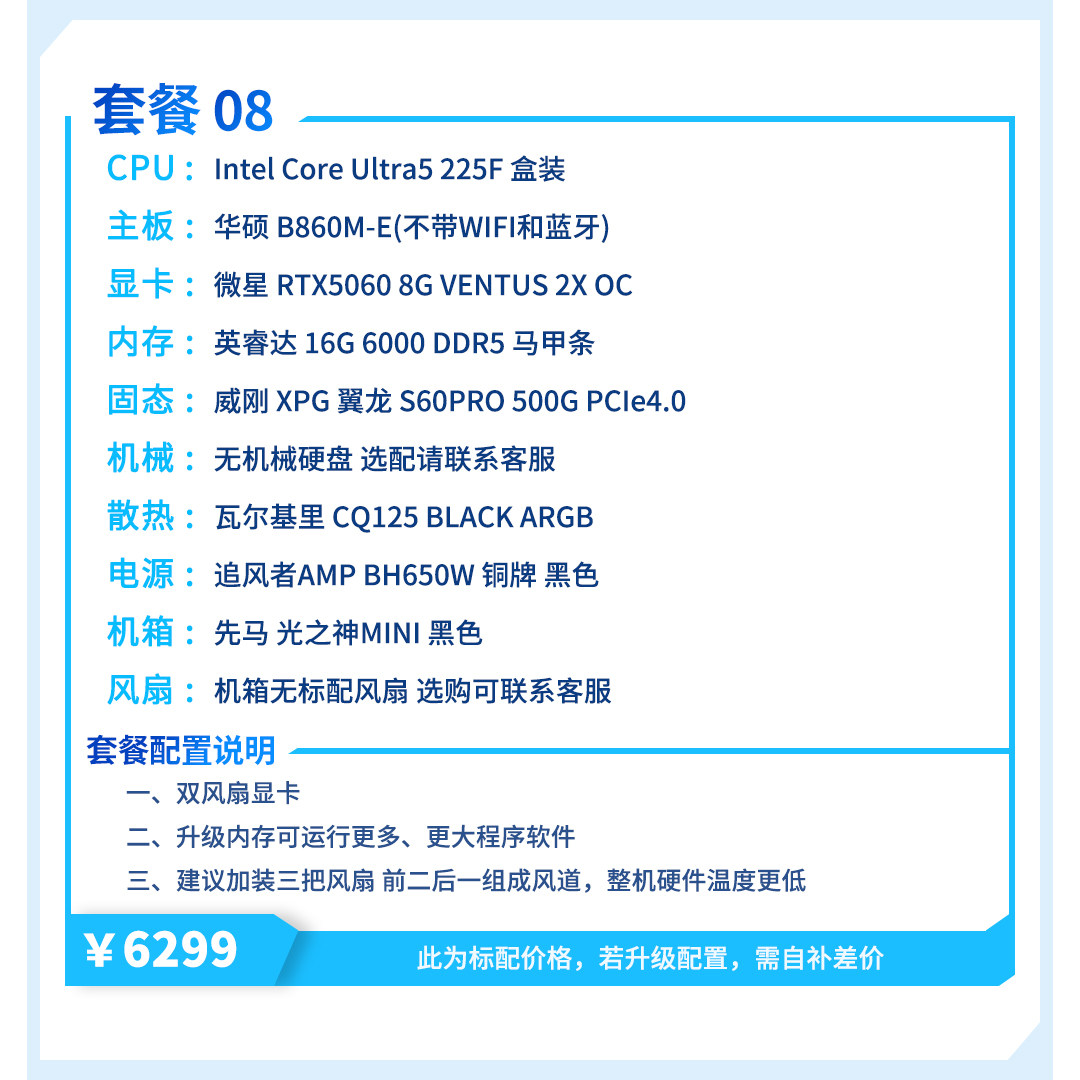 | Package Type | Package 1 (R5 5500+Rtx5060),Package 2 (I3 12100F+Rtx5060),Package Three (R5 5600+Rtx5060),Package 4 (I5 12400F+Rtx5060),Package 5 (R7 5700X+Rtx5060),Package Six (R5 7500F+Rtx5060),Package 7 (I5 12600Kf+Rtx5060),Package 8 (Ultra5 225F+Rtx5060),Package 9 (R5 9600X+Rtx5060),Package 10 (I5 14600Kf+Rtx5060),Package 11 (R7 9700X+Rtx5060) |