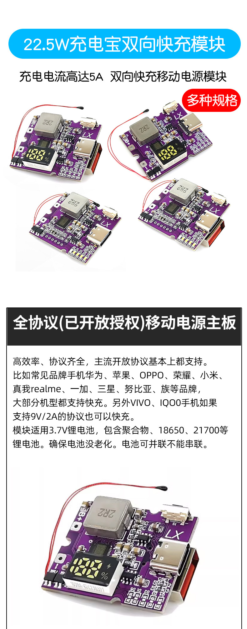 | Model | Pd/Qc Full Protocol Super Fast Charge 22.5W Power Bank Two-Way Fast Charging Mobile Power Module Circuit Board DIY |