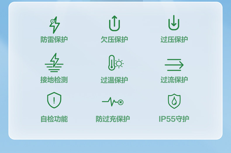 | Safety Protection | Grounding Protection,Overload Protection,Leakage Protection,Over Current Protection,Over Temperature Protection,Short Circuit Protection,Lightning Protection,Overvoltage Protection |