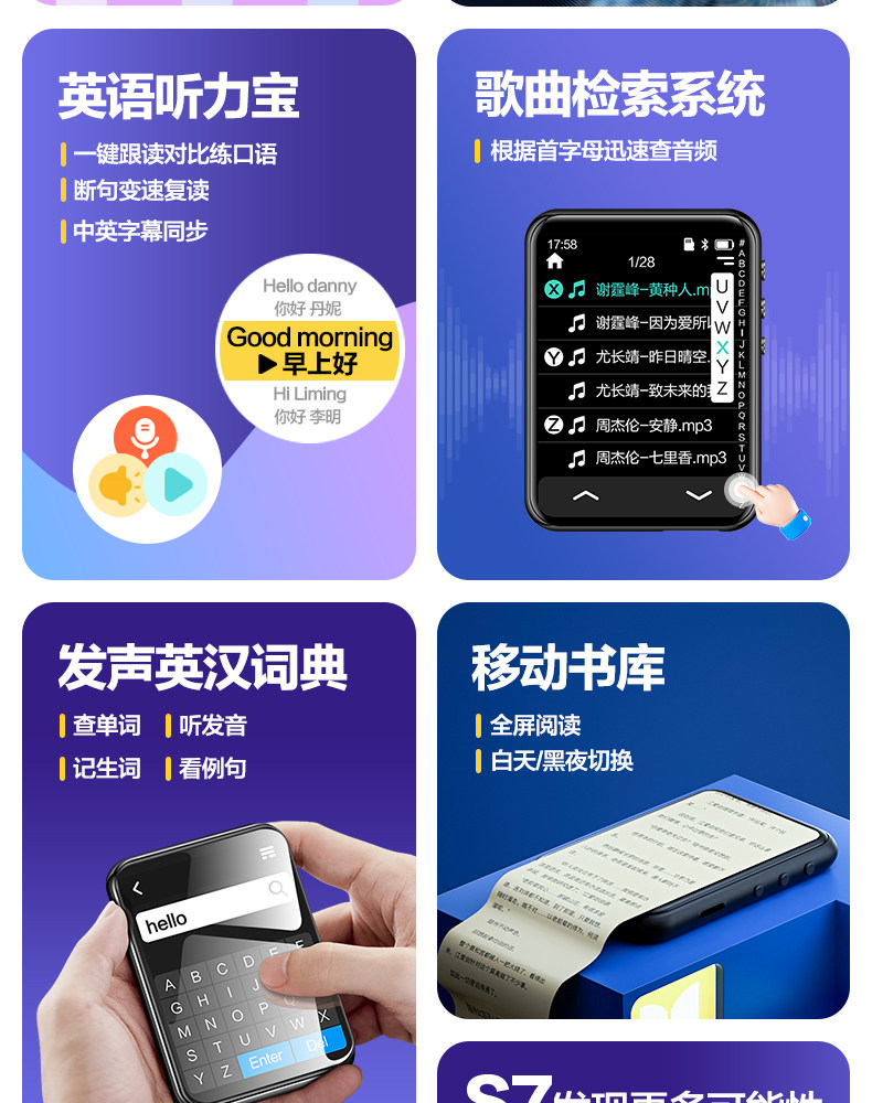 | Color Classification | 2.4inch Keys [Ts4 Pro+] Bluetooth 6.0+ Reading Chapter Selection/Full Screen Eye Protection/Alarm Clock/Phonetic Dictionary/Extra Large Battery,2.4inch Touch [Ts5 Pro+] Bluetooth 6.0+ Reading Chapter Selection/Eye Protection Full Screen/Alarm Clock/ Pronunciation Dictionary/Super Large Battery,3.2inch Touch Screen [S7 Ultra] Bluetooth 6.0 + Word Card + Song Index + Password Lock + Pronunciation Dictionary + Designated Protective Cover Color,3.2inch Photography Model [S6 Ultra+] Bluetooth 6.0+ Photo and Video Recording + Bluetooth Mutual Transmission + Voice Dictionary] + Dark Gray Cover |