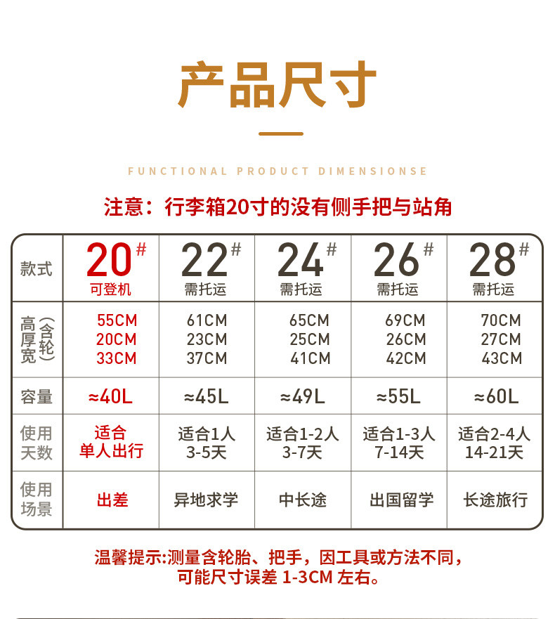 | Size | 20inch Boarding Case[Suitable for 1-5 Days of Travel,Add to Cart for Priority Shipping],22inch Shipping Box[Suitable for 3-7 Days of Travel,Brand Quality Assurance],24inch Shipping Box[Suitable for 5-10 Days Worth of Travel,Quality Inspection Exceeds National Standards],26inch Shipping Box[Suitable for Long Trips over 10 Days,30-Day Hassle-Free Returns and Exchanges],28inch Shipping Box Large Capacity[Very Suitable for School/Abroad/Family Travel,5 Years Warranty] |