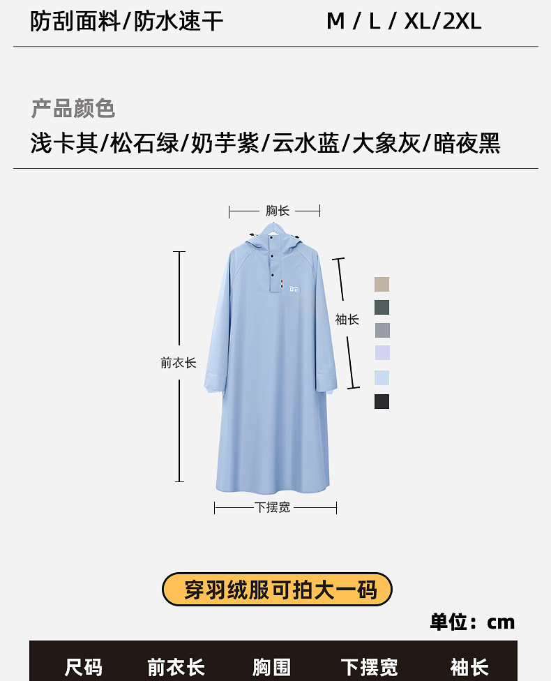 | Color Classification | Size Recommendation[Do Not Shoot]Suitable for Various Outfits,Light Khaki[Upgraded Version with Heightened Rainproof Neckline],Milk Taro Purple[Upgraded Version with Heightened Rainproof Neckline],Elephant Gray[Upgraded Version with Heightened Rainproof Neckline],Turquoise Green[Upgraded Version with Heightened Rainproof Neckline],Sea Blue[Upgraded Version with Heightened Rainproof Neckline],Dark Night[Upgraded Version with Heightened Rainproof Neckline],Sea Blue[Regular Style, Enlarged and Lengthened to Cover the Feet],[Promotional Item]One-Size-Fits-All Simple Trench Coat[Random Delivery] |