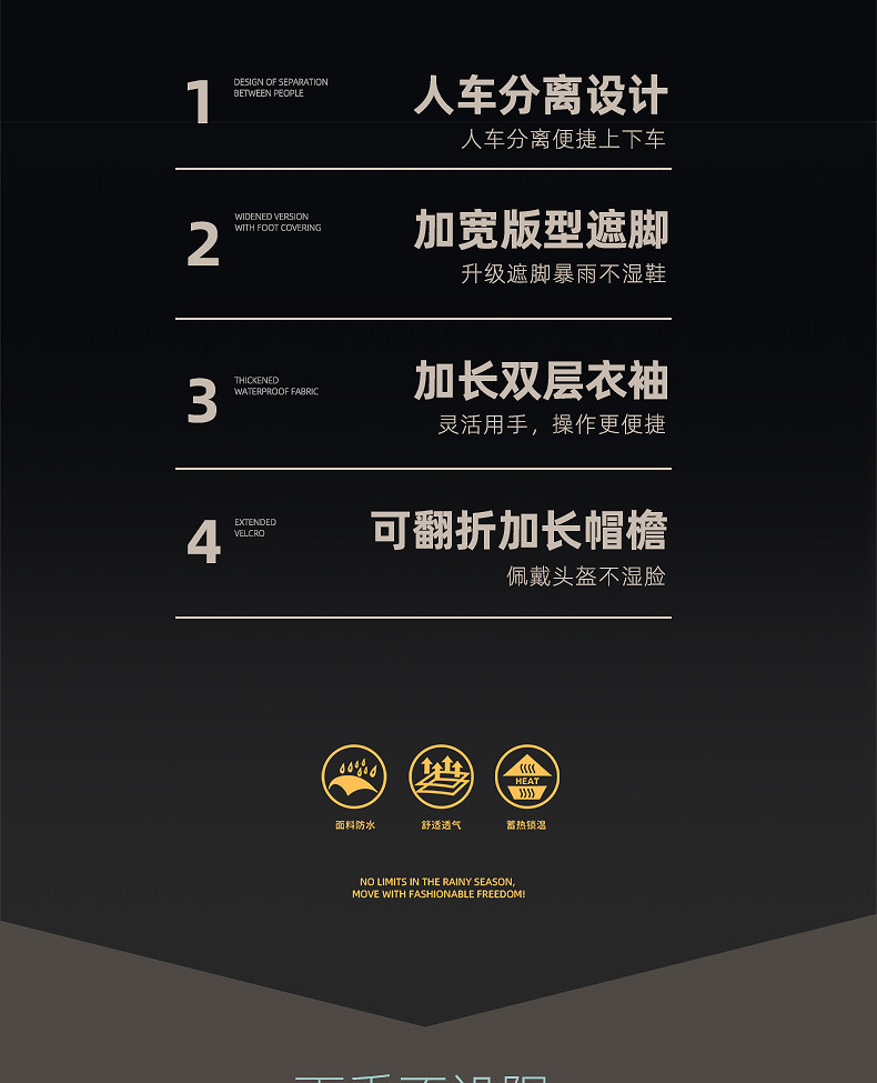 | Function | Full Body Rainproof Adult Outer Wear with Separate Person and Vehicle |