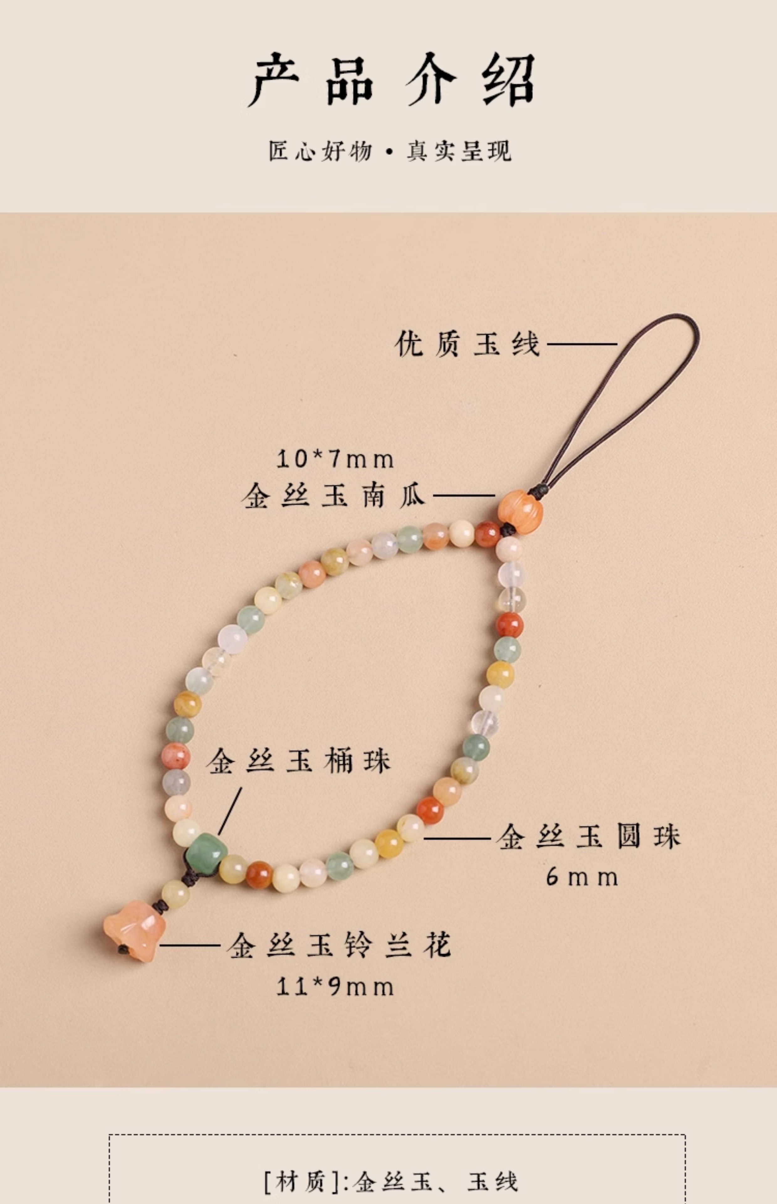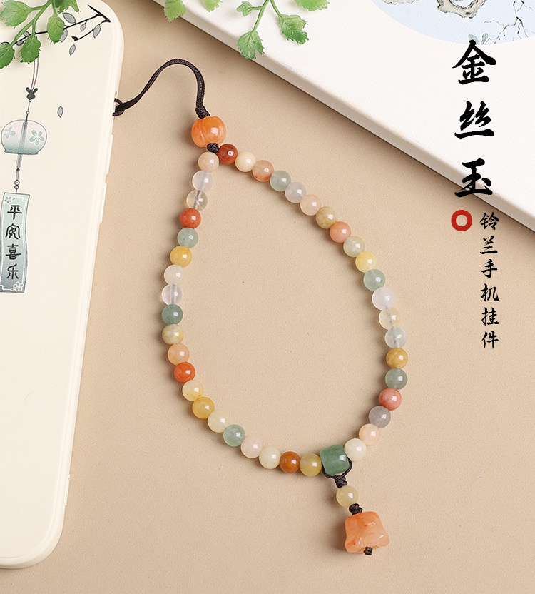 Golden Silk Jade Colorful Phone Chain Exquisite Pendant Women's Phone Case Lanyard Lily of the Valley Wrist Strap Anti-Lost Ornament Vintage Ornament Phone Case Small Pendant Creative Simple Fashion Chinese Style