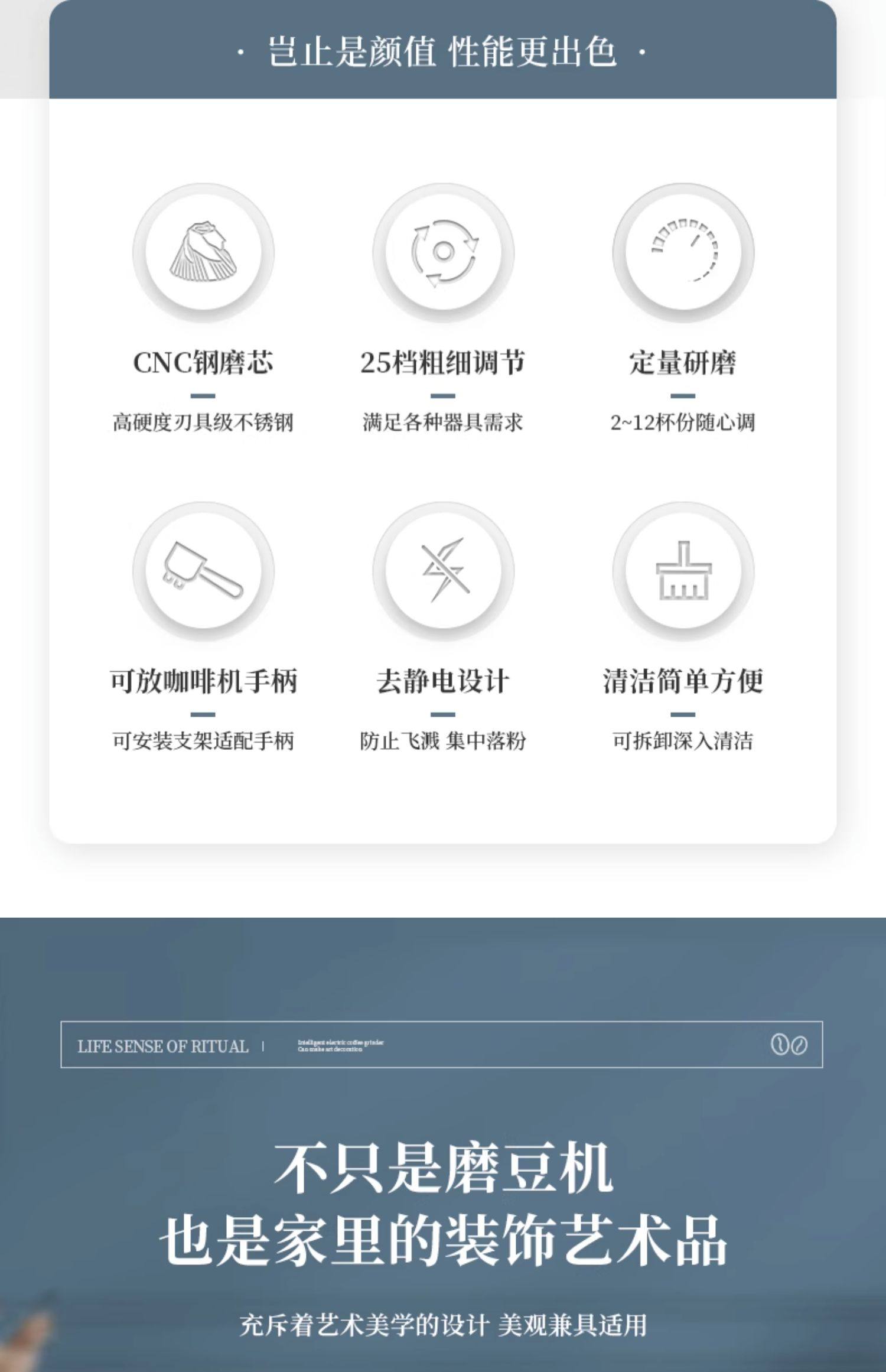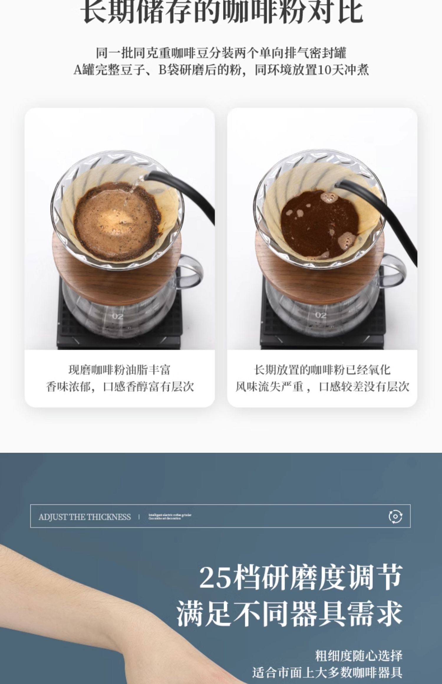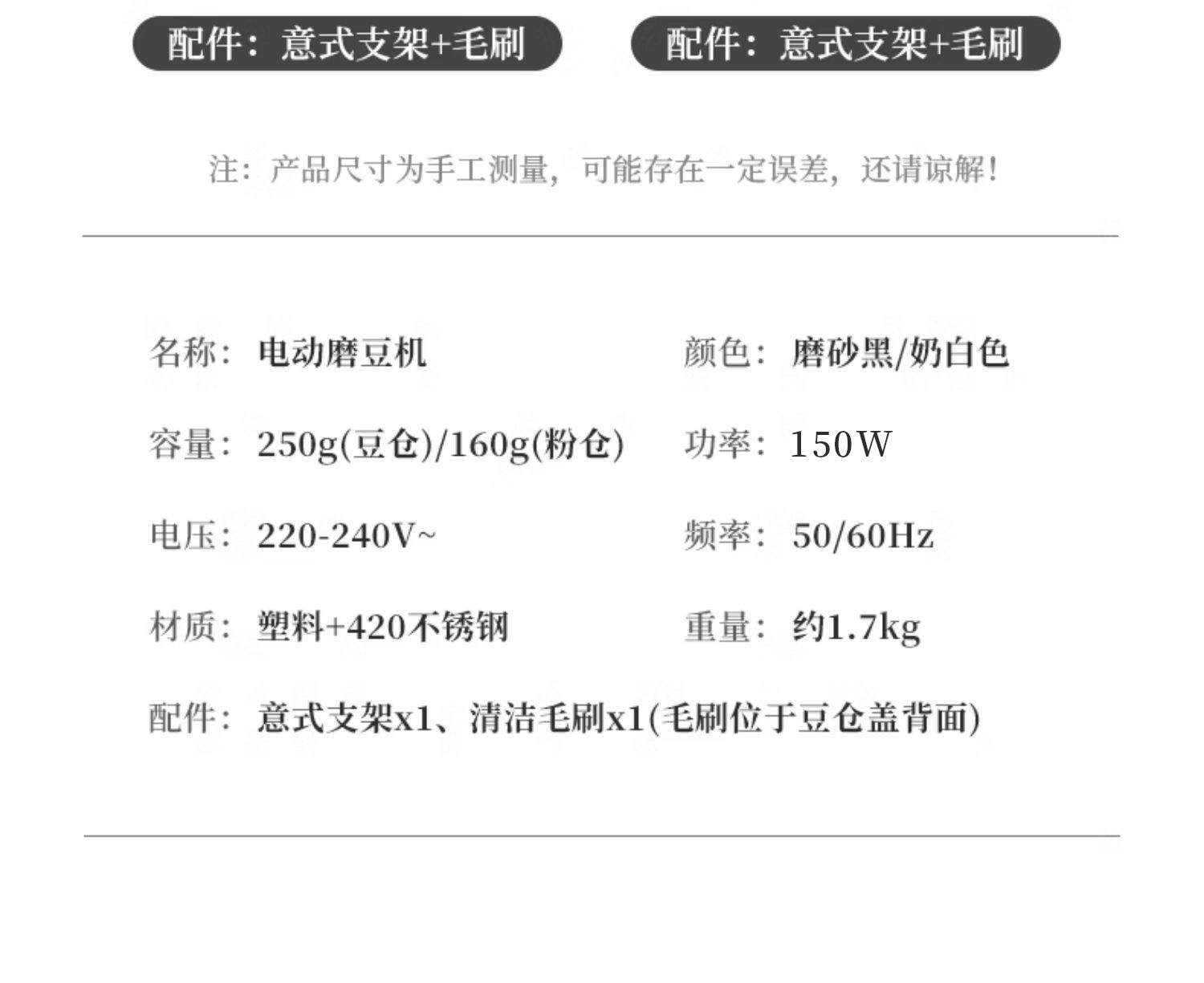 | Color Classification | -----The Following Is a Mechanical Button Grinder-----,Mechanical Model-Cream White[25 Levels of Adjustment],Mechanical Model-Classic Black[25 Levels of Adjustment],Mechanical Model-Cream White + Powder Shaker[Suitable for 51/53mm Handle],Mechanical Model-Classic Black + Powder Shaker[Suitable for 51/53mm Handle],Mechanical Model-Cream White[Comes with 51mm Handle Bracket]+Coffee Powder Cup 58mm[Compatible with 58mm Portafilters When Used with a Dosing Funnel],Mechanical Model-Classic Black[Comes with 51mm Handle Bracket]+Coffee Powder Cup 58mm[Compatible with 58mm Portafilters When Used with a Dosing Funnel],Mechanical Model - Cream White (Comes with 51mm Handle Bracket) + Powder Shaker + Coffee Powder Cup 58mm[Compatible with 58mm Portafilters When Used with a Dosing Funnel],Mechanical Model - Classic Black (Comes with 51mm Handle Bracket) + Powder Shaker + Coffee Powder Cup 58mm[Compatible with 58mm Portafilters When Used with a Dosing Funnel],Mechanical Model-Cream White + Stainless Steel Sealed Jar 1.5L[Can Hold about 500g of Coffee Beans],Mechanical Model-Classic Black + Stainless Steel Sealed Jar 1.5L[Can Hold about 500g of Coffee Beans],Mechanical Model-Cream White + Powder Shaker + Stainless Steel Sealed Jar 1.5L[Can Hold about 500g of Coffee Beans],Mechanical Model-Classic Black + Powder Shaker + Stainless Steel Sealed Jar 1.5L[Can Hold about 500g of Coffee Beans],-----The Following Is a Touch-Controlled Digital Display Grinder-----,Touch Screen Model-Cream White[Digital Display/25 Levels of Adjustment],Touch Screen Model-Classic Black[Digital Display/25 Levels of Adjustment],Touchscreen Model-Cream White + Powder Shaker[Suitable for 51/53mm Handle],Touchscreen Model-Classic Black + Powder Shaker[Suitable for 51/53mm Handle],Touch Screen Model-Cream White + Coffee Powder Cup 58mm[Suitable for 58mm Portafilters],Touch Screen Model-Classic Black + Coffee Cup 58mm[Suitable for 58mm Portafilters],Touch Screen Model - Cream White + Powder Shaker + Coffee Powder Cup 58mm[Suitable for 58mm Portafilters],Touch Screen Model - Classic Black + Powder Shaker + Coffee Powder Cup 58mm[Suitable for 58mm Portafilters],Touch Screen Model-Cream White + Stainless Steel Sealed Jar 1.5L[Can Hold about 500g of Coffee Beans],Touch Screen Model-Classic Black + Stainless Steel Sealed Jar 1.5L[Can Hold about 500g of Coffee Beans],Touchscreen Model - Cream White + Powder Shaker + Stainless Steel Sealed Jar 1.5L[Can Hold about 500g of Coffee Beans],Touchscreen Model - Classic Black + Powder Shaker + Stainless Steel Sealed Jar 1.5L[Can Hold about 500g of Coffee Beans] |