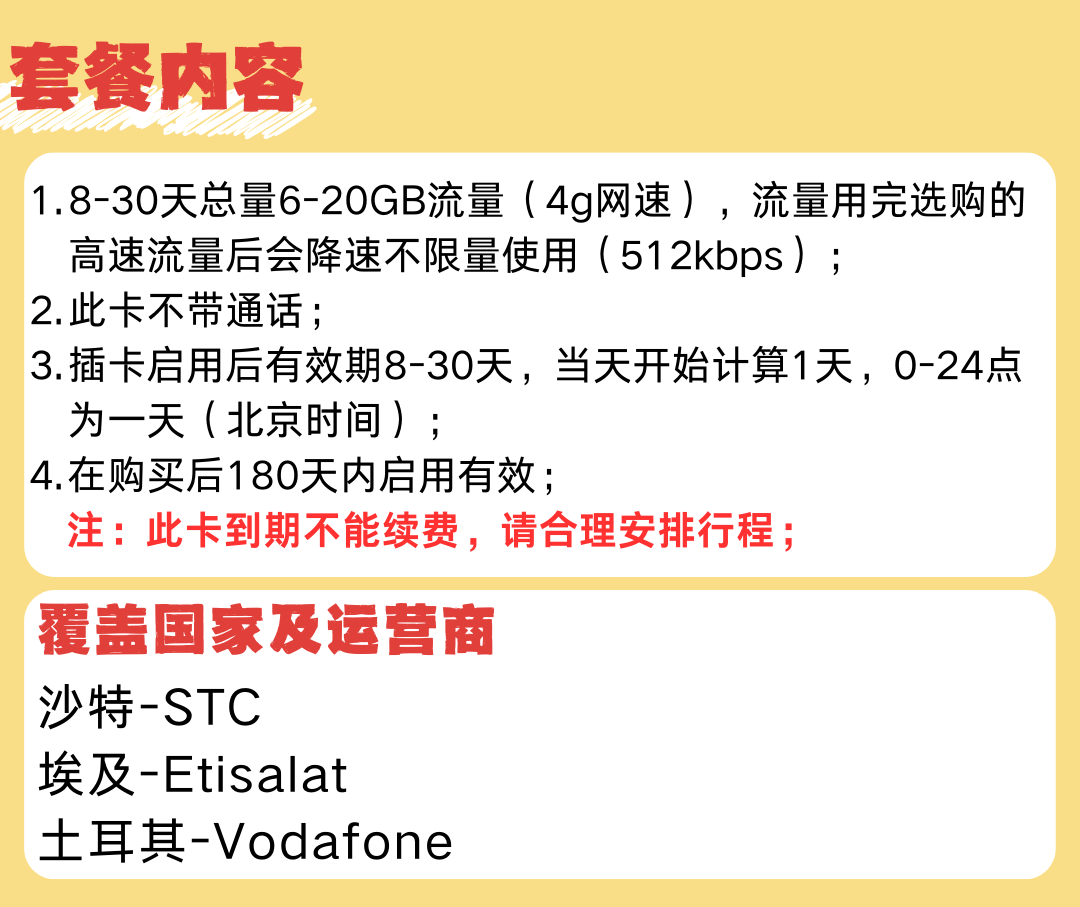 | Package | [Saudi Arabia, Egypt, Turkey] 30 Days 3g + Unlimited Data,[Saudi Arabia, Egypt, Turkey] 11 Days 6g + Unlimited,[Saudi Arabia, Egypt, Turkey] 14 Days 6g + Unlimited,[Saudi Arabia, Egypt, Turkey] 16 Days 6g + Unlimited,[Saudi Arabia, Egypt, Turkey] 19 Days 6g + Unlimited,[Saudi Arabia, Egypt, Turkey] 21 Days 6g + Unlimited,[Saudi Arabia, Egypt, Turkey] 25 Days 6g + Unlimited,[Saudi Arabia, Egypt, Turkey] 30 Days 6g + Unlimited,[Saudi Arabia, Egypt, Turkey] 8 Days 10g+ Unlimited,[Saudi Arabia, Egypt, Turkey] 10g+ Unlimited Data in 11 Days,[Saudi Arabia, Egypt, Turkey] 10g+ Unlimited Data in 14 Days,[Saudi Arabia, Egypt, Turkey] 16 Days 10g+ Unlimited,[Saudi Arabia, Egypt, Turkey] 10g + Unlimited Data in 19 Days,[Saudi Arabia, Egypt, Turkey] 10g+ Unlimited for 21 Days,[Saudi Arabia, Egypt, Turkey] 10g+ Unlimited in 25 Days,[Saudi Arabia, Egypt, Turkey] 10g+ Unlimited for 30 Days,[Saudi Arabia, Egypt, Turkey] 20g+ Unlimited for 30 Days |