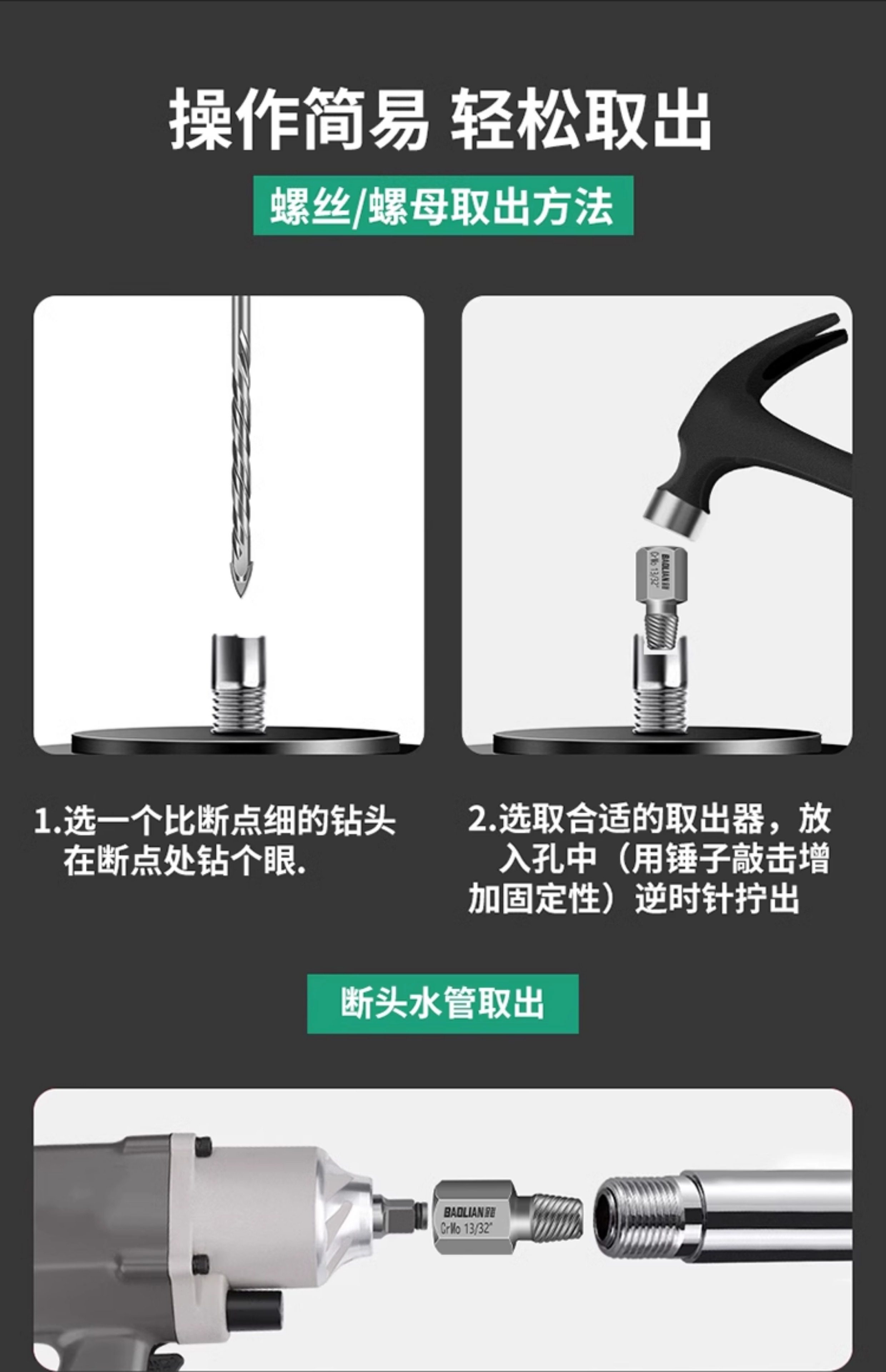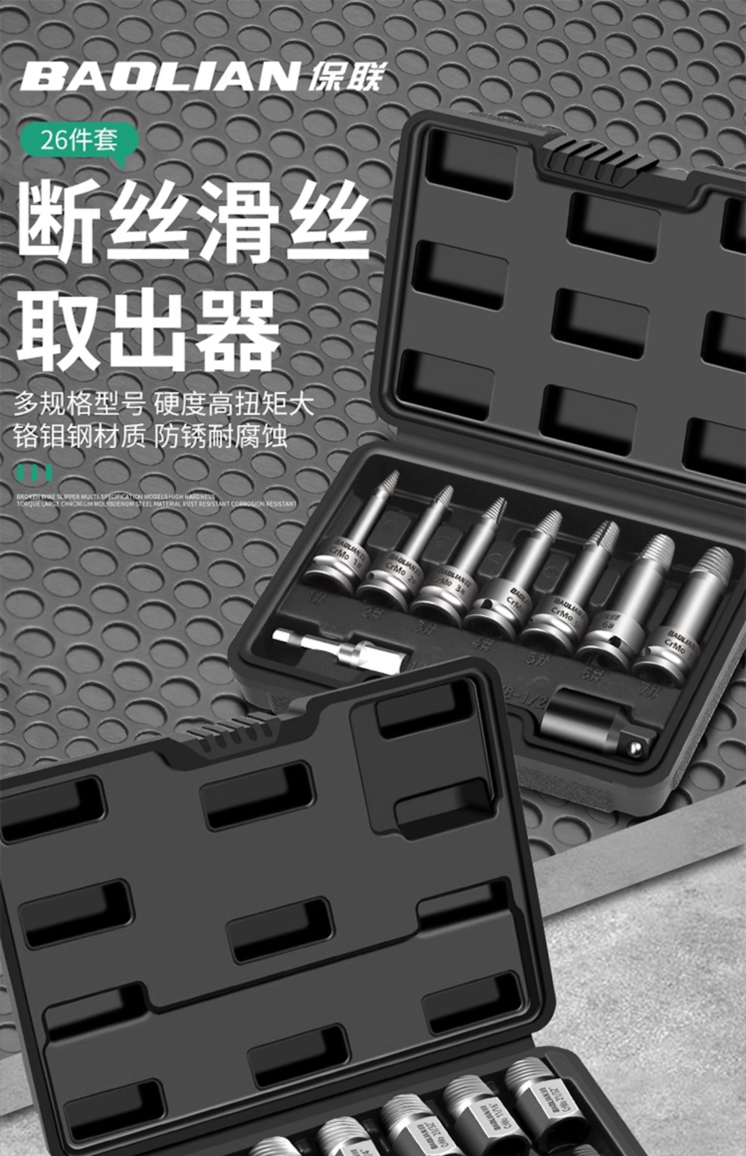 | Color Classification | 3/8 Broken Wire Extractor[9 Piece Set],3/8 Broken Wire Extractor[9 Piece Set]+ 10inch Curved Rods,3/8 Nut Extractor[11 Piece Set],3/8 Nut Extractor[11 Piece Set]+ 10inch Curved Rods,3/8 Nut Extractor[11 Piece Set]+ 14inch Curved Rods,1/2 Broken Wire Extractor[27-Piece Set],1/2 Broken Wire Extractor[27-Piece Set]+ 10inch Curved Rods,1/2 Broken Wire Extractor[27-Piece Set]+ 14inch Curved Rods,Air Impact Wrench Combination Screw Extractor 7-Piece Set,Impact Wrench Combination Screw Extractor 10-Piece Set |