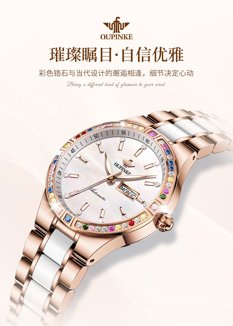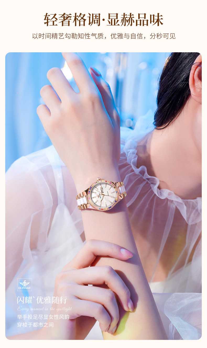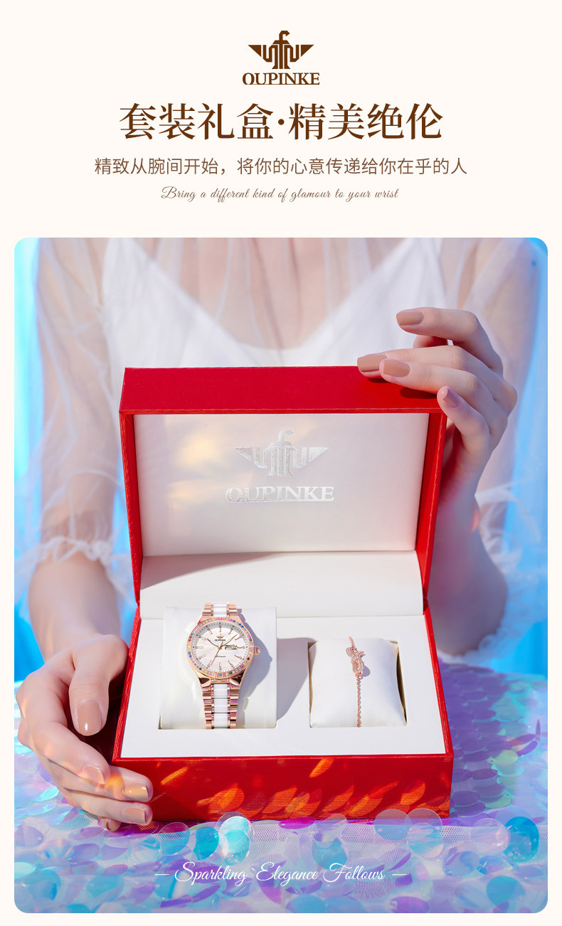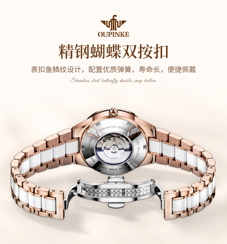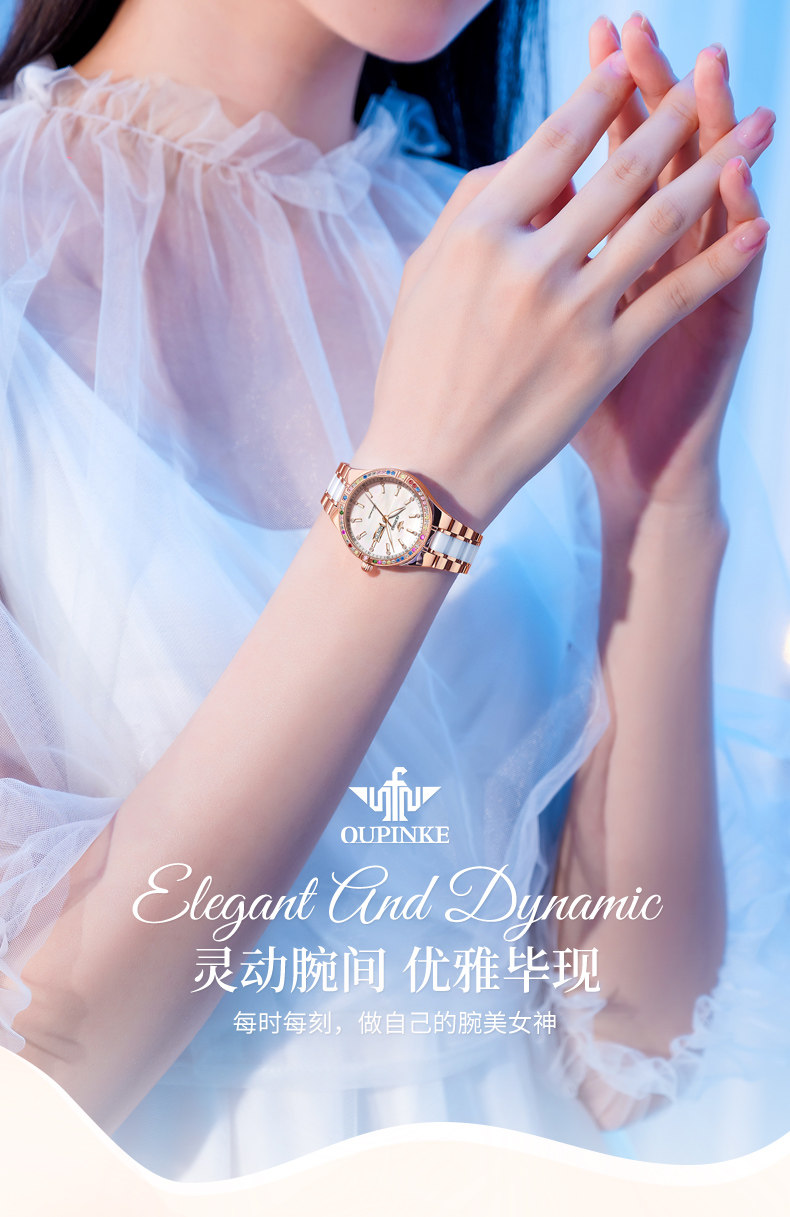 New Year's Gift Swiss Oupinke Brand Genuine Watch Women's Mechanical Watch Fashionable Light Luxury Niche Ceramic Women's Model