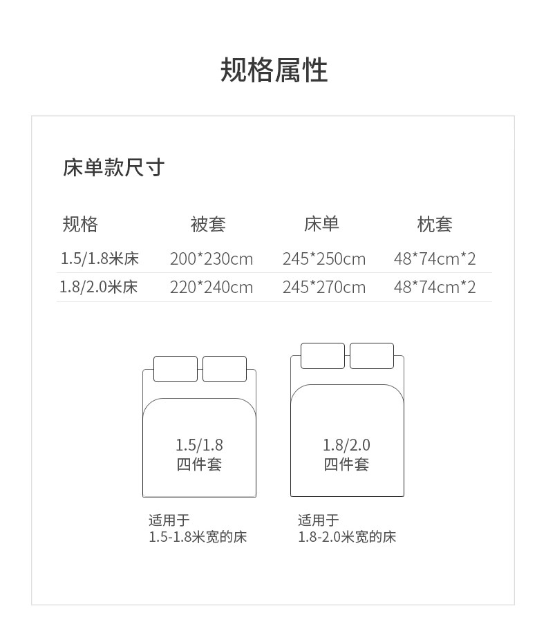 | Applicable Bed Size | 1.5m Bed Sheet (Set of Four) [Applicable to 200*230cm Quilt Core],1.8m Bed Sheet (Set of Four) [Applicable to 200*230cm Quilt Core],2.0m Bed Sheet (Set of Four) [Applicable to 220*240cm Quilt Core] |