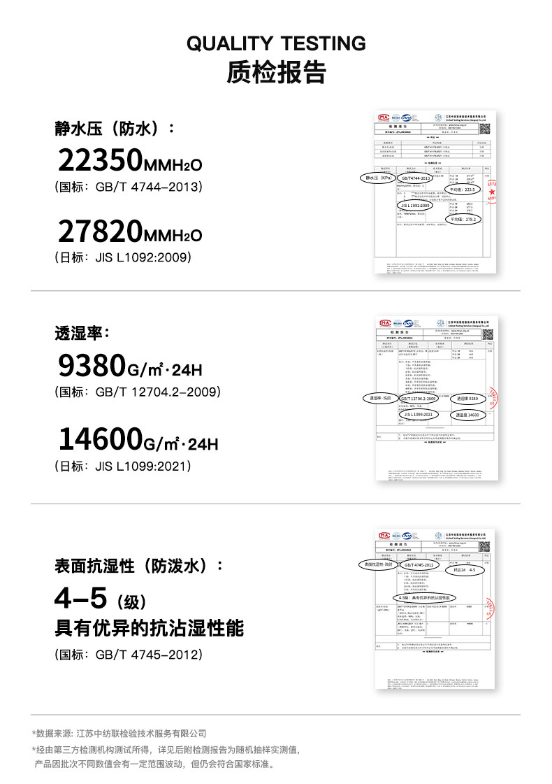 | Moisture Permeability | Moisture Permeability: ≥7000G/(before Washing)㎡*24H) ≥6000G/(after Washing㎡*24 Hours) |