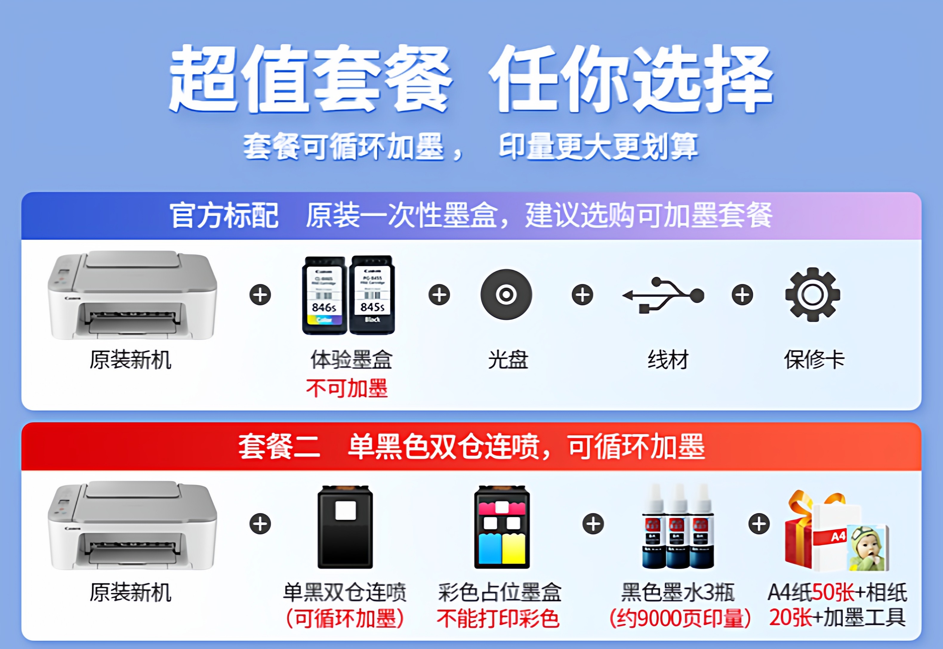 | Color Classification | Ts3480 White Gray [Built-In Wifi] Mobile Phone + Computer + Remote + Printing, Copying and Scanning✅Get a 20 Yuan Red Envelope + A4 Paper/Photo Paper✅,Ts3480 Black [Built-In Wifi] Mobile Phone + Computer + Remote + Printing, Copying and Scanning✅Get a 20 Yuan Red Envelope + A4 Paper/Photo Paper✅,Mg2580 White [5g Wireless Model] Dual-Band Wifi + Mobile Phone + Computer + Remote + Printing, Copying and Scanning✅Get a 20 Yuan Red Envelope + A4 Paper/Photo Paper✅,Mg2580 Black [5g Wireless Model] Dual-Band Wifi + Mobile Phone + Computer + Remote + Printing, Copying and Scanning✅Get a 20 Yuan Red Envelope + A4 Paper/Photo Paper✅,Mg2580 White [Computer Model] Only Connects to Computer Via USB + Print, Copy and Scan✅Get a 20 Yuan Red Envelope + A4 Paper/Photo Paper✅,Mg2580 Black [Computer Model] Only Connects to Computer Via USB + Print, Copy and Scan✅Get a 20 Yuan Red Envelope + A4 Paper/Photo Paper✅,Ts308T Black [Single Printing Function] Only Supports Printing,✅Consult Customer Service to Receive a Large Discount + a 20 Yuan Red Envelope✅,✅ Package 2 Can Print in Black, Packages 3 and 4 Can Print in Black and Color, 90% of Home Users Choose Package 3 ✅ |