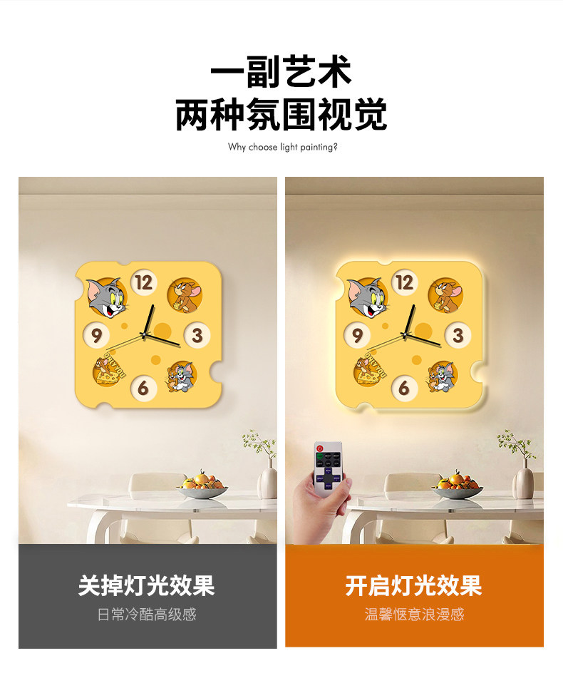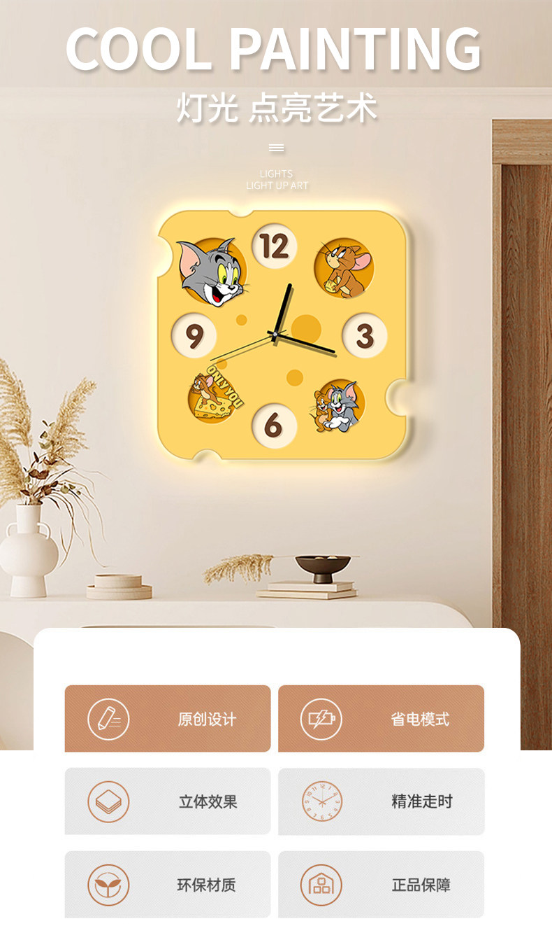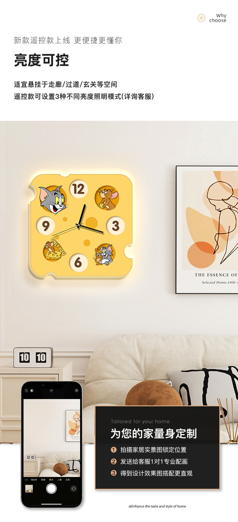 Tom and Jerry Living Room Wall Clock, Cream Style Dining Room Wall Lamp, Silent Creative No-Drill Clock