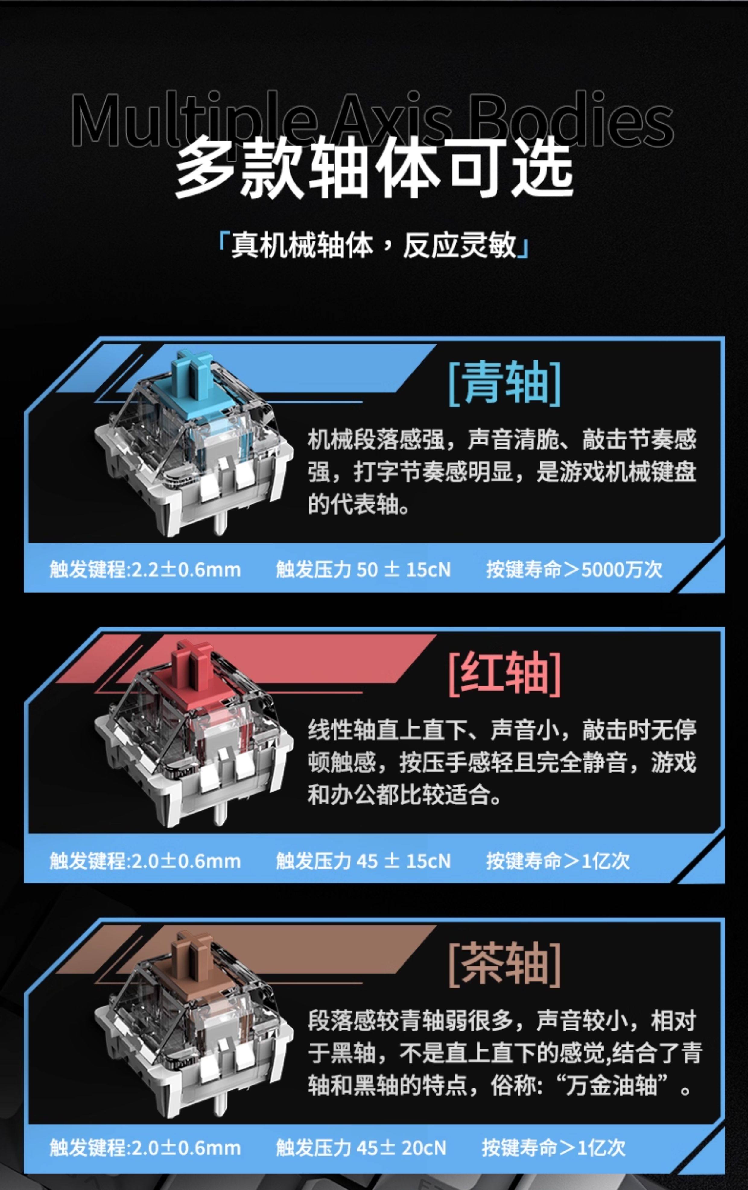 | Axis Name | Green Axis (Crisp Feel),Brown Switch (Typing Office),Red Axis (Soft and Comfortable) |