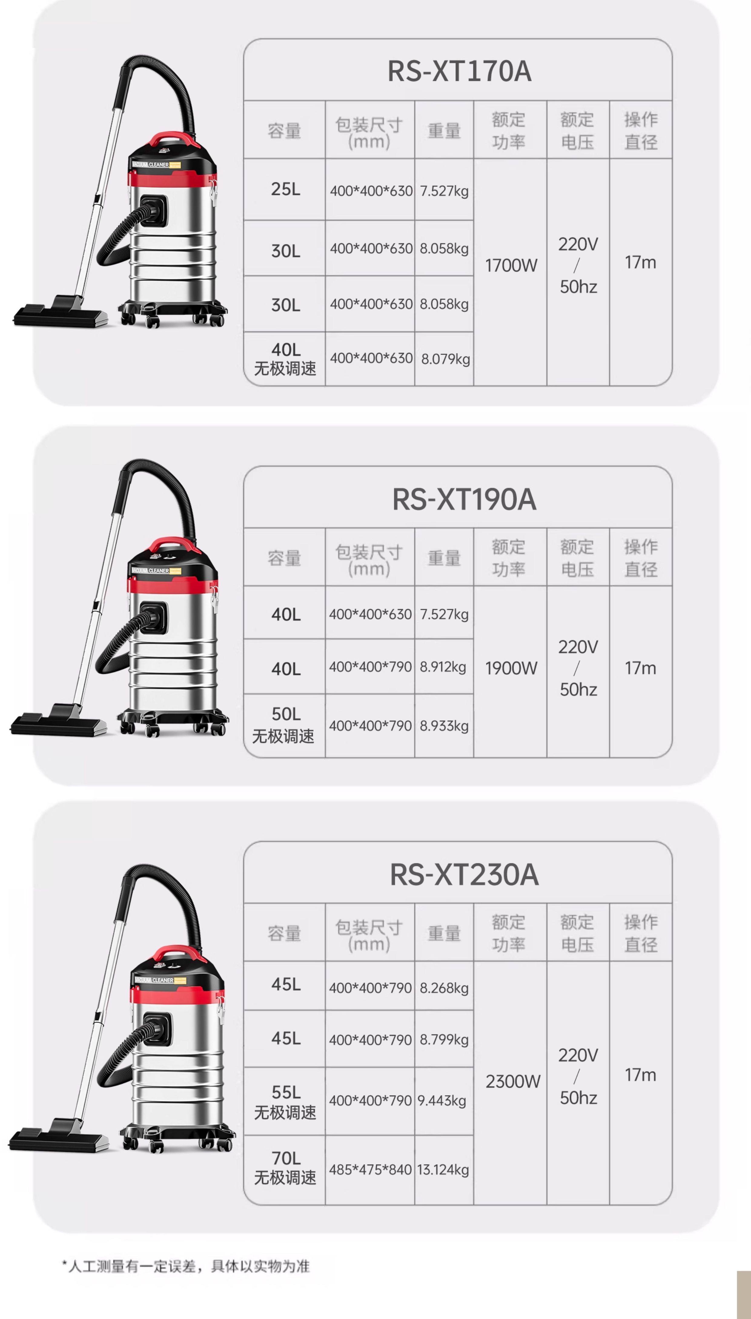 | Color Classification | 25L Basic Package [95000Pa Suction Power + 1.86 Million Rpm Copper Core Motor],30L Metal Barrel [97000Pa Suction + 1.98 Million Rpm Air-Cooled Dual-Core Motor] Household Cleaning Model + Land Reclamation + Sewing + Car Washing,30L Dust Bag Dust Isolation [97000Pa Suction Power + 1.98 Million Rpm Air-Cooled Dual-Core Motor] Land Reclamation and Beautiful Seam Model + Six-Layer Filtration + Land Reclamation + Beautiful Seam + Car Wash,40L Stepless Speed Regulation [97000Pa Suction + 1.98 Million Rpm Air-Cooled Dual-Core Motor] Commercial Car Wash Model + Dual Filter Element Haipa + Six-Layer Filtration + Land Reclamation + Beautiful Seams + Car Wash,40L Metal Barrel [98000Pa Suction Power + 2.1 Million Rpm Air-Cooled Dual-Core Motor] Dual-Purpose Model for Home and Car + Land Reclamation + Sewing + Car Washing + Industry,40L Dust Bag Dust Isolation [98000Pa Suction + 2.1 Million Rpm Air-Cooled Dual-Core Motor] Special Model for Sewing + Six-Layer Filtration + Land Reclamation + Sewing + Car Washing + Industry,50L Stepless Speed Regulation [98000Pa Suction + 2.1 Million Rpm Air-Cooled Dual-Core Motor] Commercial and Hotel Model + Dual Filter Element Haipa + Six-Layer Filtration + Land Reclamation + Beautiful Seams + Car Washing + Industry,45L Metal Barrel [99000Pa Suction + 2.22 Million Rpm Air-Cooled Dual-Core Motor] Special Model for Car Washing + Land Reclamation + Seam Beauty + Car Washing + Industry,45L Dust Bag Dust Isolation [99000Pa Suction + 2.22 Million Rpm Air-Cooled Dual-Core Motor] Decoration and Beauty Seam Model + Six-Layer Filtration + Land Reclamation + Beauty Seam + Car Washing + Industry,55L Stepless Speed Regulation [99000Pa Suction + 2.22 Million Rpm Air-Cooled Dual-Core Motor] Land Reclamation Cleaning Model + Dual Filter Element Haipa + Six-Layer Filtration + Land Reclamation + Beautiful Seam + Car Washing + Industry,70L Stepless Speed Regulation [99000Pa Suction + 2.22 Million Rpm Air-Cooled Dual-Core Motor] Factory Workshop Model + Six-Layer Filtration + Land Reclamation + Beautiful Seams + Car Washing + Industry |