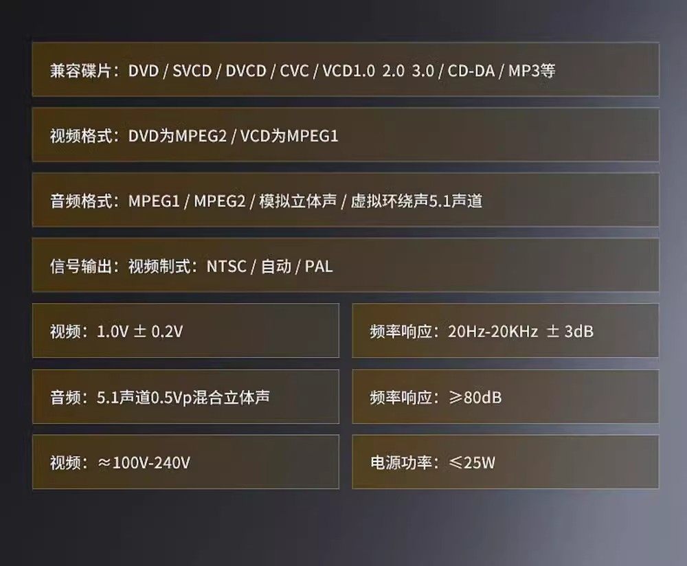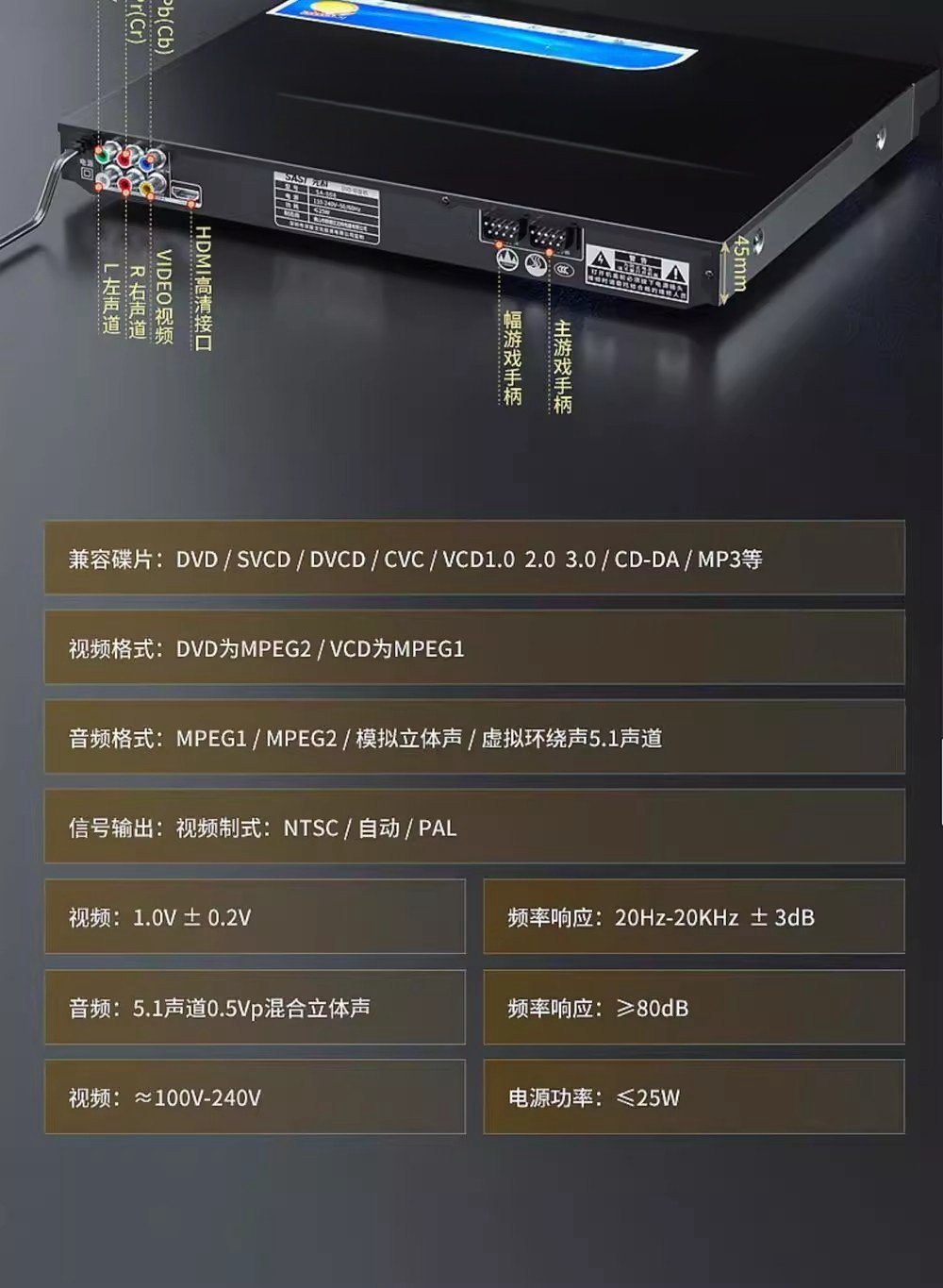 | Playback Format | Mp3 Cd,Cds,Rmvb,Cd–R,Svcds,Mpeg-4,Vcds,Dvds |