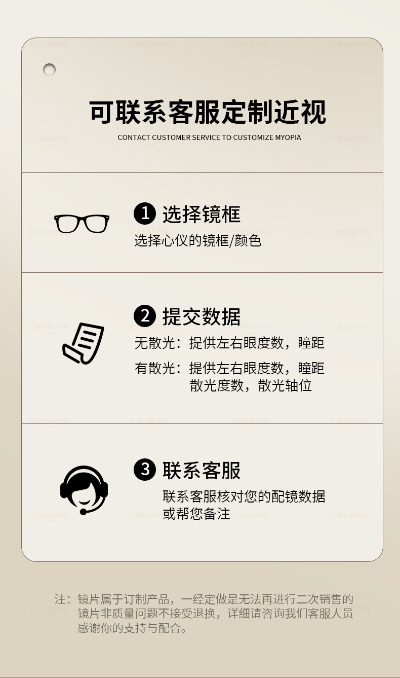 | Lens Refractive Index | Frame + 0-Degree Anti-Blue Light Lenses [Can Be Tried On, Shipping Insurance Included],Frame + Super Tough and Hardened 1.61 Anti-Blue Light Lenses [Myopia + Astigmatism ≤ 400 Degrees],Frame + Super Tough and Hardened 1.67 Anti-Blue Light Lenses [Myopia + Astigmatism ≤ 600 Degrees],Frame + Super Tough and Hardened 1.74 Anti-Blue Light Lenses [Myopia + Astigmatism ≤ 800 Degrees],Frame + Super Tough and Hardened 1.61 Anti-Radiation Lenses [Myopia + Astigmatism ≤ 400 Degrees],Frame + Super Tough and Hardened 1.67 Anti-Radiation Lenses [Myopia + Astigmatism ≤ 600 Degrees],Frame + Super Tough and Hardened 1.74 Anti-Radiation Lenses [Myopia + Astigmatism ≤ 800 Degrees],↓[Photochromic Lenses]↓Sun Protection and Uv Protection↓,With [Grey/Tea] 1.61 Anti-Blue Light and Ultraviolet Rays [Myopia + Astigmatism ≤ 400 Degrees],With [Grey/Tea] 1.67 Anti-Blue Light and Ultraviolet Rays [Myopia + Astigmatism ≤ 600 Degrees],↓[German Zeiss Series]↓Protect Your Vision, Lens Packaging Will Be Sent with You↓,Equipped with [Zeiss Special] 1.60 Aspherical [Myopia + Astigmatism ≤ 400 Degrees],Equipped with [Zeiss Special] 1.67 Aspheric [Myopia + Astigmatism ≤ 600 Degrees],Equipped with [Zeiss Vision] 1.60 Anti-Blue Light [Myopia + Astigmatism ≤ 400 Degrees],Equipped with [Zeiss Vision] 1.67 Anti-Blue Light [Myopia + Astigmatism ≤ 600 Degrees] |