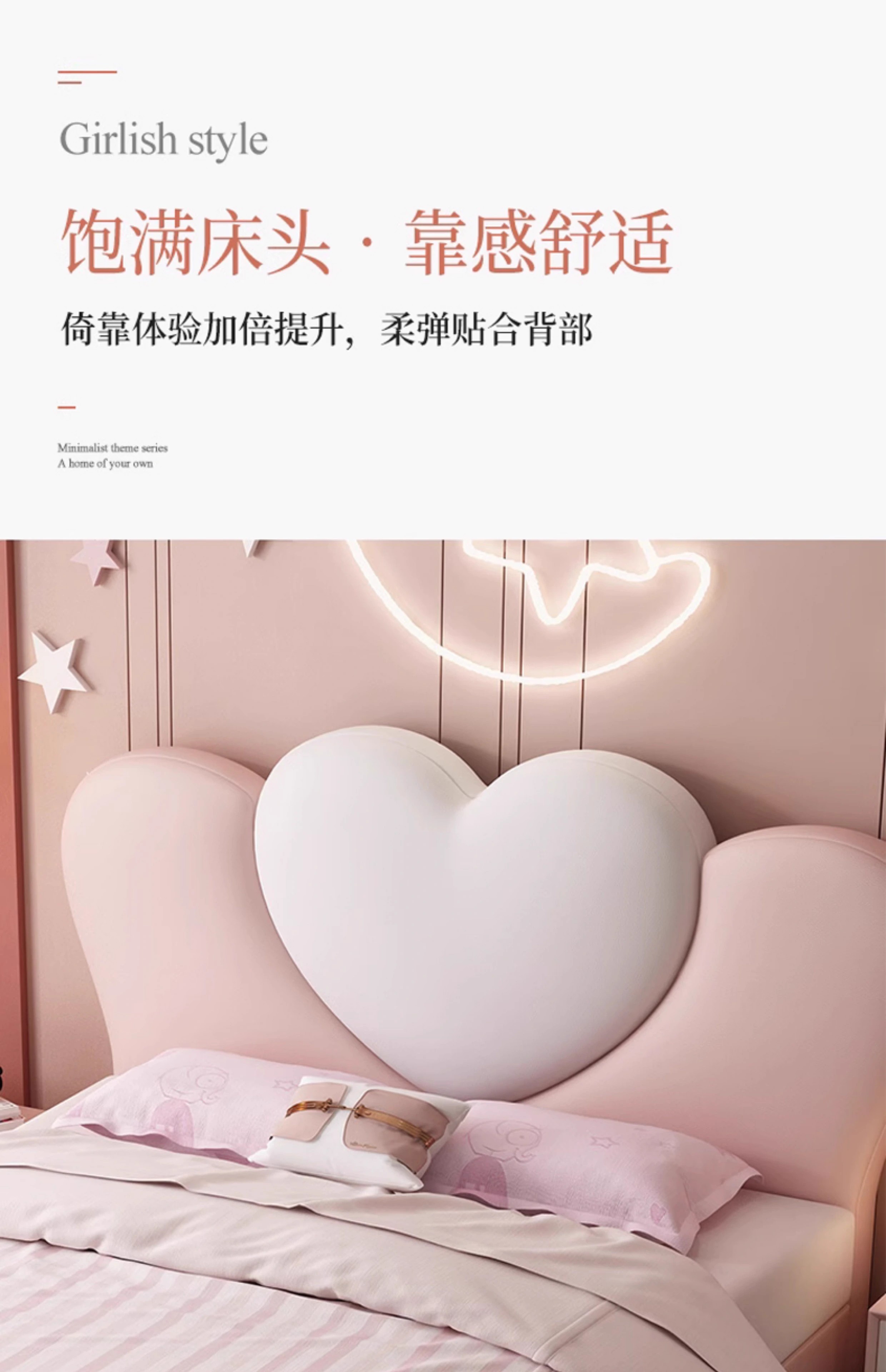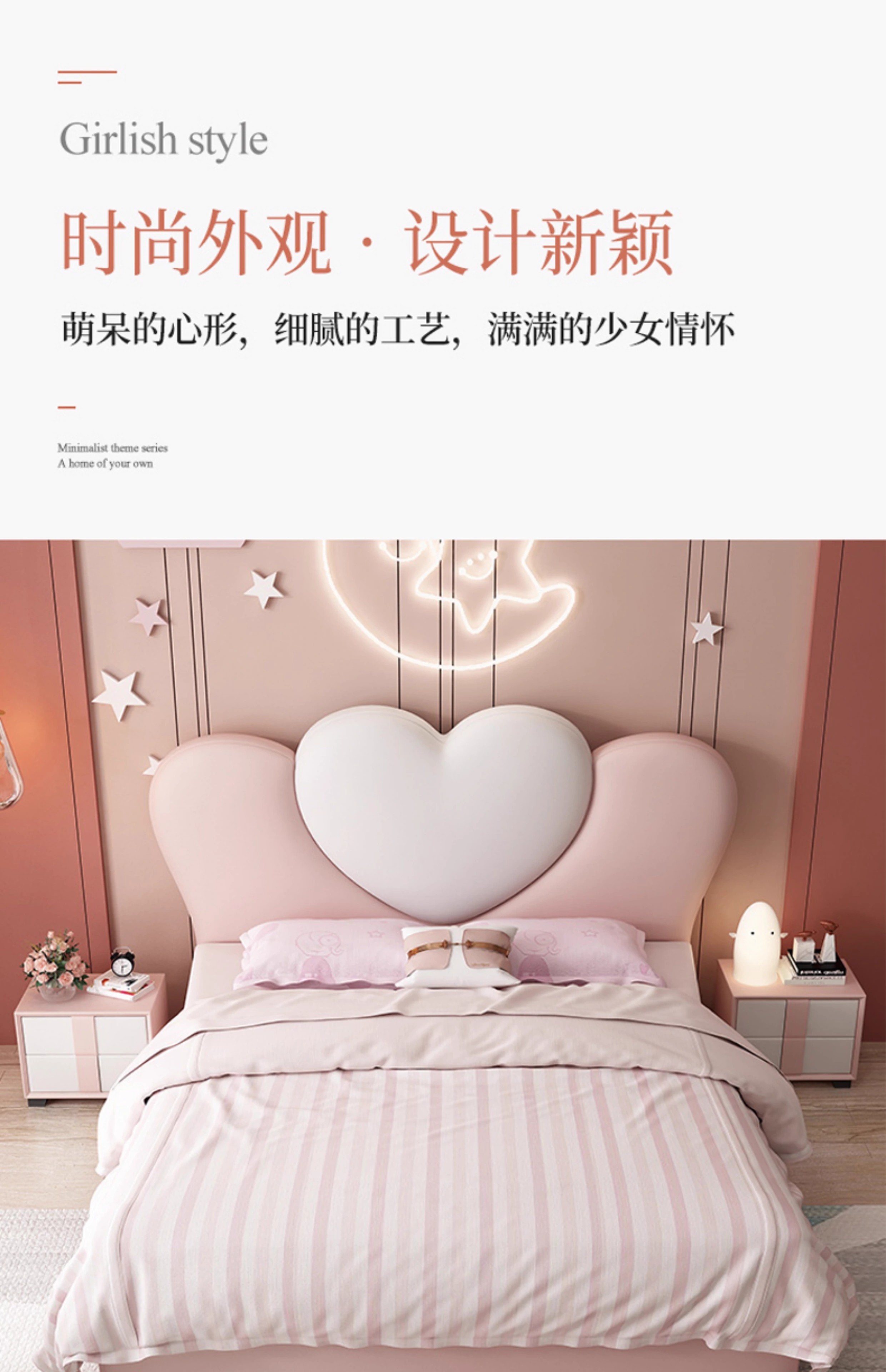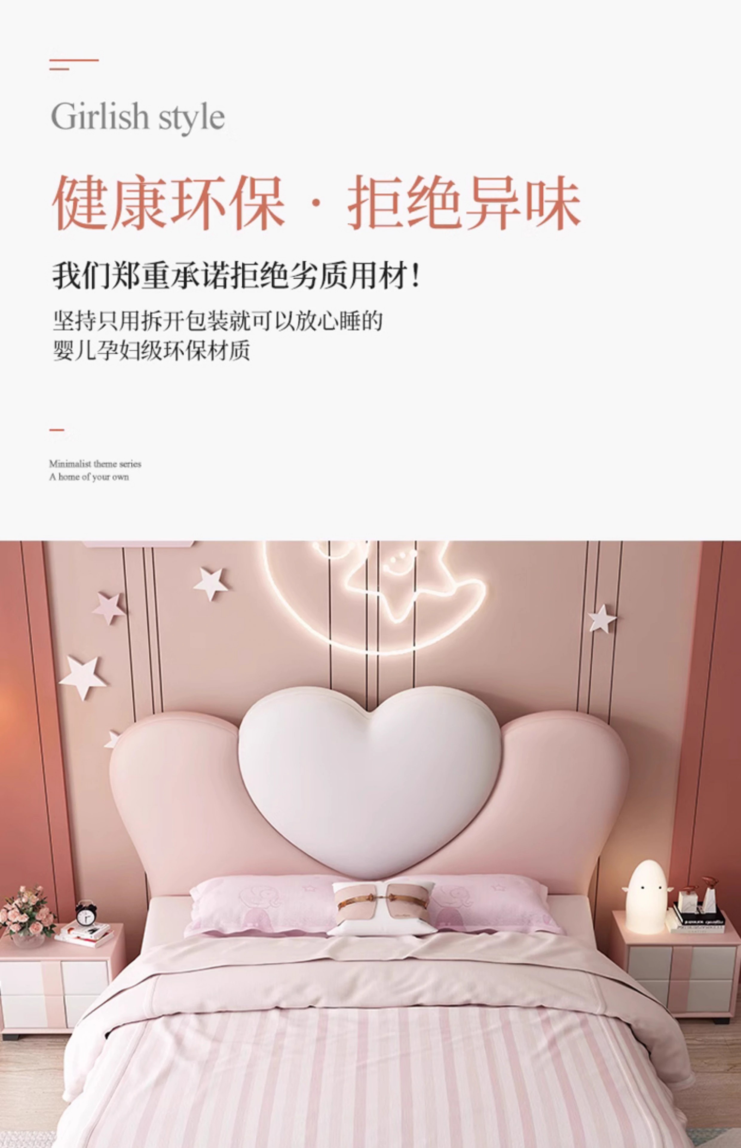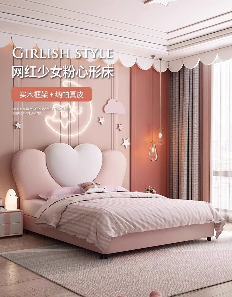 Princess Bed for Girls, Pink Bed, Modern and Simple, Creative Internet-Famous Children's Bed for Girls' Bedrooms, Heart-Shaped Solid Wood Bed