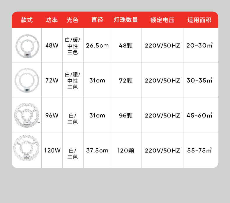 | Color Classification | 36inch Models-48W-White Light 6000K Diameter 26.5cm,36inch Models-48W-Neutral 4500K Diameter 26.5cm,36inch Models-48W-Warm Light 3000K Diameter 26.5cm,36inch Models-48W-Three-Color Dimming, Diameter 26.5cm,36/ 42inch Model-72W-White Light 6000K Diameter 31cm,36/ 42inch Models-72W-Neutral 4500K Diameter 31cm,36/ 42inch Models-72W-Warm Light 3000K Diameter 31cm,36/ 42inch Models-72W-Three-Color Dimming, Diameter 31cm,42/ 48inch Model-96W-White Light 6000K Diameter 31cm,42/ 48inch Models-96W-Three-Color Dimming, Diameter 31cm,48/ 52inch Models-120W-White Light 6000K Diameter 37.5cm,48/ 52inch Models-120W-Three-Color Dimming Diameter 37.5cm |