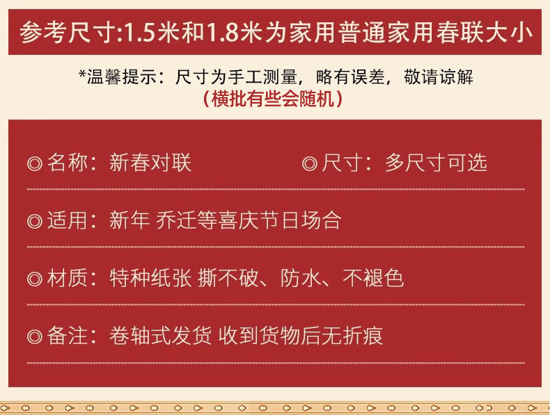 | Color Classification | Good Luck in the New Year - 1m [Comes with Adhesive Backing - No Residue When Removed],Five Blessings Come to Your Door - 1m [Comes with Adhesive Backing - No Residue When Removed],Lucky Star Shines Brightly - 1m [Comes with Adhesive Backing - No Residue When Removed],Welcome the Spring Festival and Receive Blessings - 1m [Comes with Adhesive Backing - No Residue When Removed],Welcome the Spring Festival and Receive Blessings - 1.2m [Comes with Adhesive Backing - No Residue When Removed],Five Blessings Come to Your Door - 1.2m [Comes with Adhesive Backing - No Residue When Removed],Good Luck in the New Year - 1.2m [Comes with Adhesive Backing - No Residue When Removed],Smooth Sailing - 1.2m [Comes with Adhesive Backing - No Residue When Removed],All the Best - 1.2m [Comes with Adhesive Backing - No Residue When Removed],Safe Entry and Exit - 1.2m [Comes with Adhesive Backing - No Residue When Removed],Lucky Star Shines Brightly - 1.2m [Comes with Adhesive Backing - No Residue When Removed],Family Fun - 1.2m [Comes with Adhesive Backing - No Residue When Removed],Auspicious Year of the Horse - 1.2m (Flannel) [Comes with Adhesive Backing - No Residue When Removed],Welcome the Spring Festival and Receive Blessings - 1.5m [Comes with Adhesive Backing - No Residue When Removed],Good Luck and Good Luck - 1.5m .[Comes with Adhesive Backing - No Residue When Removed],Smooth Sailing - 1.5m [Comes with Adhesive Backing - No Residue When Removed],May All Your Wishes Come True - 1.5m [Comes with Adhesive Backing - No Residue When Removed],Safe Entry and Exit - 1.5m [Comes with Adhesive Backing - No Residue When Removed],Good Luck in the New Year - 1.5m [Comes with Adhesive Backing - No Residue When Removed],Five Blessings Come to Your Door - 1.5m [Comes with Adhesive Backing - No Residue When Removed],Good Luck in the New Year - 1.8m [Comes with Adhesive Backing - No Residue When Removed],Smooth Sailing 1.8m [Comes with Adhesive Backing - No Residue When Removed],Smooth Sailing - 1.8m [Comes with Adhesive Backing - No Residue When Removed],All the Best - 1.8m [Comes with Adhesive Backing - No Residue When Removed],Safe Entry and Exit - 1.8m [Comes with Adhesive Backing - No Residue Left after Removal],Five Blessings Come to Your Door - 1.8m [Comes with Adhesive Backing - No Residue When Removed],Welcome the Spring Festival and Receive Blessings - 1.8m [Comes with Adhesive Backing - No Residue When Removed],May All Your Wishes Come True - 1.8m [Comes with Adhesive Backing - No Residue When Removed],Smooth Sailing - 2m [Comes with Adhesive Backing - No Residue When Removed],Safe Entry and Exit - 2m [Comes with Adhesive Backing - No Residue Left after Removal],Business Is Booming - 2m [Comes with Adhesive Backing - No Residue When Removed],All the Best - 2m [Comes with Adhesive Backing - No Residue When Removed],May All Your Wishes Come True - 2m [Comes with Adhesive Backing - No Residue When Removed],Wide Source of Funds - 2m [Comes with Adhesive Backing - No Residue When Removed],2 Pieces of Blessing - [Comes with Adhesive Backing],Hunchun 6-Piece Mixed Pack-[Comes with Adhesive Backing] |