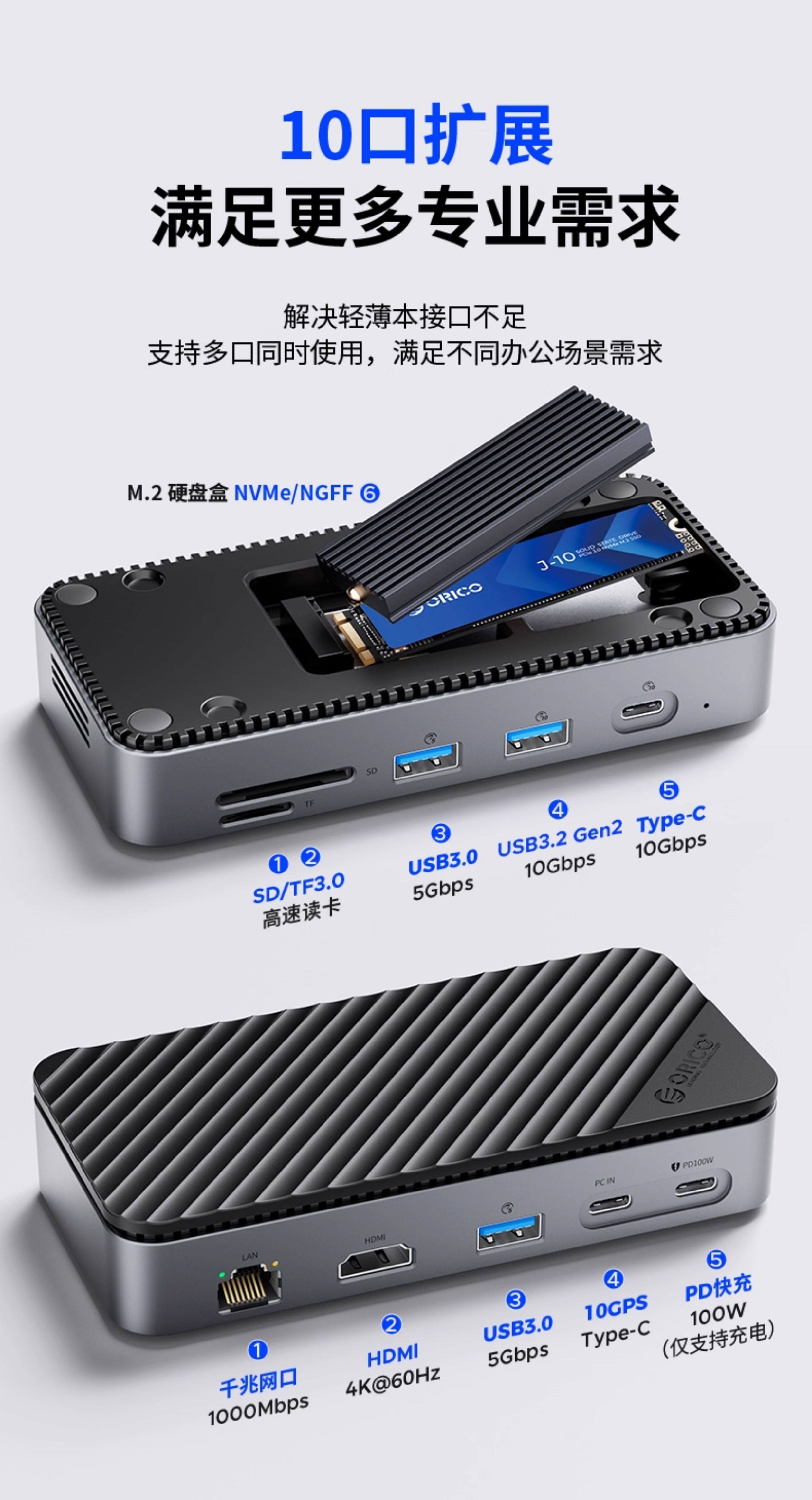 Orrick M2 Solid-State Drive Enclosure Docking Station Desktop Expansion Dock Type-C Splitter Usb3.2 Compatible with MacBook Apple Laptop Macmini with Network Port Adapter HDMI